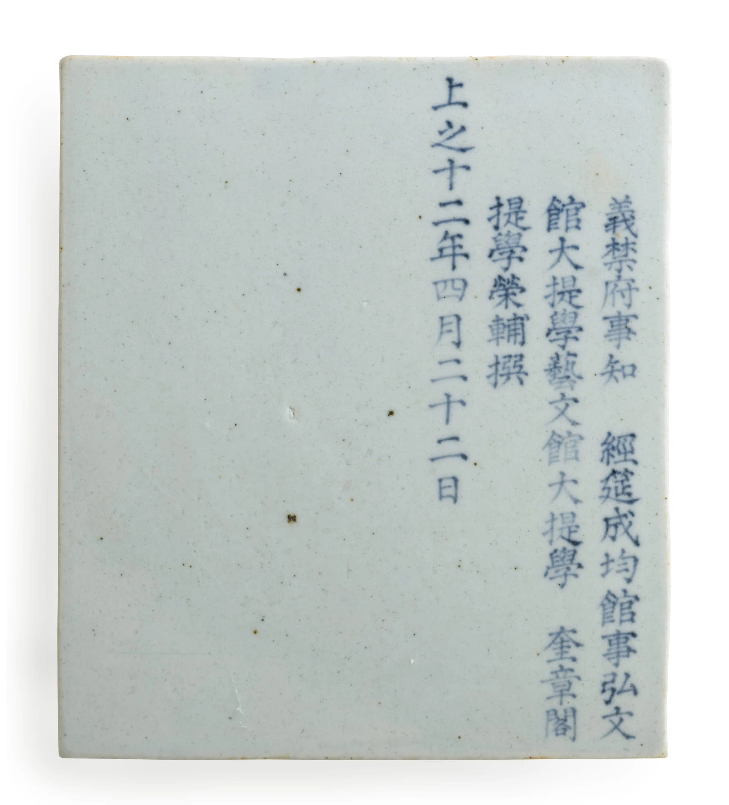 - Slab-built porcelain with underglaze blue painted decoration and clear glaze