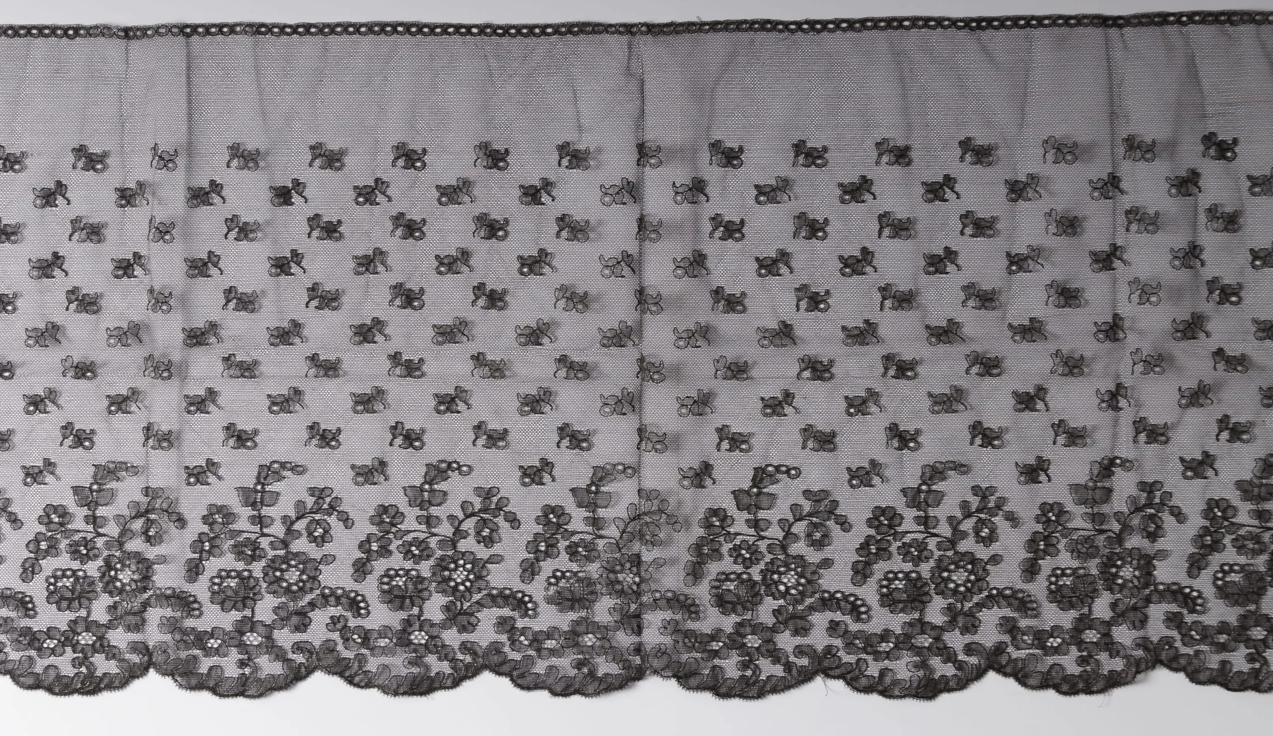 Horizontal strip of black lace with allover scattered floral motifs, a dense botanical border, and a scalloped lower edge, displayed flat on a white surface