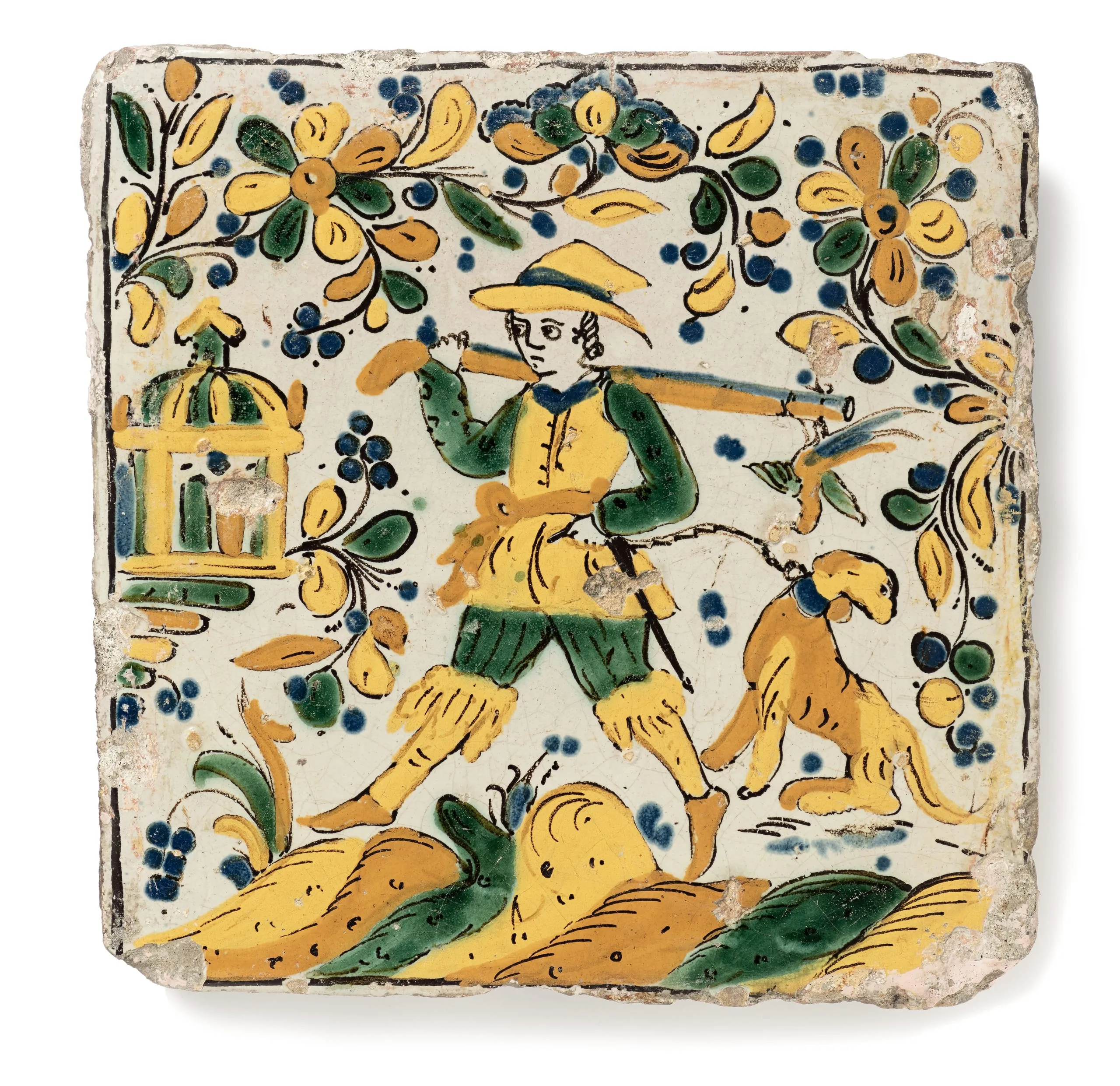 In the sixteenth and seventeenth centuries, the Mexican city of Puebla became a production center for fine earthenware and tiles later known as “Talavera poblana.” The earliest Puebla majolica (tin-glazed earthenware) shows Spanish and Hispano-Islamic influences. However, Puebla is best known for the Chinese-inspired blue-and-white majolica it began producing in the second quarter of the seventeenth century, which remained popular throughout the eighteenth century. This tile is a rare example of Abó polychrome, a style identified by the use of yellow, orange, ochre, and blue outlined in manganese. Tiles like this were used to decorate the exterior and interior of buildings and often depict trades (artes y oficios).