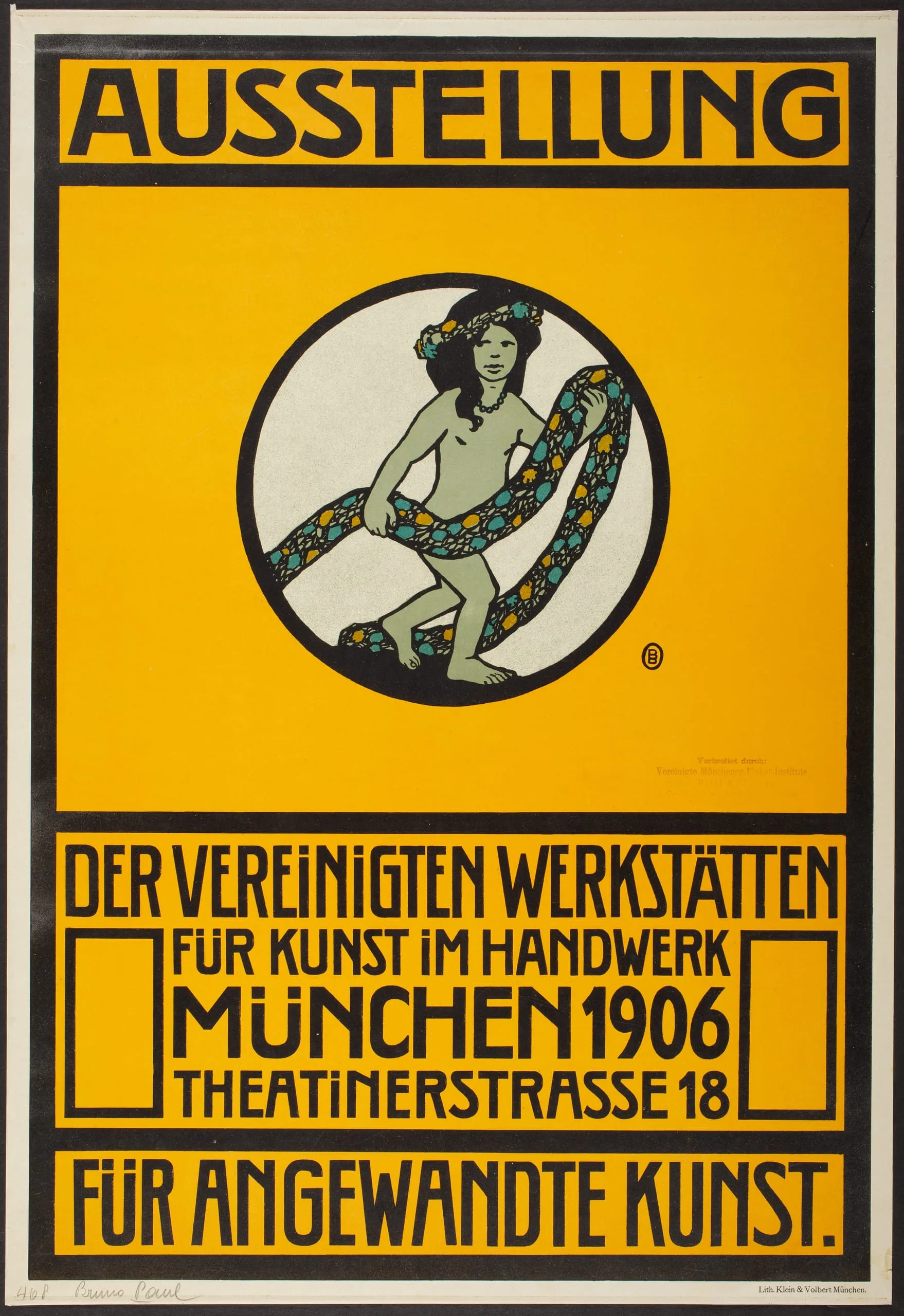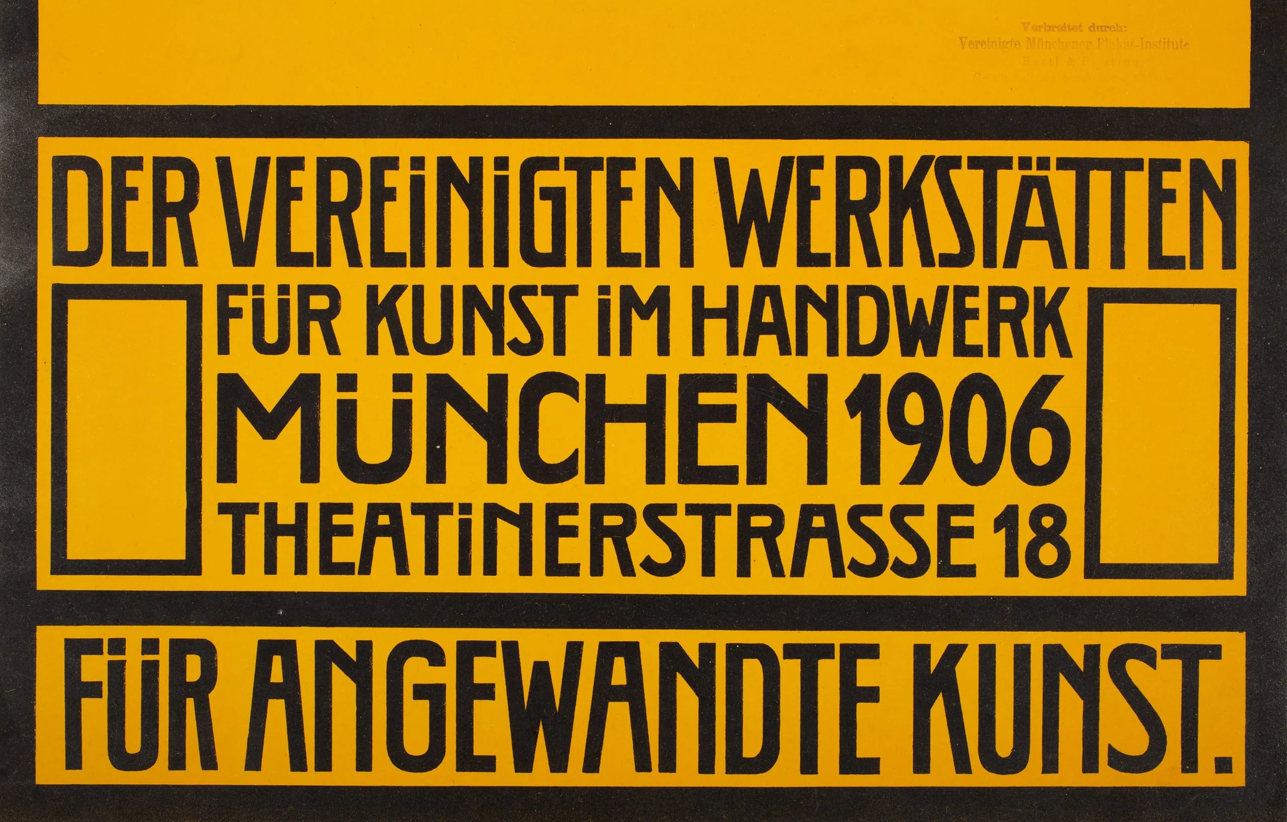 Bruno Paul joined the Vereinigte Werkstätten within its first year and quickly became one of its most acclaimed talents. The prolific designer embodied the gesamtkunstwerk ideal, creating everything from furniture and interiors to metalwork and graphics. He designed posters for several of the workshop’s exhibitions. By 1904, he had shifted from the Jugendstil aesthetic of his earliest graphics towards more nationalistic and historical imagery, echoing larger trends in German design and culture.