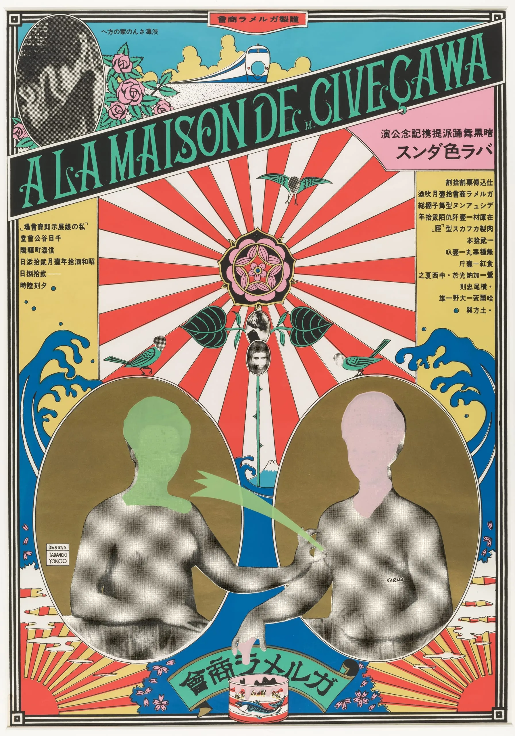 Rose-colored Dance: To M. Shibusawa’s House (À La Maison De M. Civeçawa) exemplifies the irreverent symbolism and manic energy that distinguished Yokoo’s early work. The poster announces a performance of the darkly erotic Rose-Colored Dance by pioneering choreographer Tatsumi Hijikata. The dance’s title references Tatshujiko Shibusawa, a Japanese scholar known for his translations of French works, especially those by the Marquis de Sade ("M. Civeçawa" has been described as an "archaic transliteration" of Shibusawa). Yokoo captured the blurring of Japan and Europe, as well as the unabashed sexuality of Hijikata and Shibusawa’s work. His design incorporates the famous and often appropriated figures from the anonymous French painting Gabrielle d’Estrees and One of Her Sisters (1594), transferring them from their original bathroom to ovals reminiscent of portraits of Japanese royalty. He heightened the provocative pose of the original painting – one nude woman pinching the other’s nipple – with the cheeky embellishment of squirting green milk.