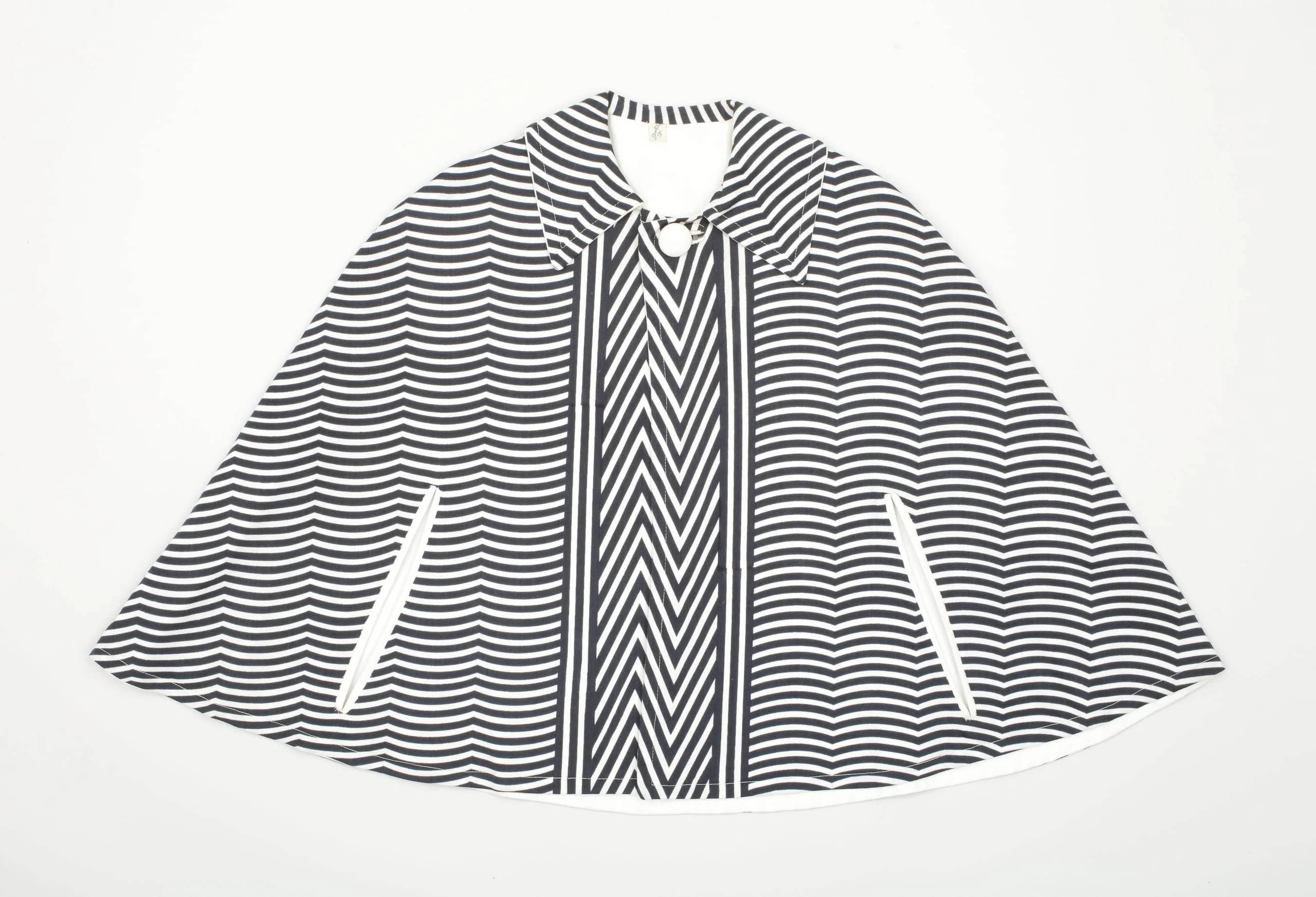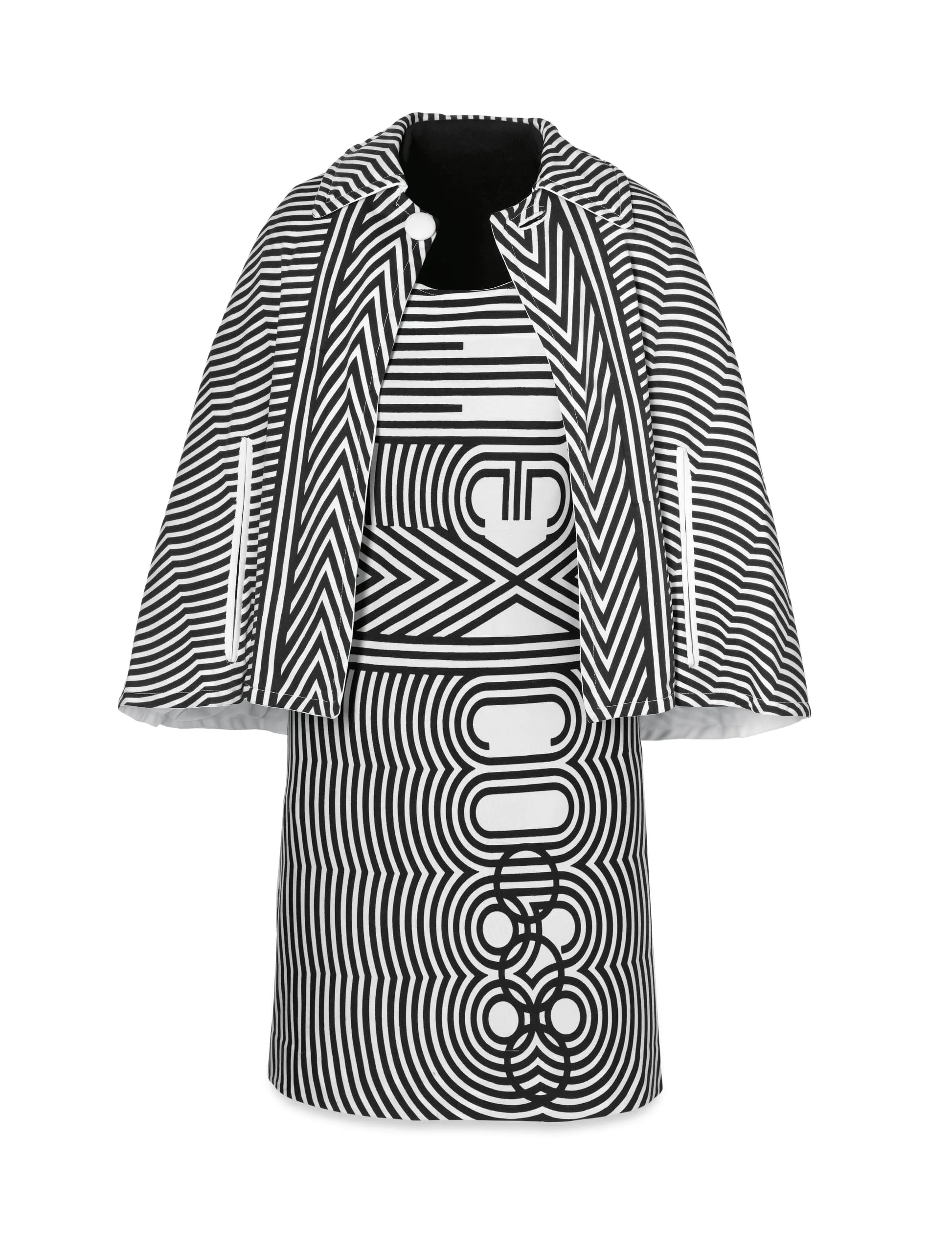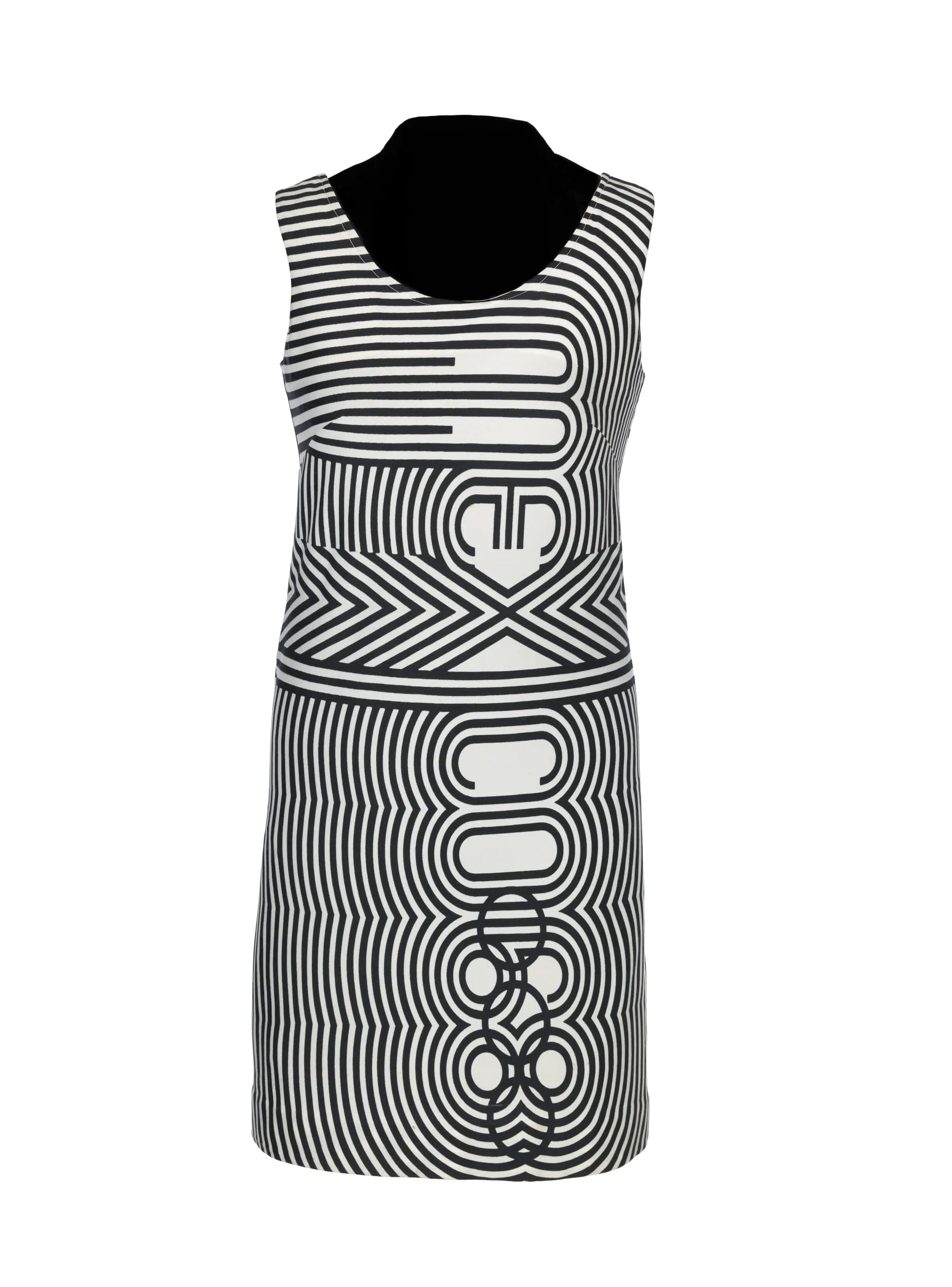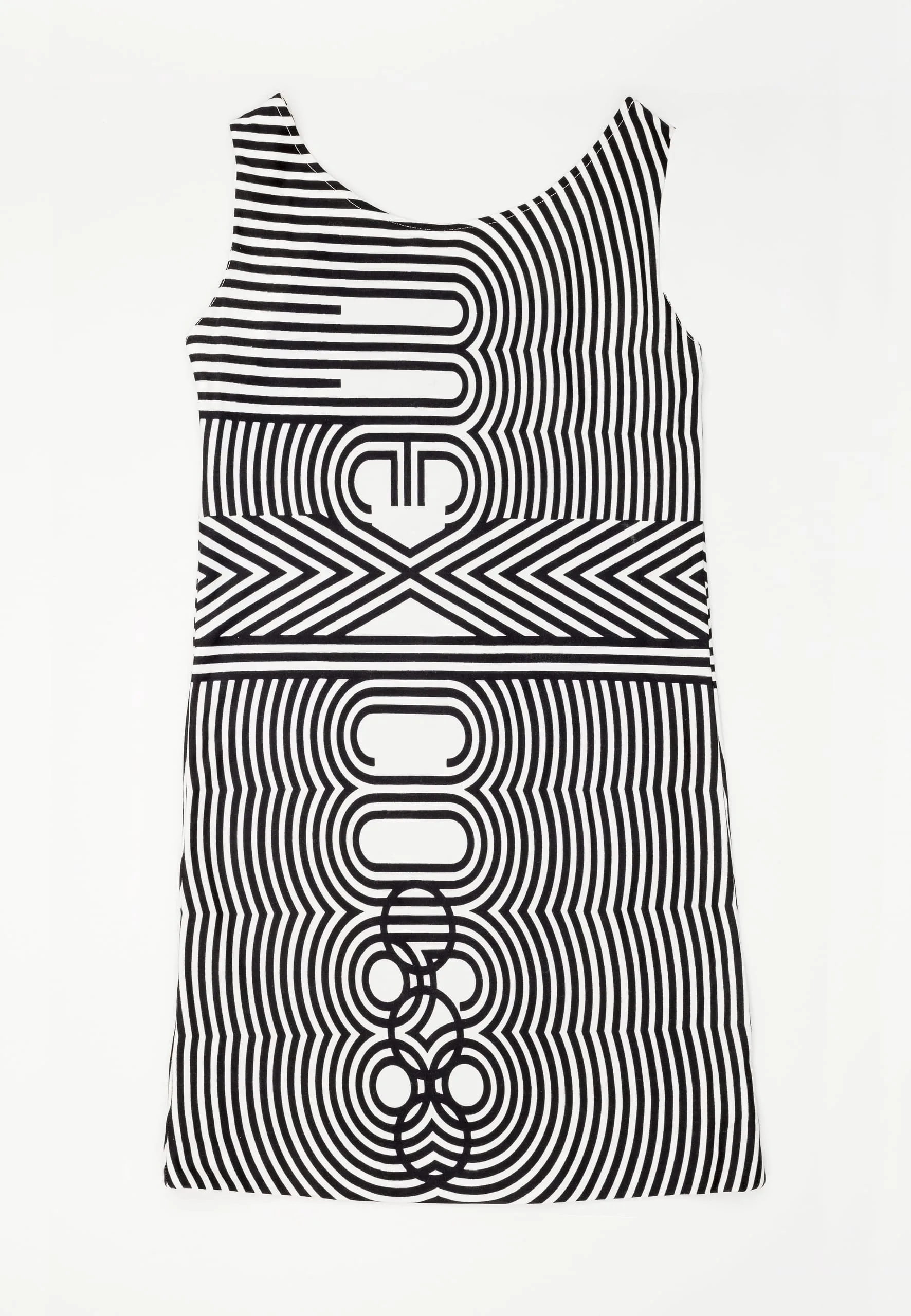 Wyman’s logotype appeared in many forms throughout the Mexico ’68 visual program, including on this edecán (hostess) dress designed by Julia Johnson-Marshall (later Julia Murdoch). The dress was worn over a white shirt with the option of adding the cape. The uniforms were color coded—here, the black signifies that the wearer worked for the National Olympics Committee, as opposed to the rosa mexicano (Mexico’s emblematic hot pink) worn by the pages of the International Olympics Committee. The Mexico ‘68 logotype is turned vertically and placed at the center of the dress, running from nearly the neckline to the hem. It then expands into a series of evenly spaced lines, creating an all-encompassing pattern with the logo at its core.