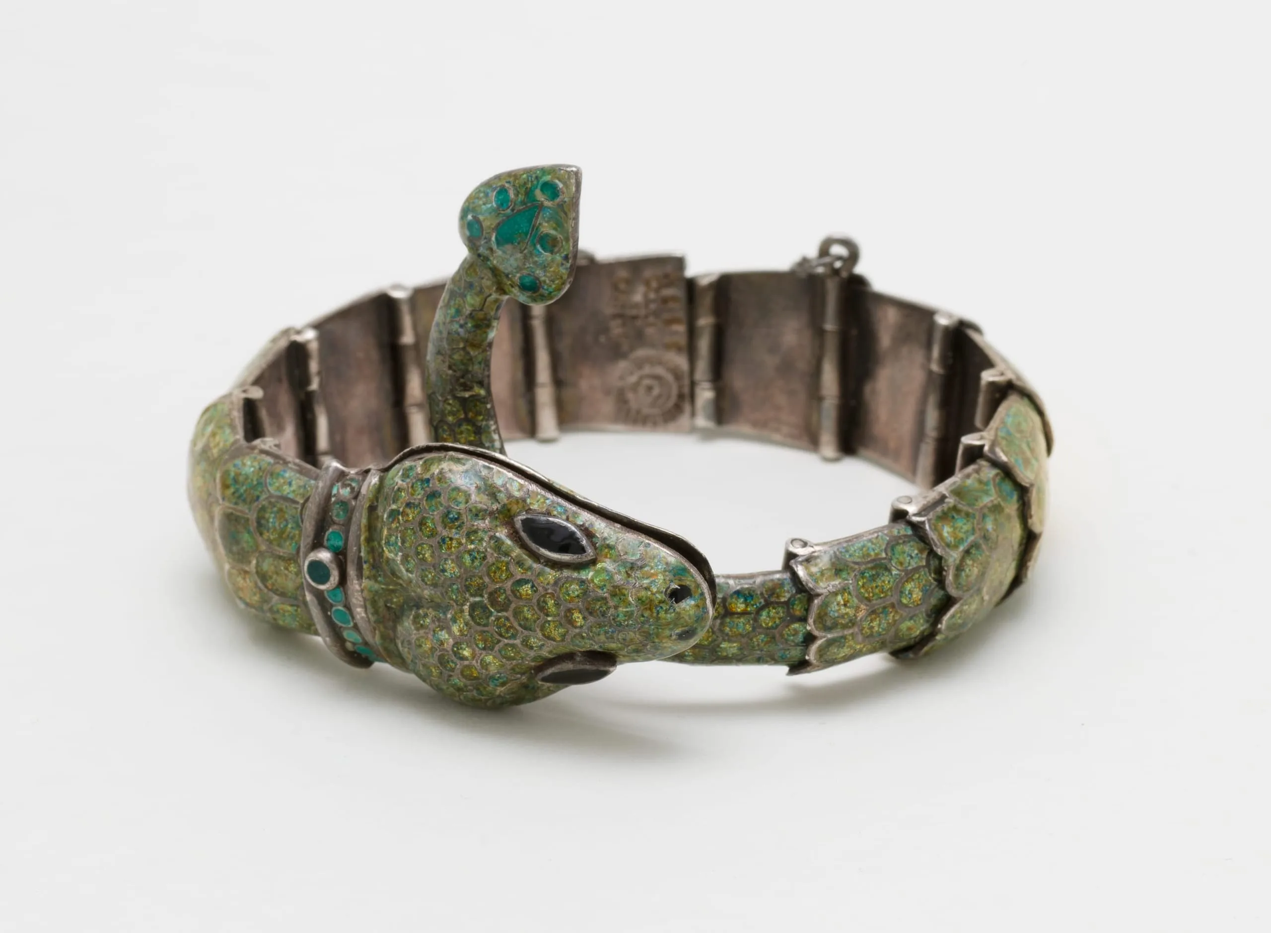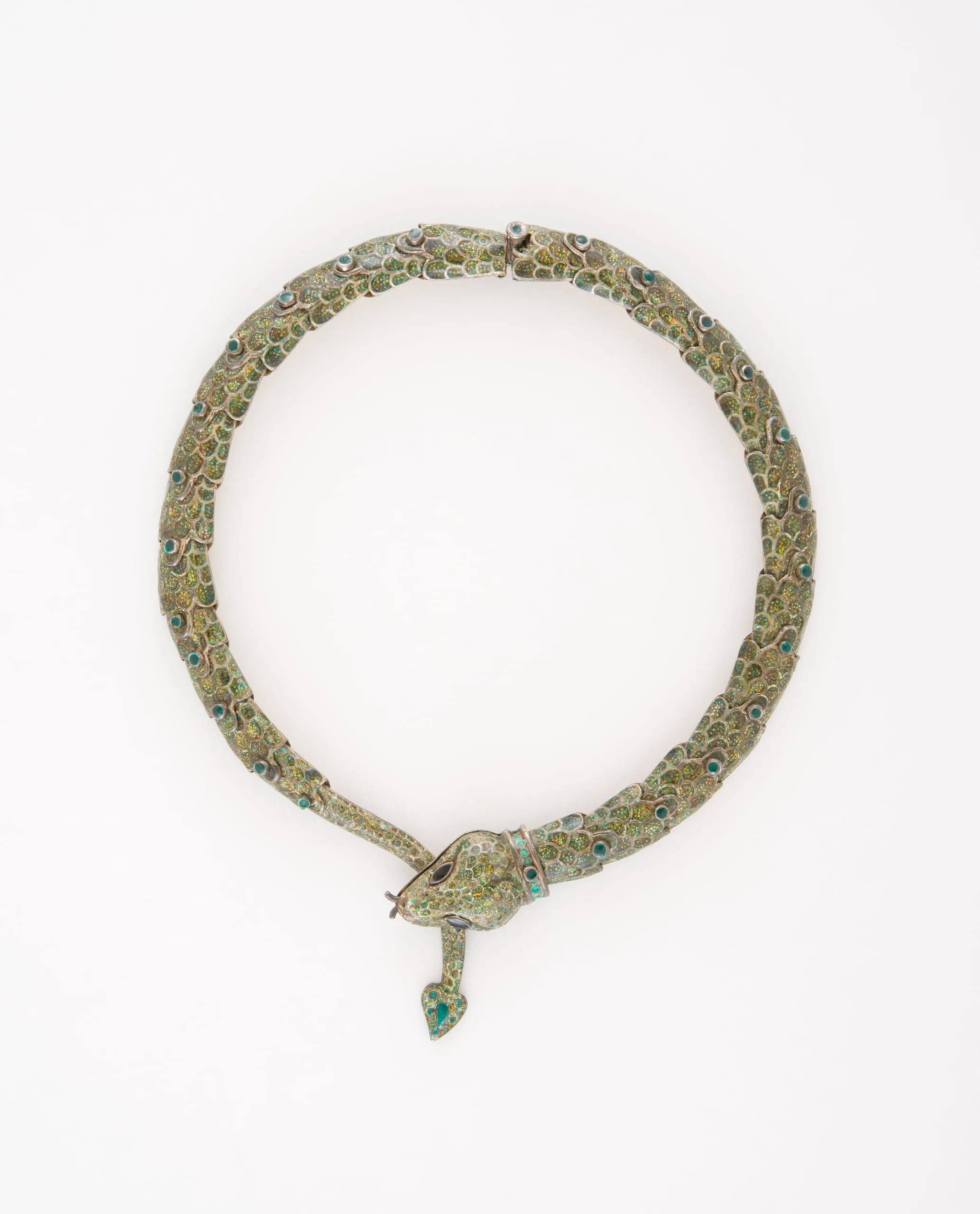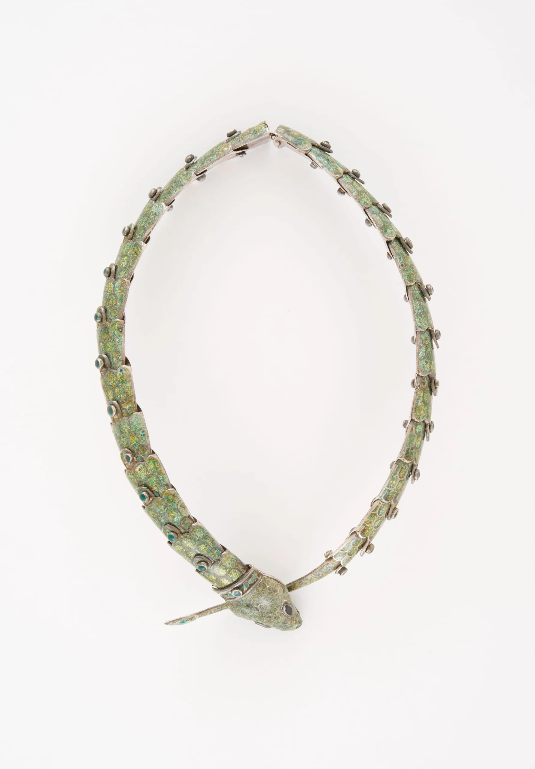 - a) Necklace: 15 3/4 × 1 1/2 in. (40.01 × 3.81 cm); b) Bracelet: 6 3/4 × 5/8 × 3 in. (17.15 × 1.59 cm); Bracelet diameter (closed): 3 in. (7.62 cm); c) Belt with snake length: 14 in. (35.56 cm); Belt with snake diameter (closed): 57 1/4 in. (18.42 cm); d) Belt extension length: 17 in. (43.18 cm)