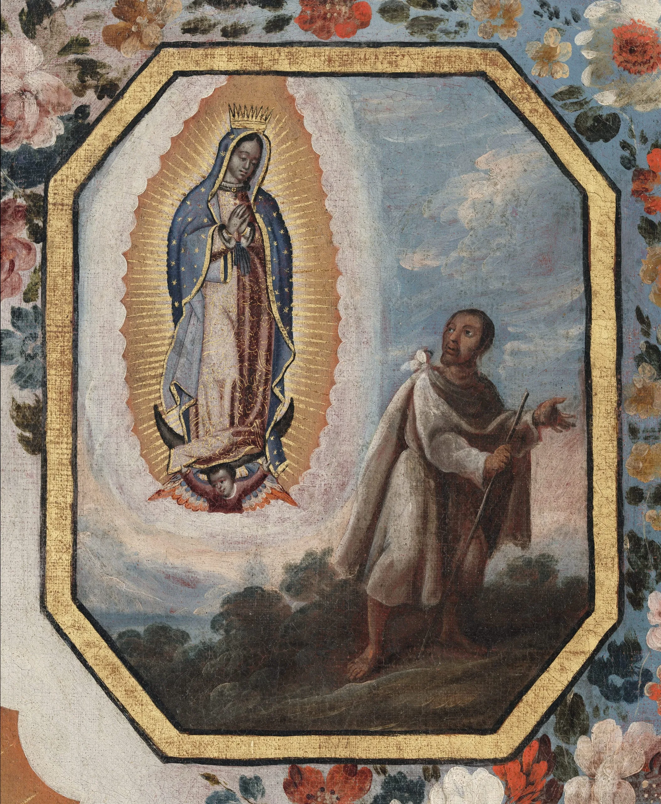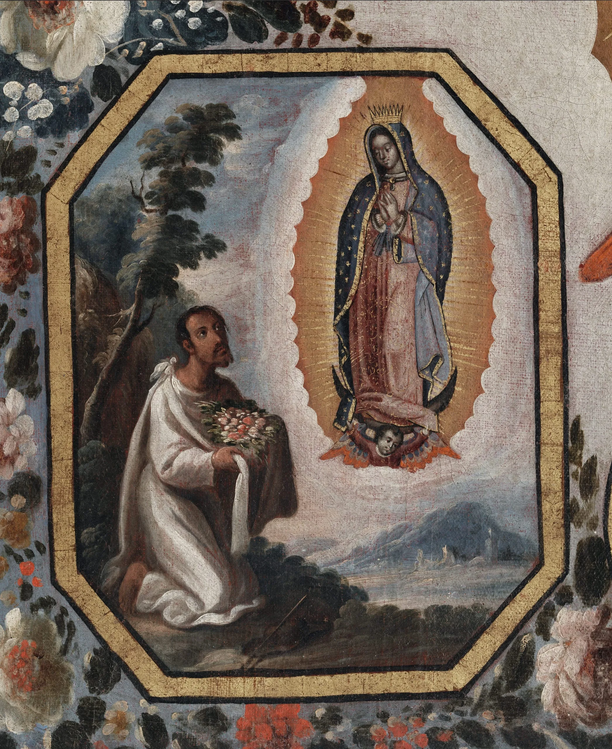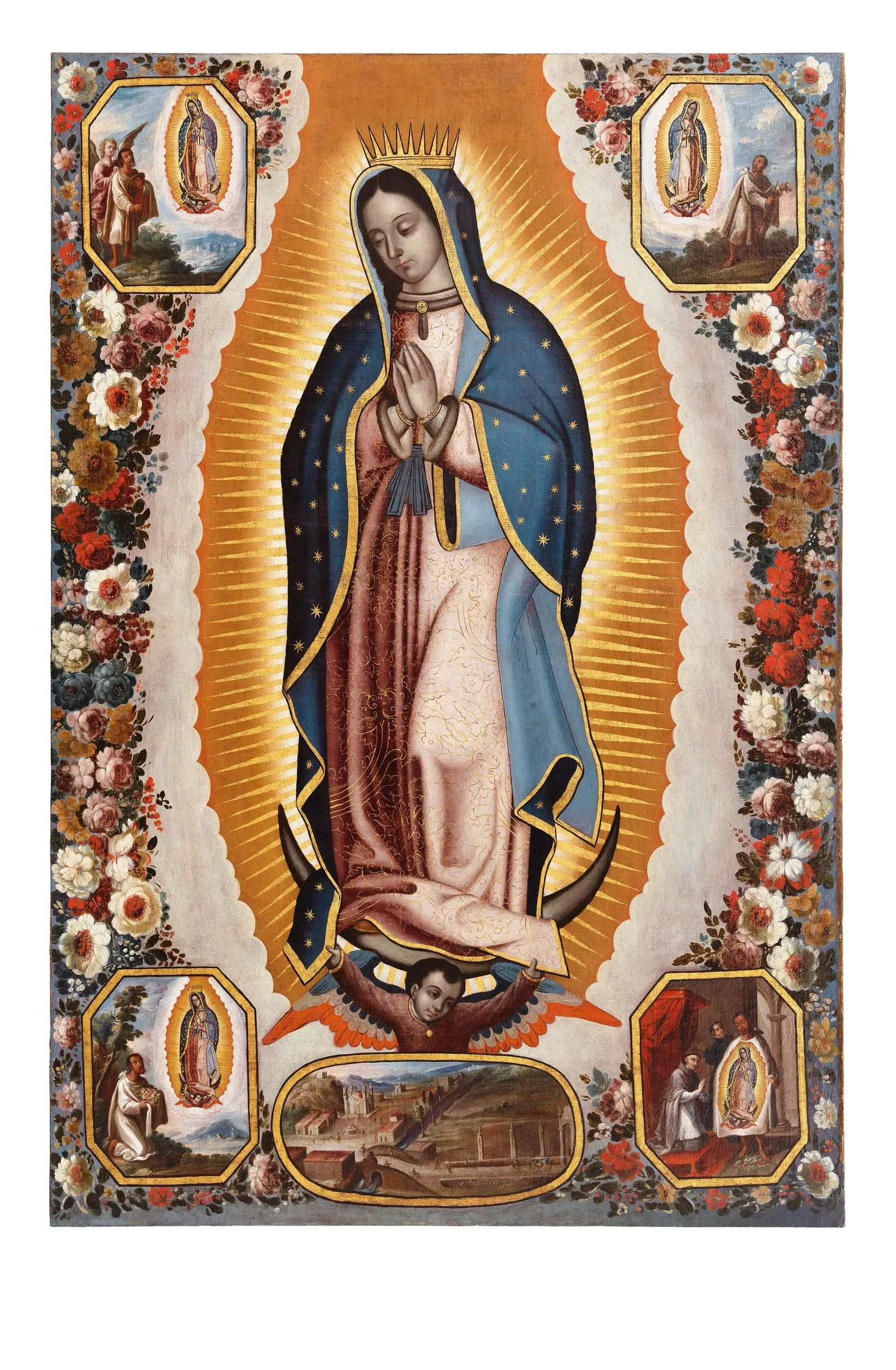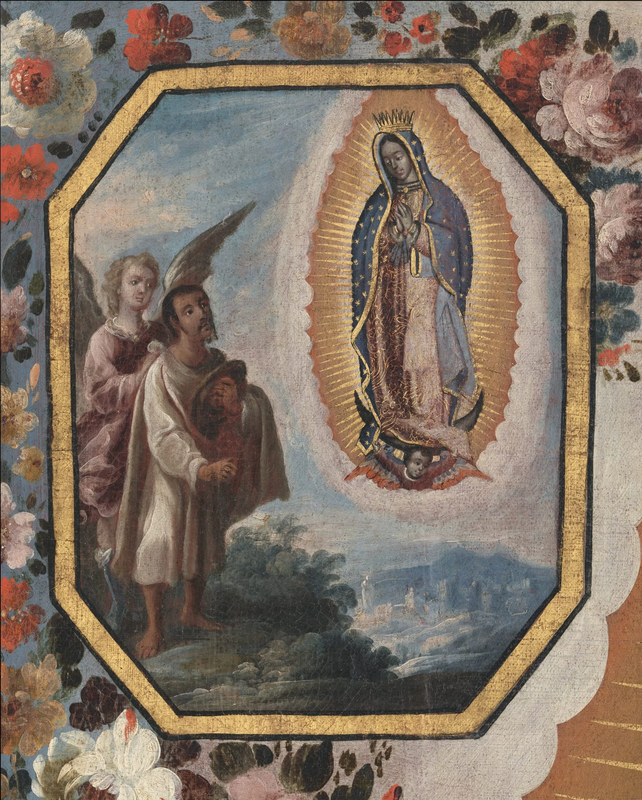 Legend has it that in 1531, the Virgin appeared to the Indian Juan Diego and asked him to visit Bishop Juan de Zumárraga so he could build her a chapel at the hill of Tepeyac, north of Mexico City. At first, the bishop refused to believe Juan Diego, until he unfolded his cloak filled with extraordinary flowers, revealing the miraculously imprinted image of the Virgin. Although the cult of the Virgin of Guadalupe goes back to the second half of the sixteenth century, her tradition was fixed a century later. In this version by Antonio de Torres, one of the best painters of the early eighteenth century in Mexico, the Virgin is depicted surrounded by four roundels illustrating her various apparitions to Juan Diego. The larger roundel at her feet depicts her new sanctuary (completed in 1709) at the hill of Tepeyac.