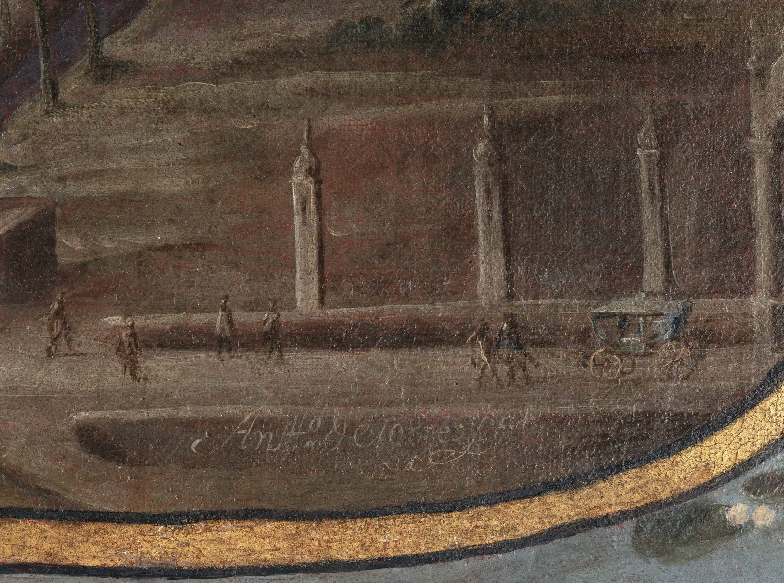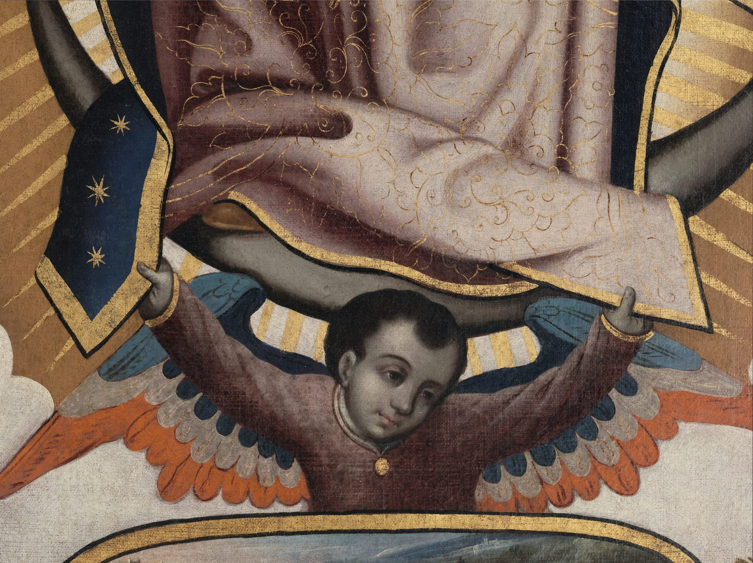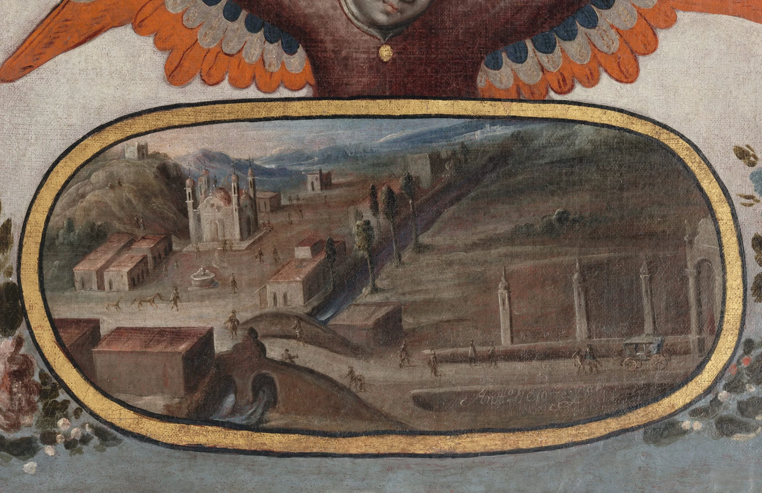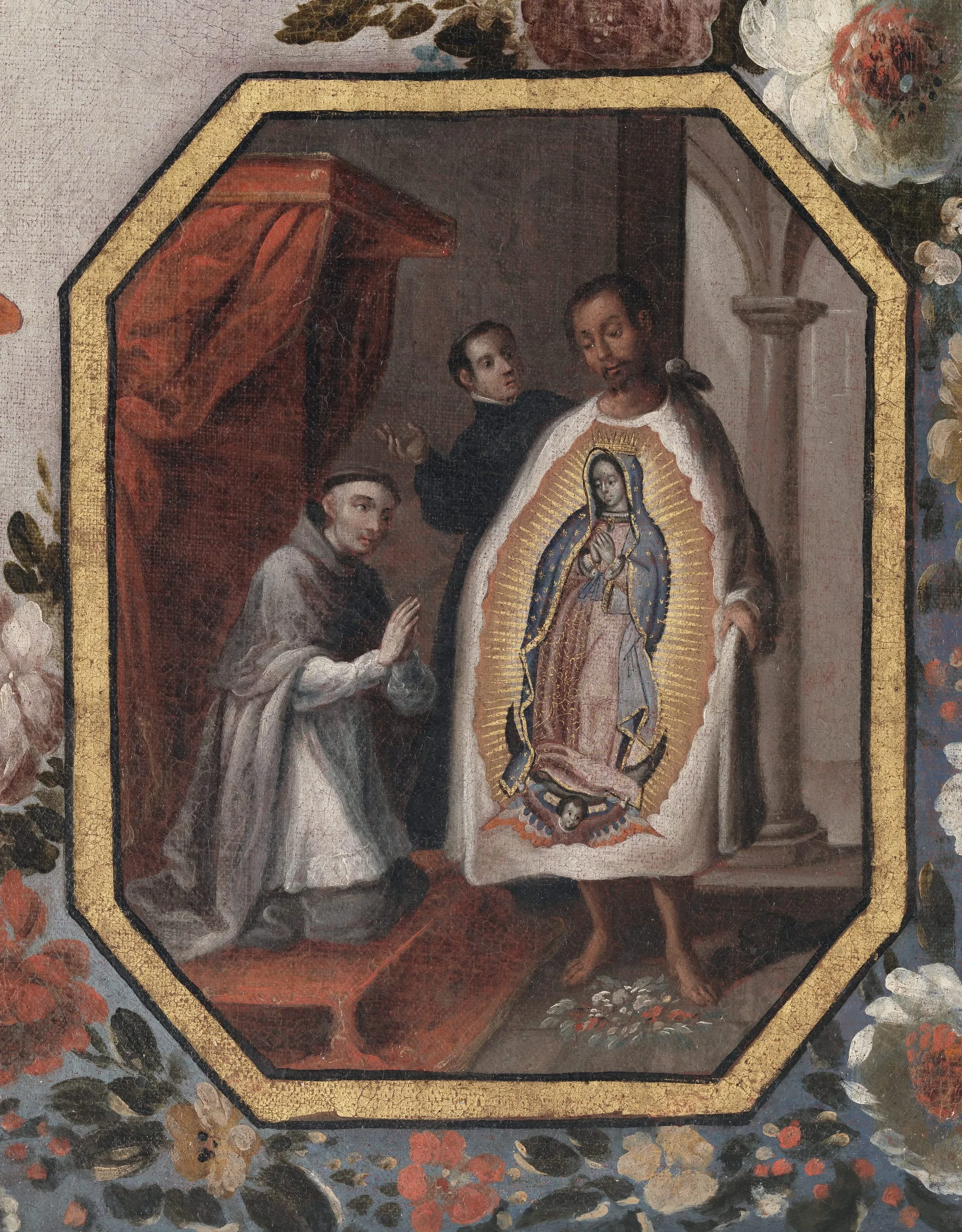 Legend has it that in 1531, the Virgin appeared to the Indian Juan Diego and asked him to visit Bishop Juan de Zumárraga so he could build her a chapel at the hill of Tepeyac, north of Mexico City. At first, the bishop refused to believe Juan Diego, until he unfolded his cloak filled with extraordinary flowers, revealing the miraculously imprinted image of the Virgin. Although the cult of the Virgin of Guadalupe goes back to the second half of the sixteenth century, her tradition was fixed a century later. In this version by Antonio de Torres, one of the best painters of the early eighteenth century in Mexico, the Virgin is depicted surrounded by four roundels illustrating her various apparitions to Juan Diego. The larger roundel at her feet depicts her new sanctuary (completed in 1709) at the hill of Tepeyac.