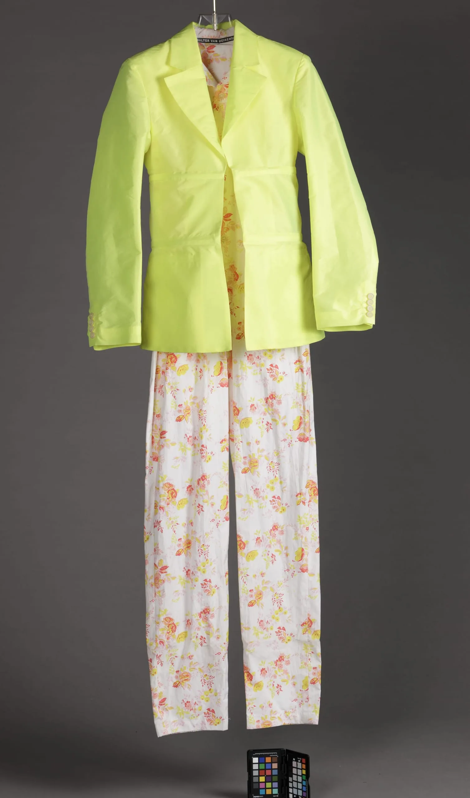 - Jacket: nylon plain weave; Jumpsuit: cotton plain weave, printed; Face mask: acrylic yarn, crocheted; Shoes: leather
