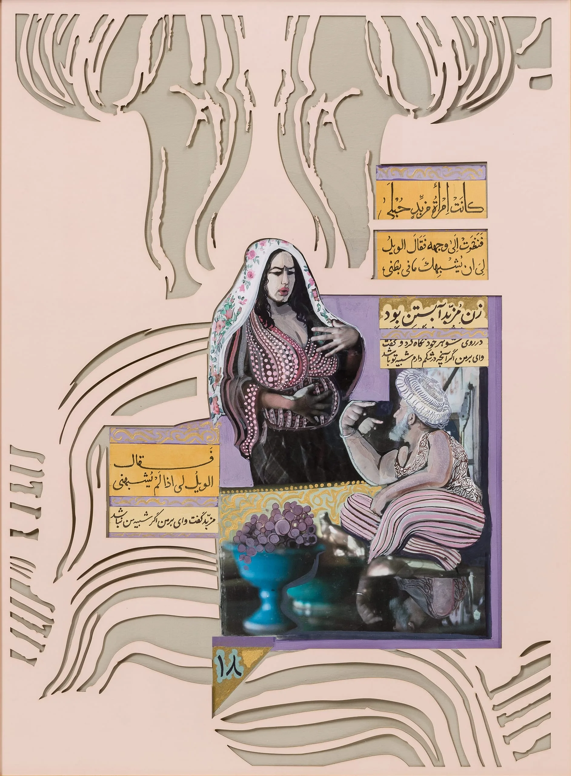 Persian miniature paintings were made to illustrate manuscripts that were often later dismantled and dispersed to satisfy the demands of modern-day collectors. Alluding to this tradition, this page emulates a detached manuscript folio. It belongs to an ongoing project currently comprising twenty-four works that visually narrate a fourteenth-century satirical text, the Risala-i Dilqusha (Joyous Treatise)—by the Persian poet Ubayd-i Zakani. The text accompanying each illustration explains the figural composition. This example reads: "While Muzabbid’s wife was pregnant, she looked at his face and said, ‘Woe to me if what is in my belly should look like you.’ ‘Woe to me if it should not!’ he said."