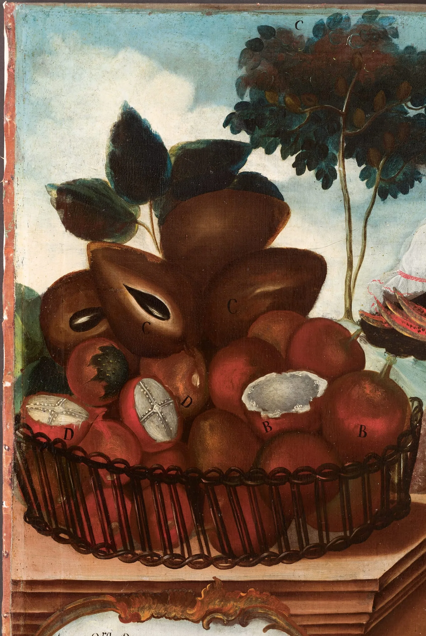 This painting and its companion (see https://collections.lacma.org/node/2092281" >M.2014.89.2) present richly dressed figures next to giant tropical fruits to symbolize the abundance of the land. Such images participated in a long tradition in Europe of representing non-Western peoples, and the precise botanical renditions responded to taxonomic impulses fostered by the Enlightenment.