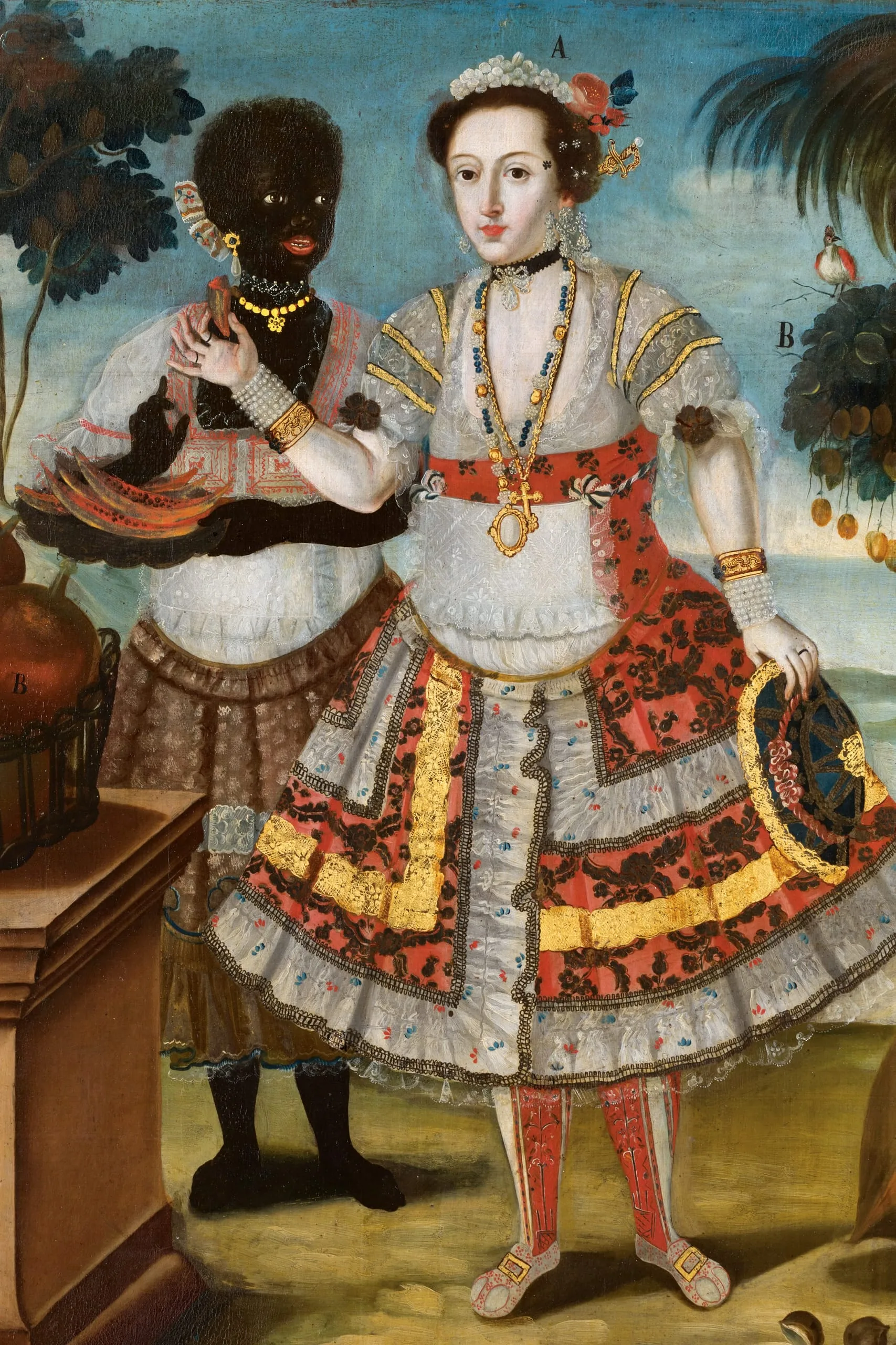 Here, the Spanish figure wears a luxurious regional ensemble, including a petticoat (pollera) decorated with gold and silver (now tarnished), pearls (associated with New World riches), and a crucifix and oval reliquary (to signal that she is Catholic and hence “civilized”). Her enslaved companion is more modestly bedecked and portrayed barefoot to emphasize their different social status.