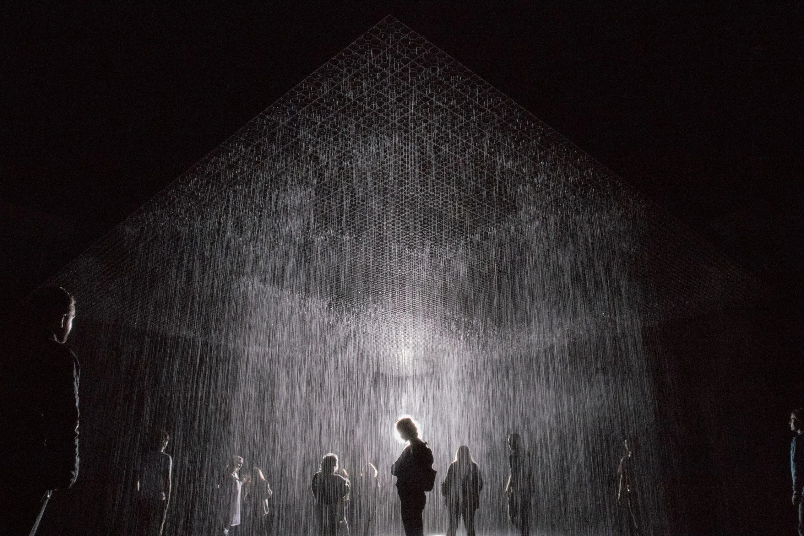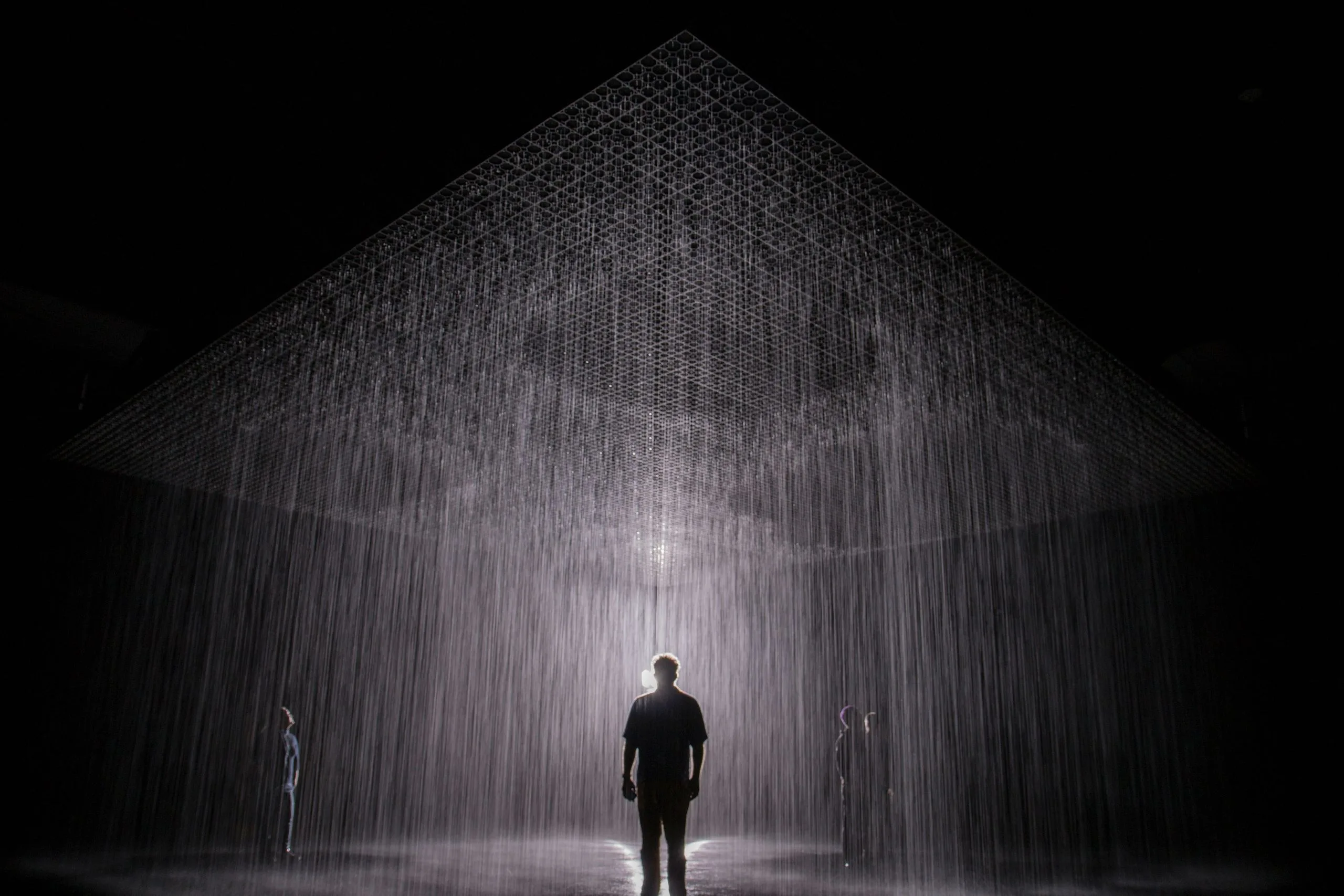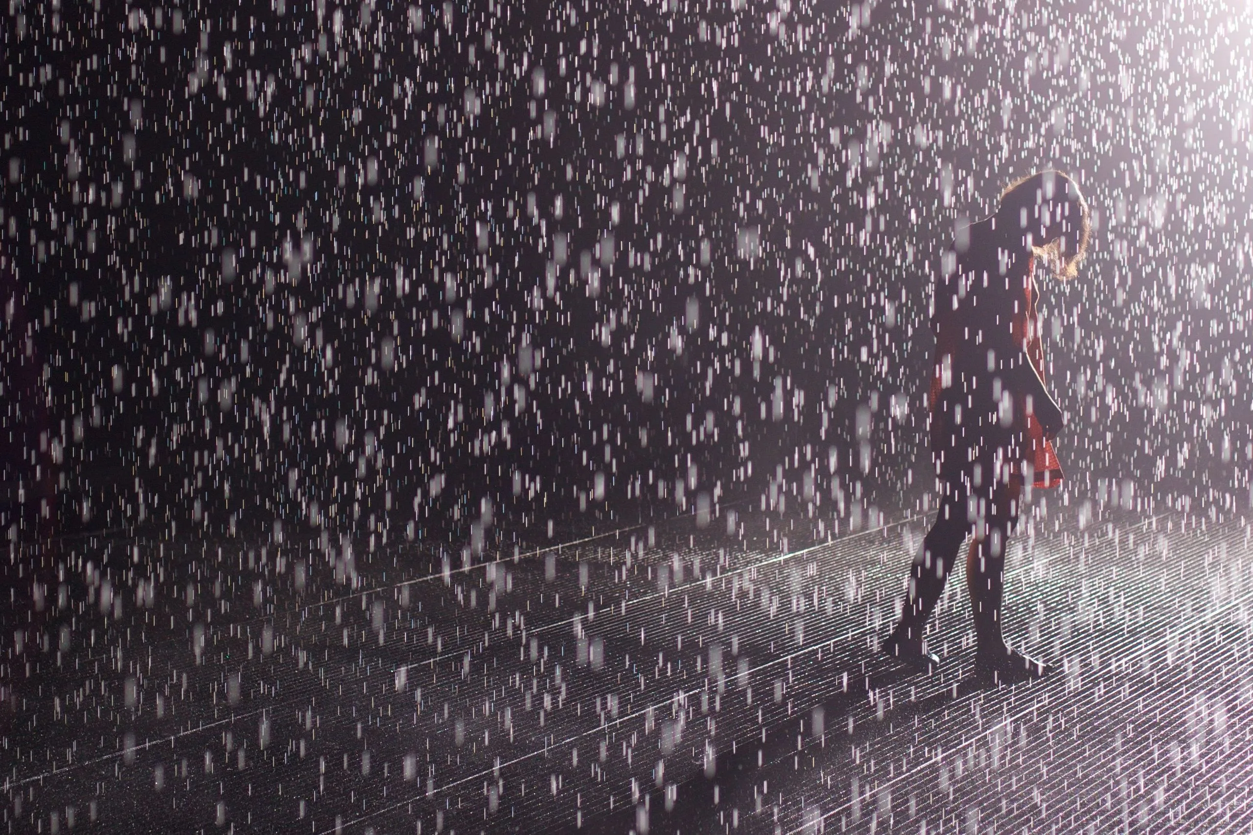 - Water, injection-molded tiles, solenoid valves, pressure regulators, custom software, 3D-tracking cameras, steel beams, water management system, grated floor