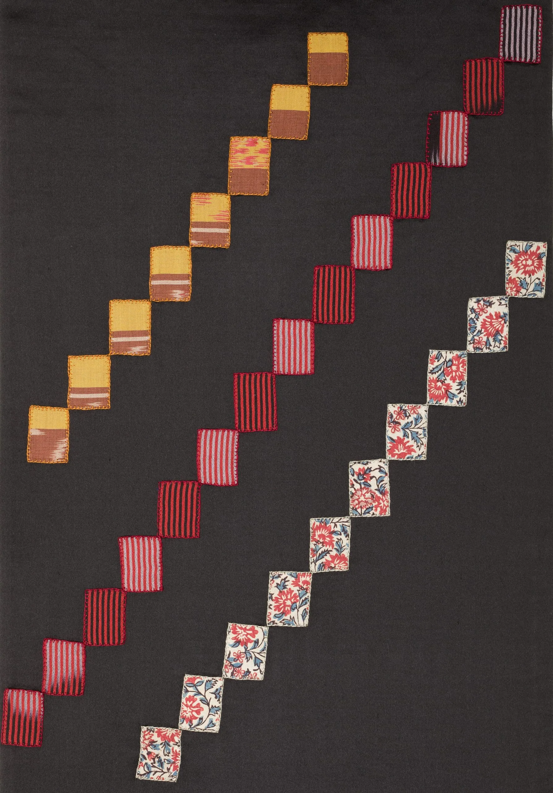 - Silk satin, silk plain weave, silk crepe, cotton plain weave; tie-resist-dyed warp (tate-gasuri), block-printed, appliquéd