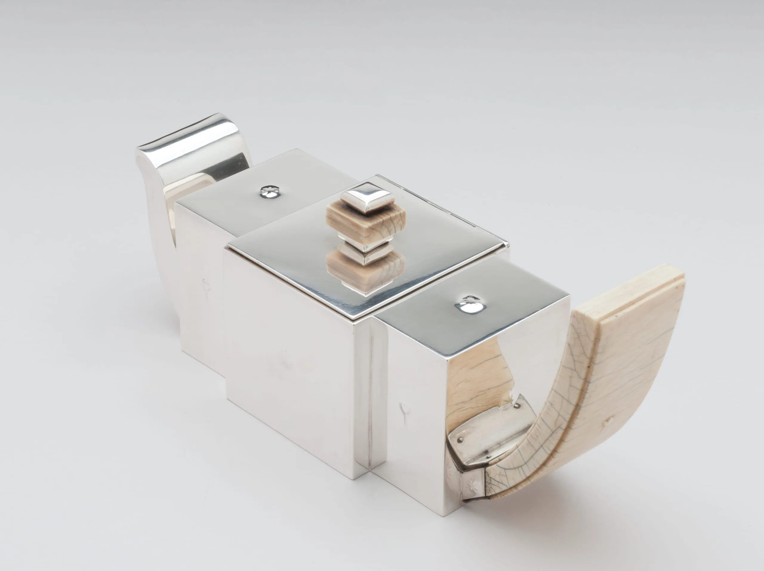 Polished silver rectangular teapot with a jet-black lid, stacked ivory or bone finial, and a flat slab handle of striated cream-colored material