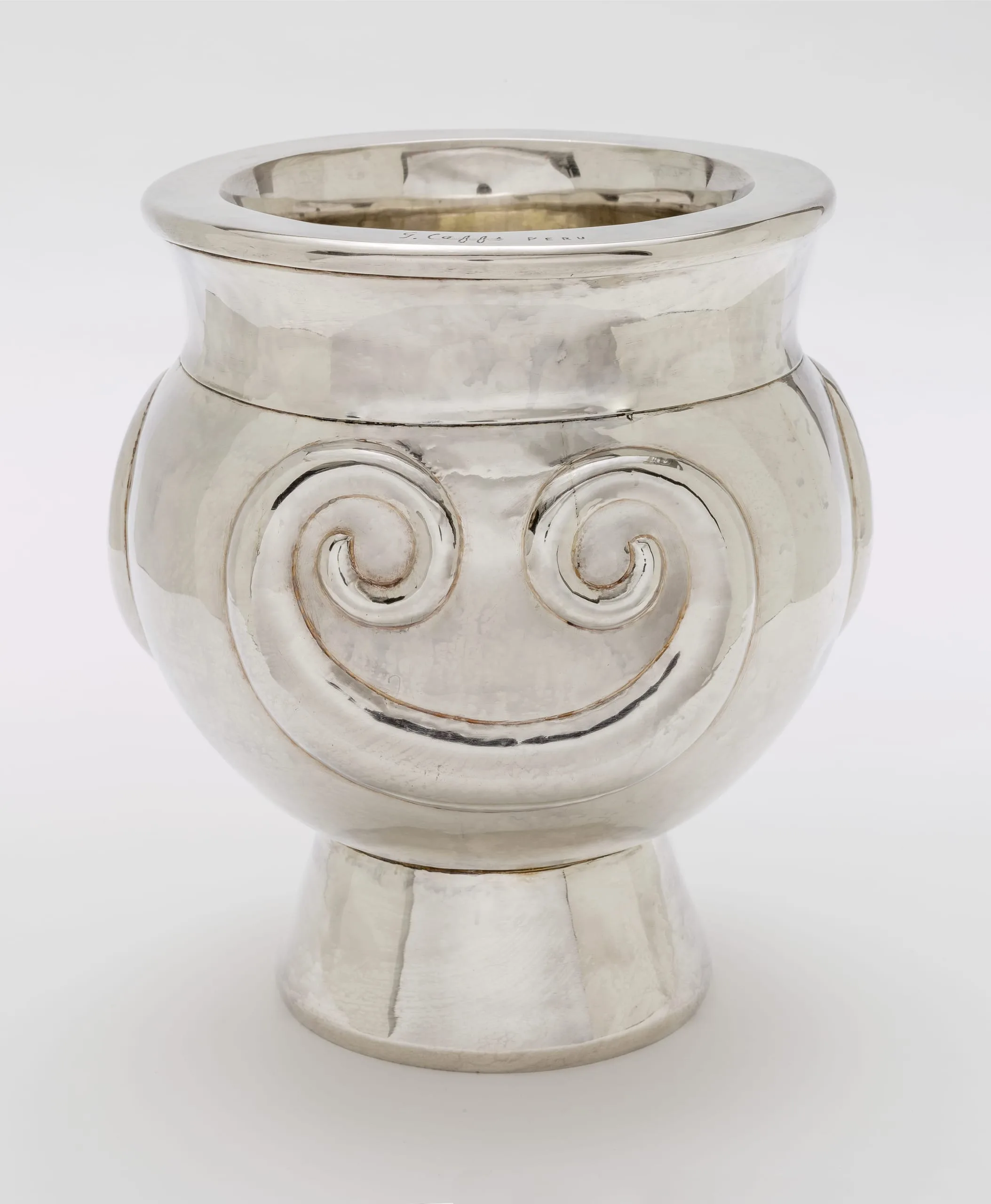 Small hammered silver vessel with a globular body on a flared foot, featuring a raised double-scroll relief motif on the front and a gold-toned interior