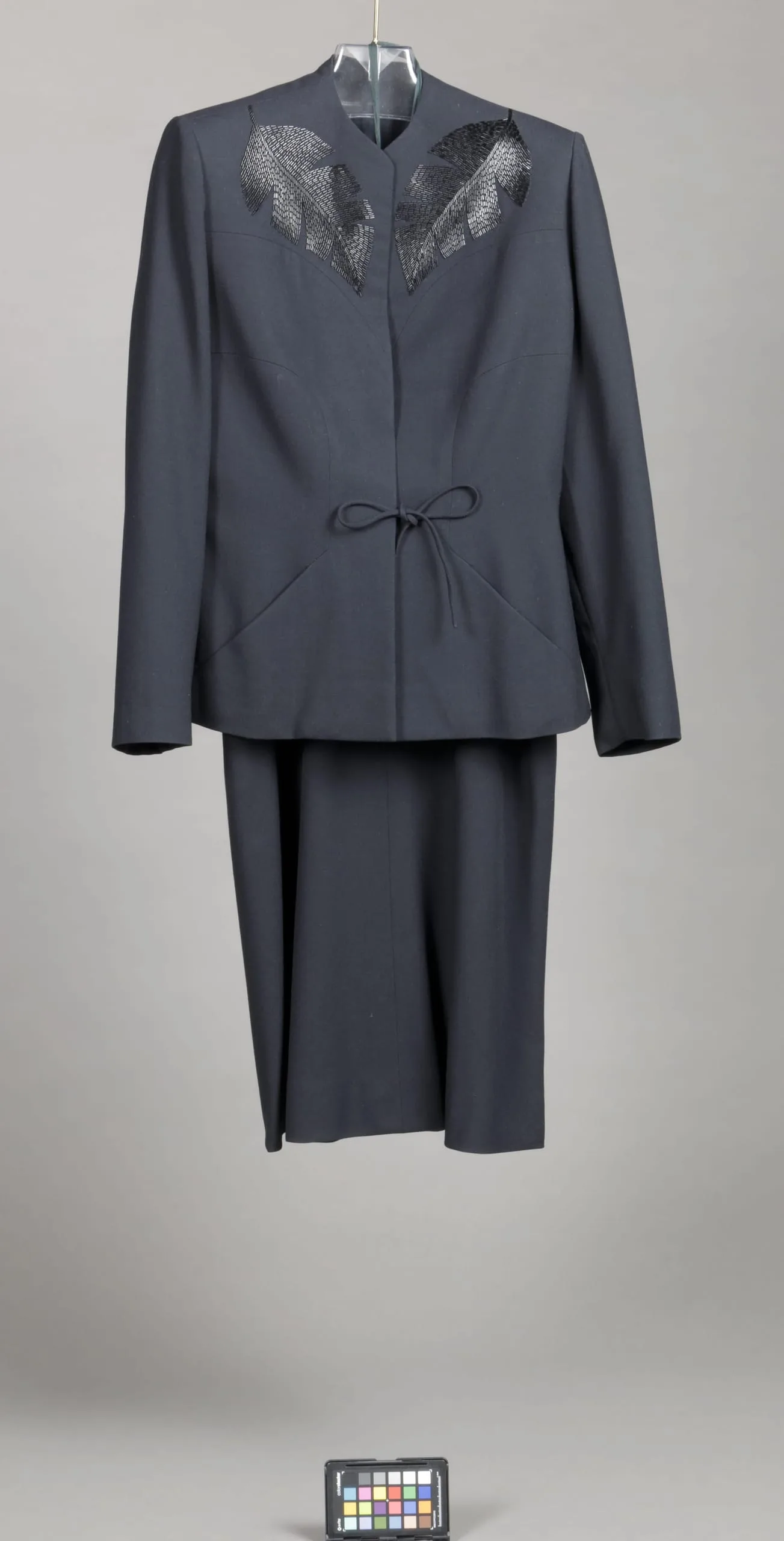 - Jacket: wool plain weave with glass beads; Skirt: wool plain weave.