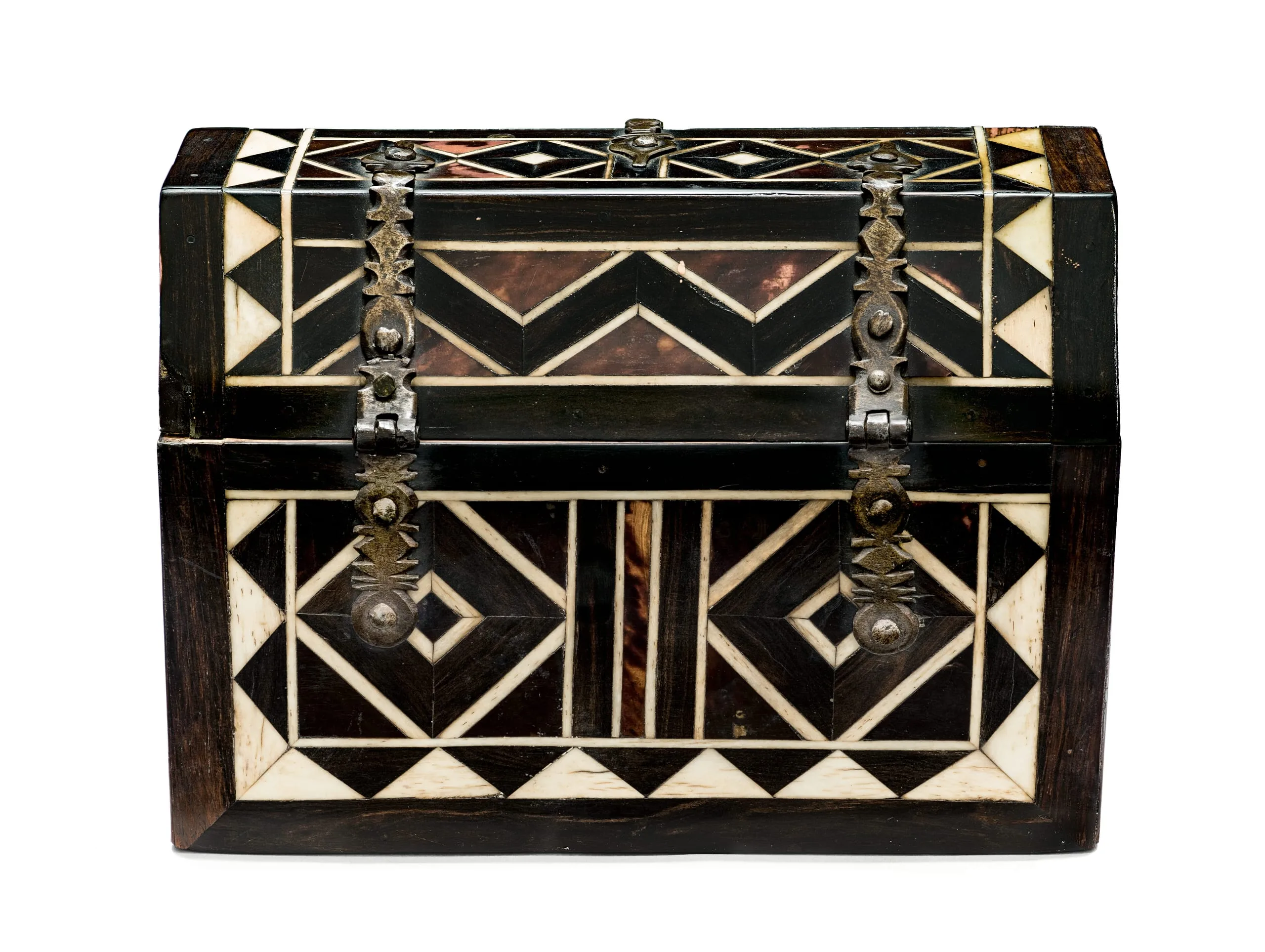 This chest incorporates bone and tortoiseshell inlay into fine geometric designs, employing a technique known as embutido. It was likely made in Campeche, an important woodworking center in the viceroyalty of New Spain.