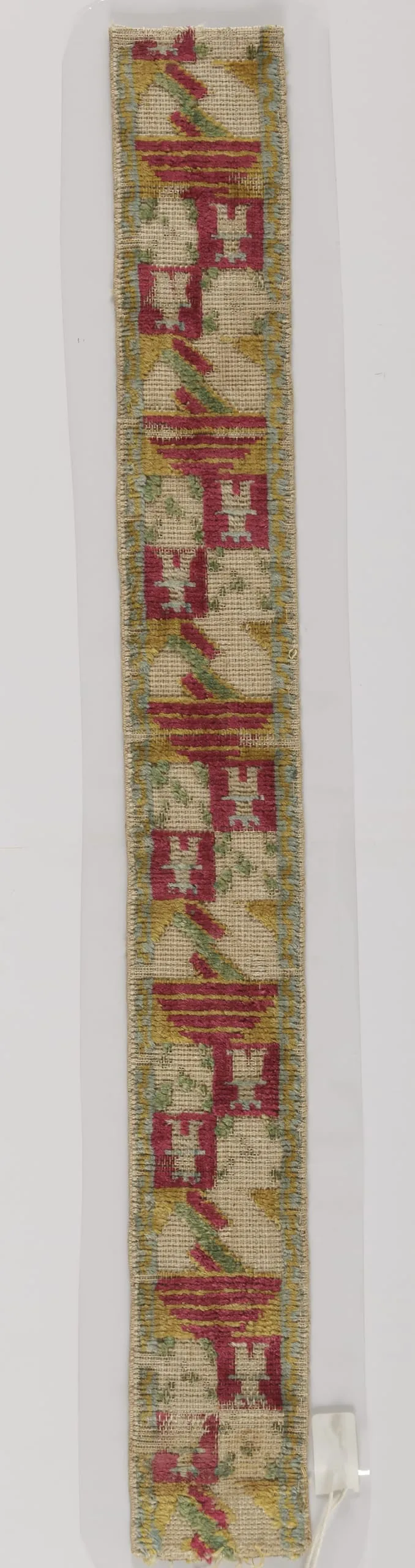 Narrow vertical embroidered textile band with repeating geometric motifs in crimson red, sage green, and yellow on an ivory ground