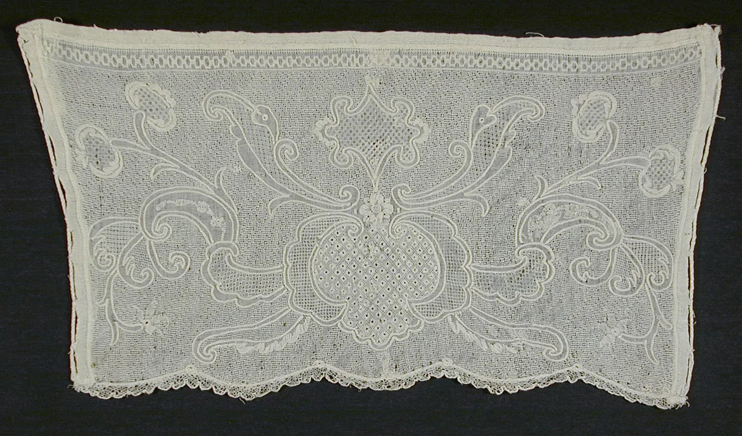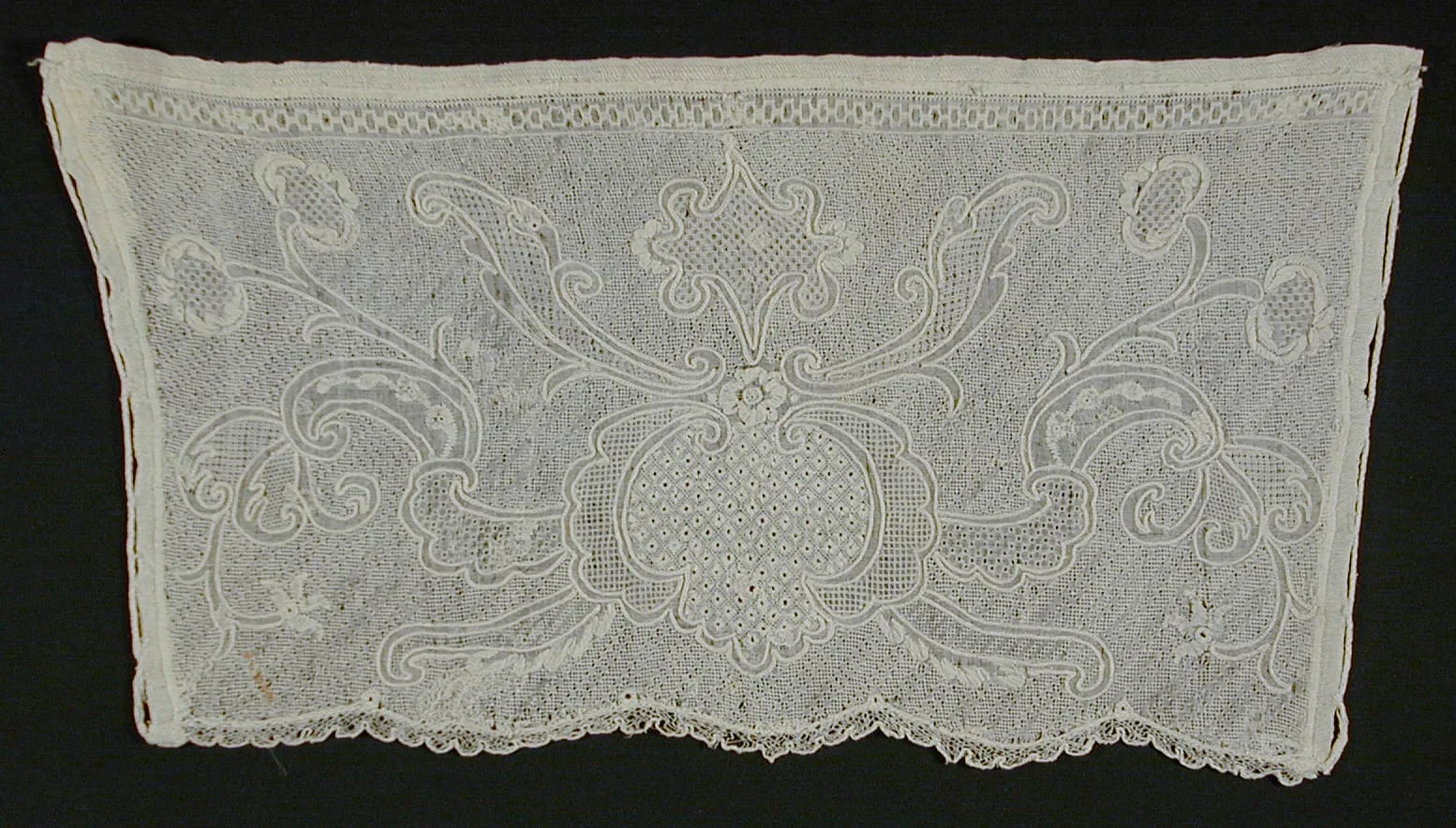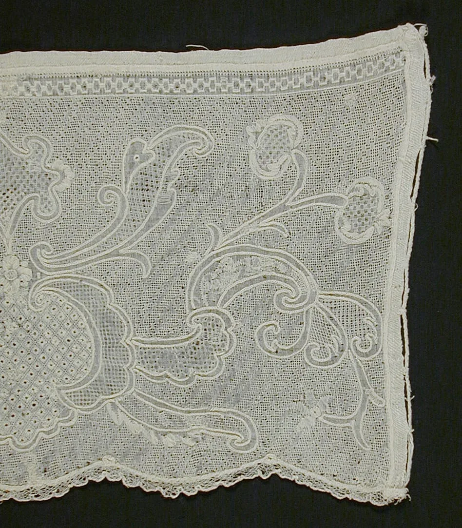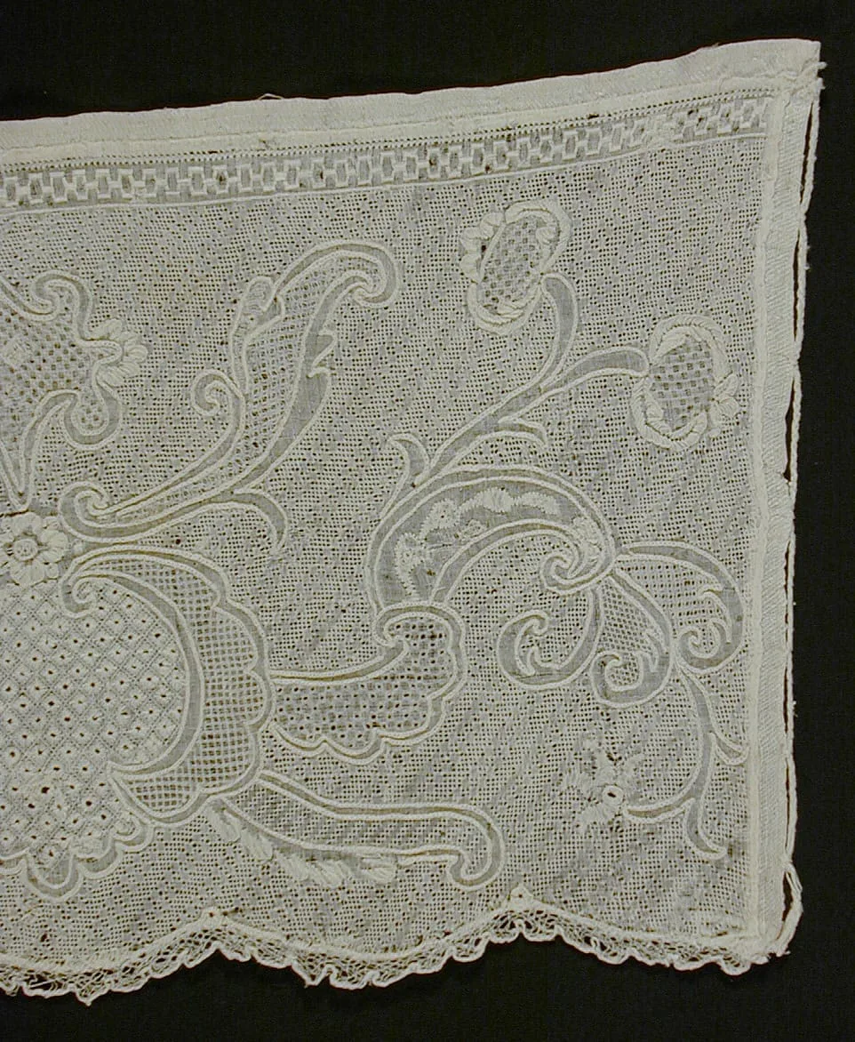 - White linen Dresden work on white linen with linen bobbin lace edging