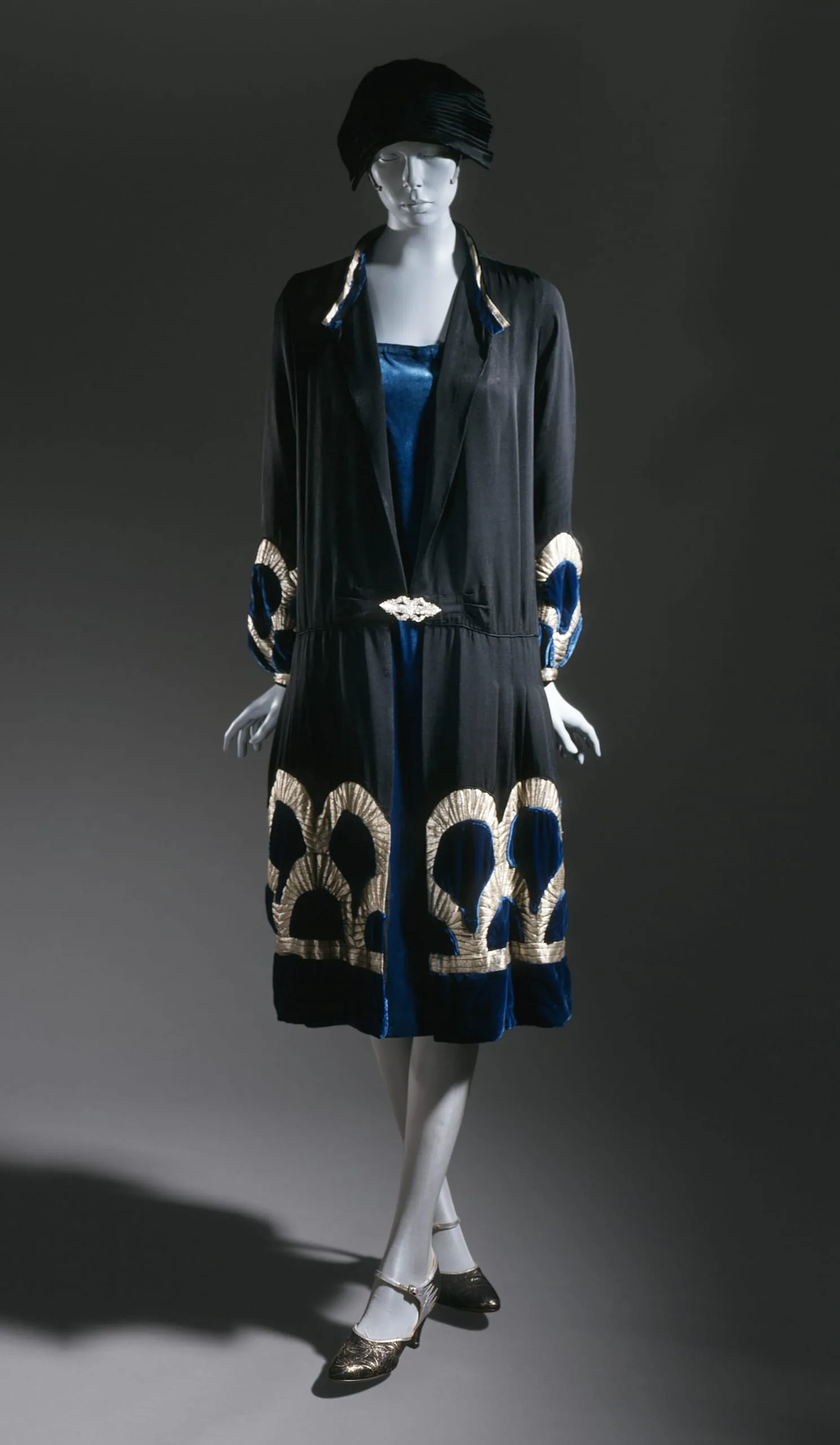 - Coat Dress: silk plain weave (faille), metalic and silk thread satin (lamé) and silk velvet