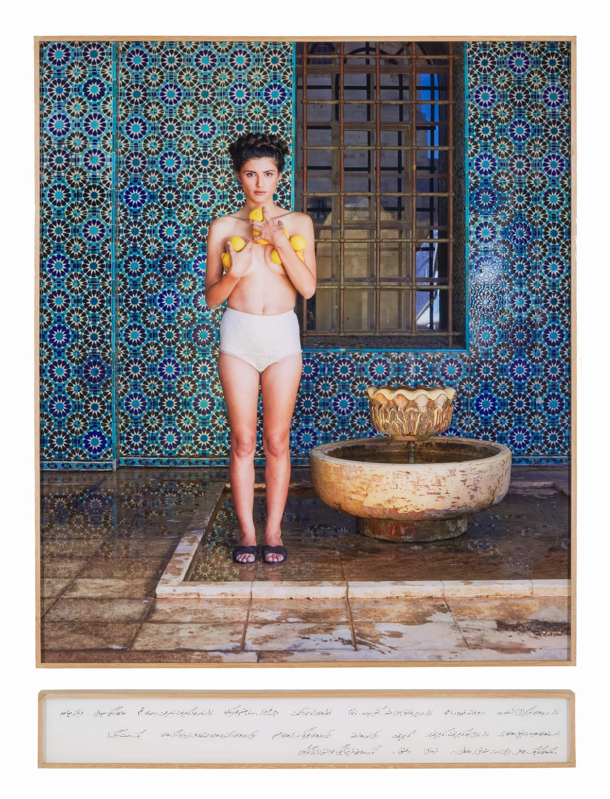 poet Forough Farrokhzad are framed below the image, referencing the artist’s Iranian heritage and the enduring legacy of her