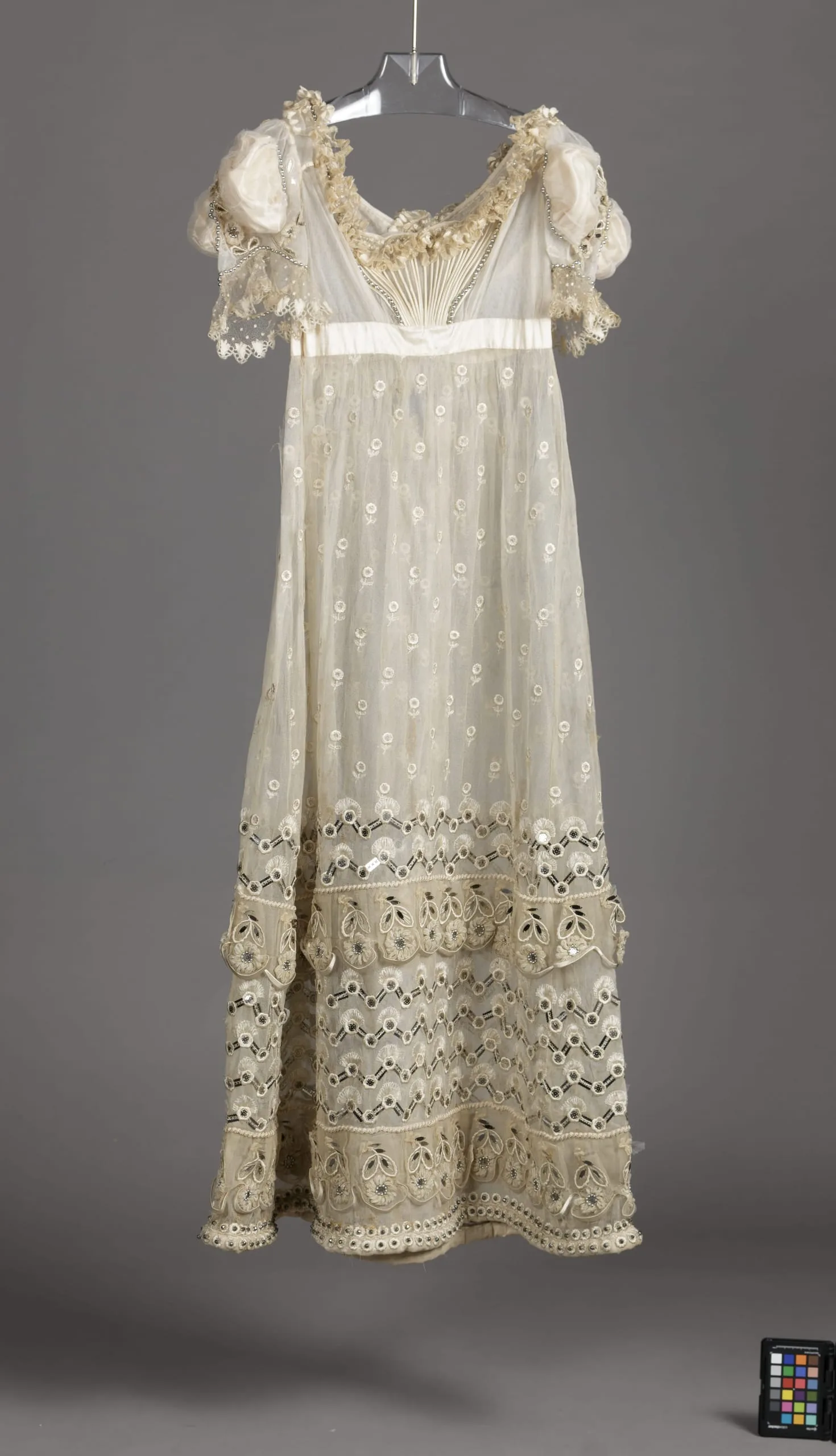 - Silk net with silk embroidery, metal sequins, metal beads, silk satin, silk and metal chenille, and silk lace