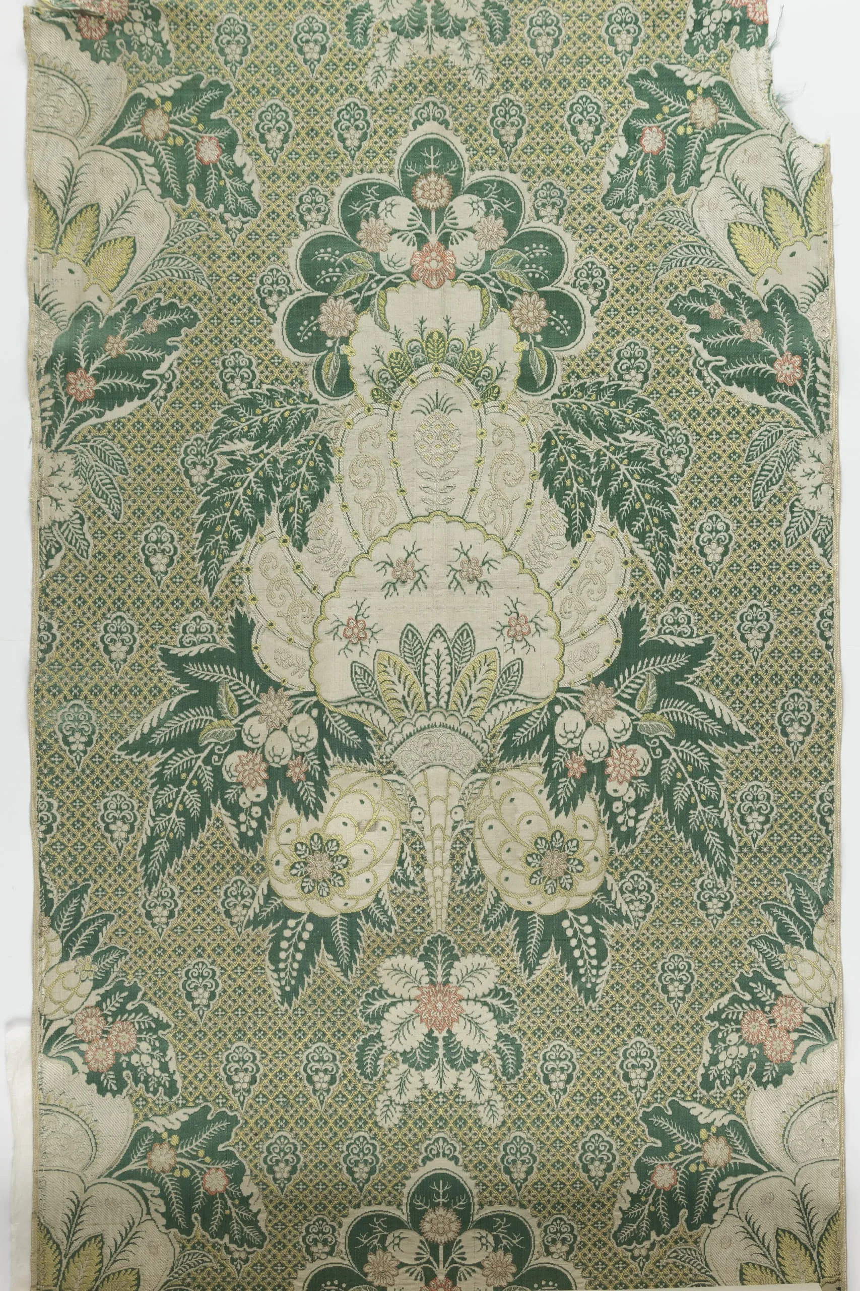 - Silk satin and plain weave (damassé) with silk supplementary-weft patterning bound in twill and silk discontinuous supplementary-weft patterning (brocade)
