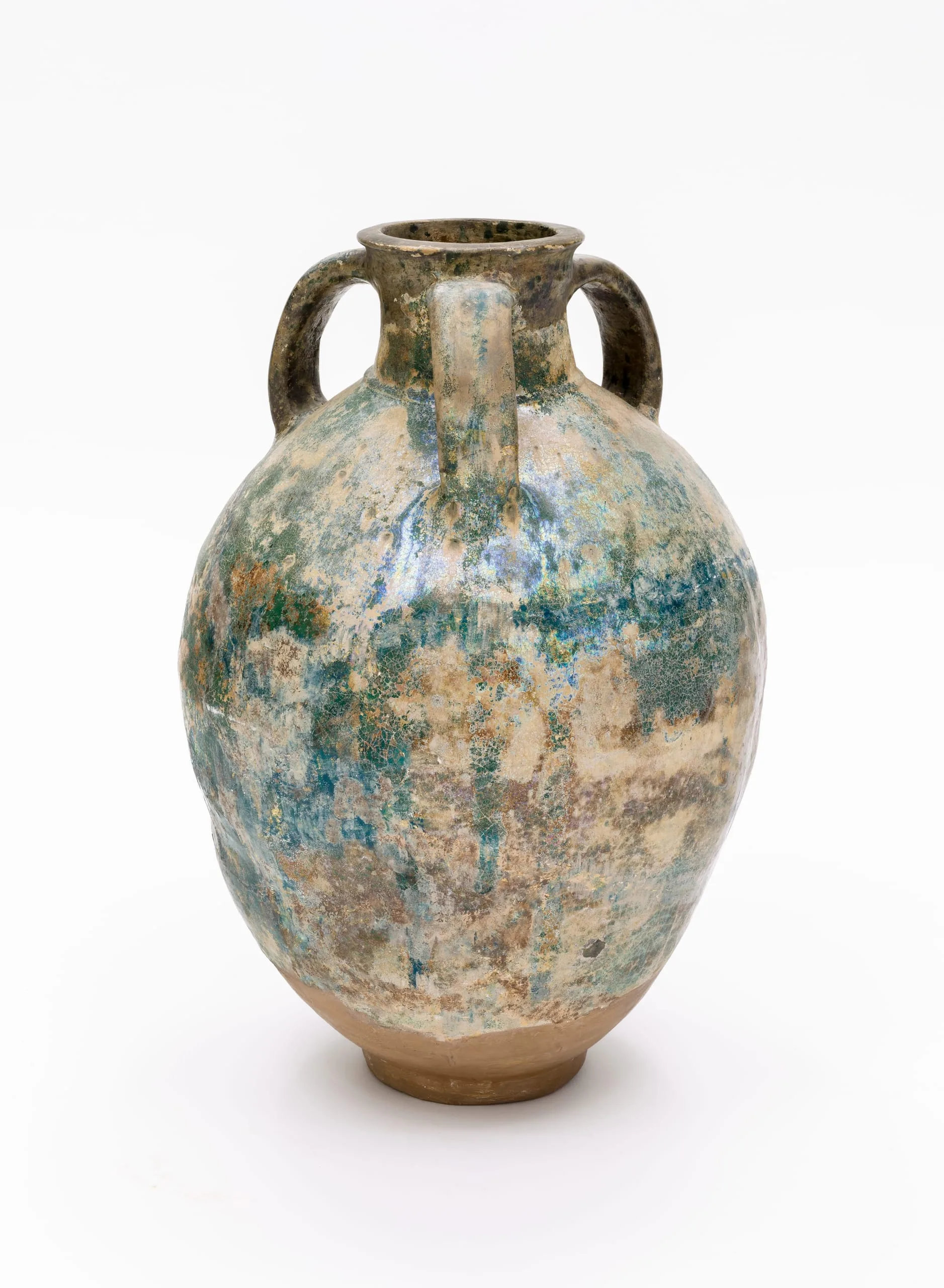 This pair of turquoise-glazed storage jars (also see M.2015.60.1) was likely manufactured in a Euphrates kiln, probably in the town of Raqqa, in northern Syria, which was an important center for ceramic production in the twelfth and thirteenth centuries. The ovoid shape of these vessels goes back to pre-Islamic times and continued into the medieval Islamic period. Such jars, made to be aesthetically pleasing despite their mundane utilitarian function, were used to store and transport a wide variety of substances both liquid and solid. These twin vessels are notable for their uncommonly large size.