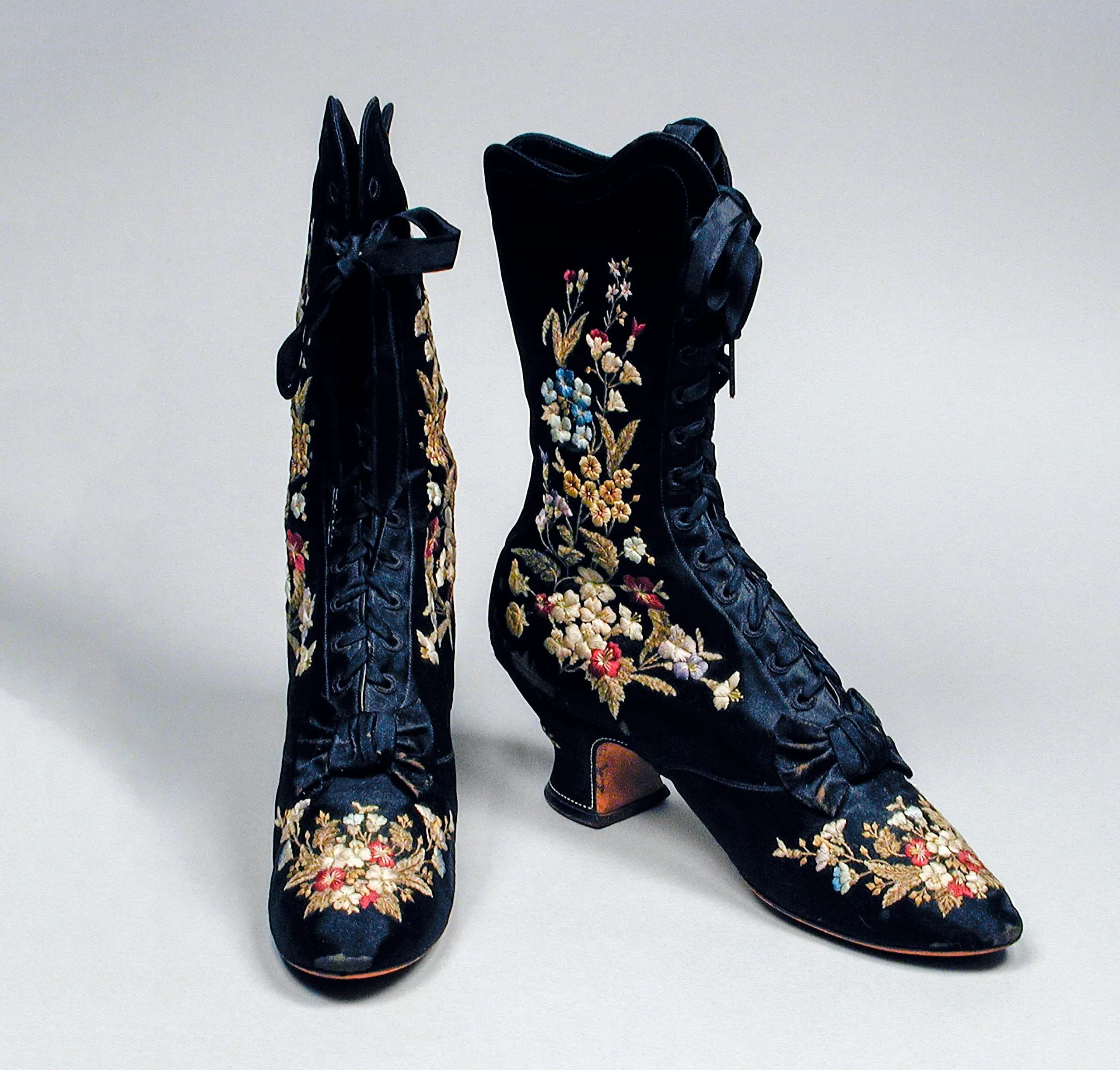 - Silk satin with silk and silk chenille embroidery, silk plain weave ribbon, and leather