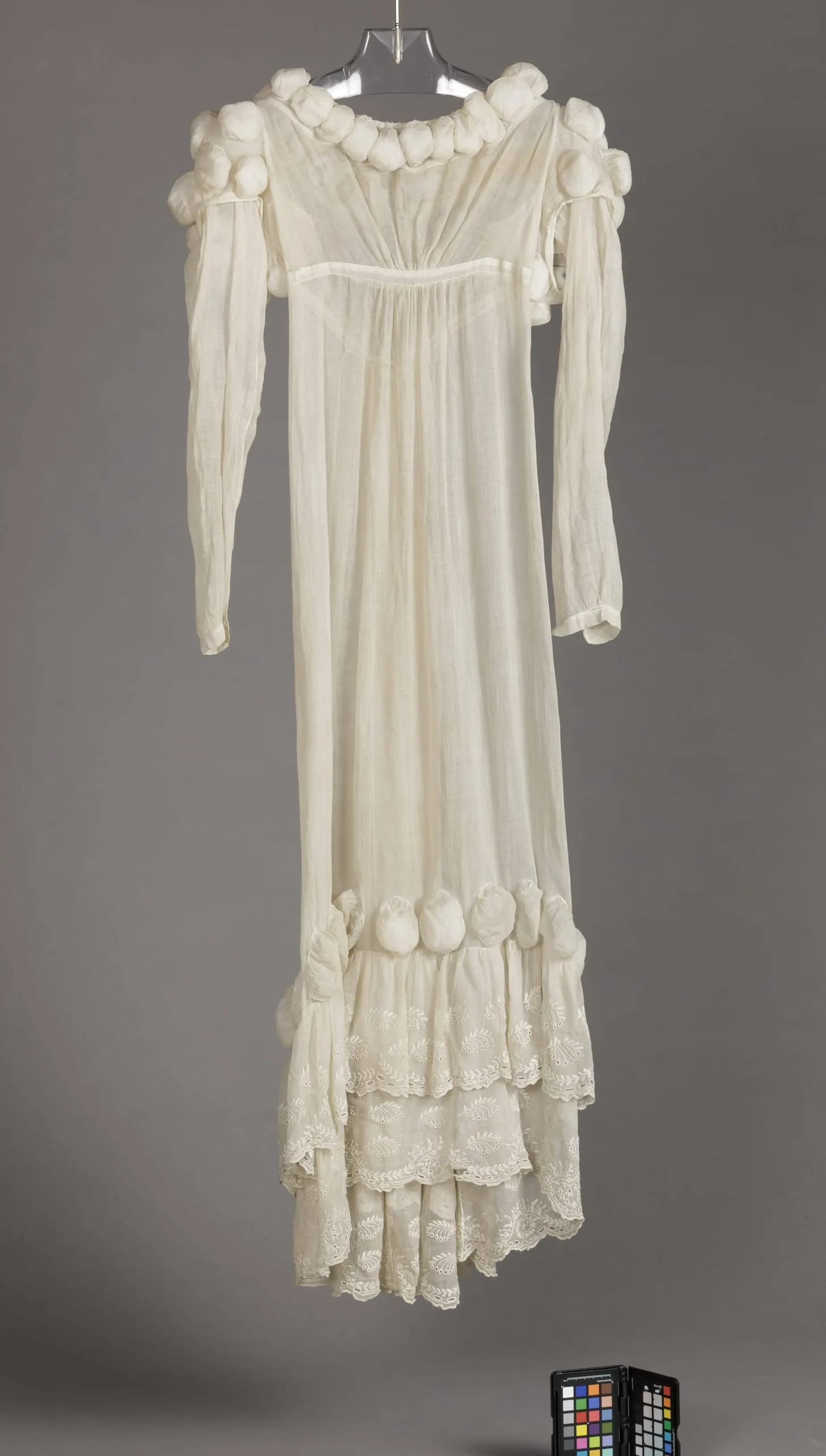 Ivory-white empire-waist dress with sheer fabric, pom-pom trim at neckline and shoulders, and a tiered skirt with embroidered and lace-edged hem, displayed on a hanger