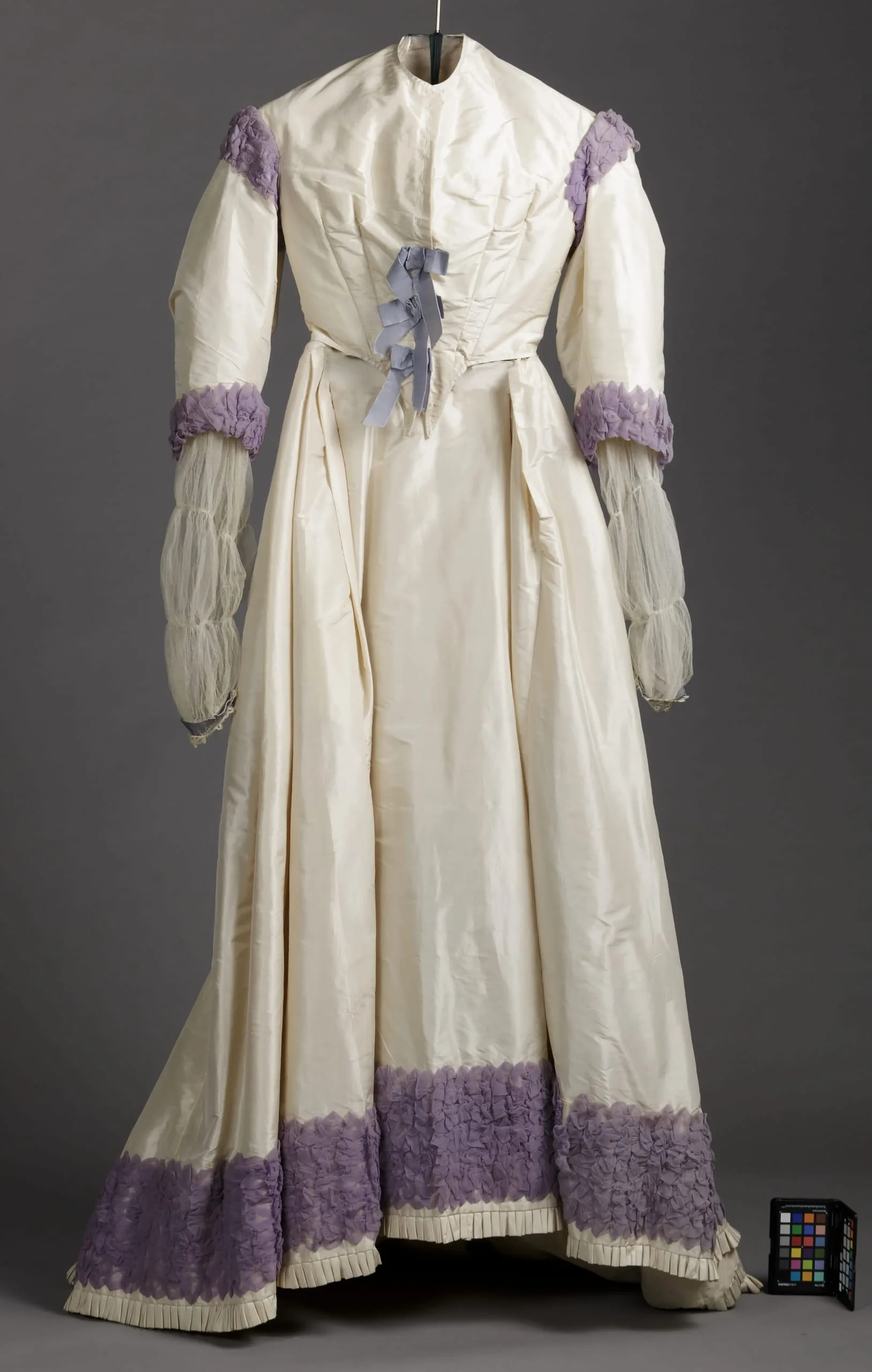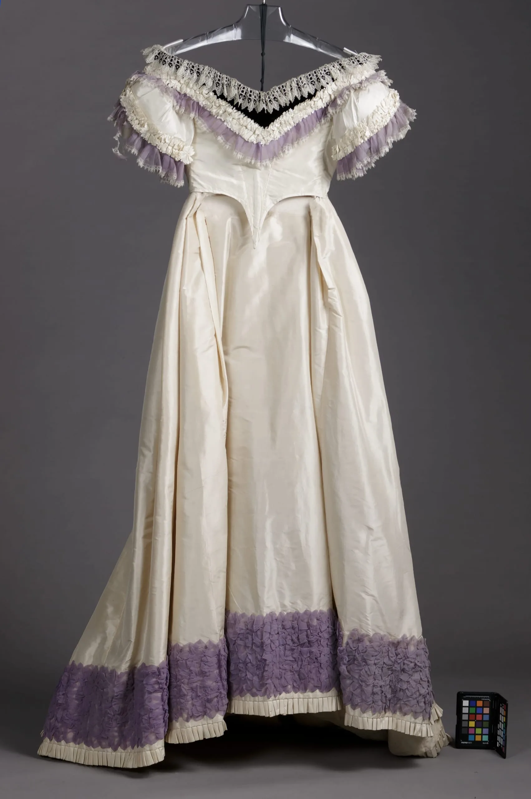 - Evening Bodice: Silk plain weave (taffeta), with silk velvet, silk plain weave (crepe), silk tulle, and silk lace trim. Day Bodice: Silk plain weave (taffeta), with silk ribbon, silk plain weave (crepe), silk tulle, and linen lace trim. Skirt: Silk plain weave (taffeta) with silk plain weave (crepe) trim.