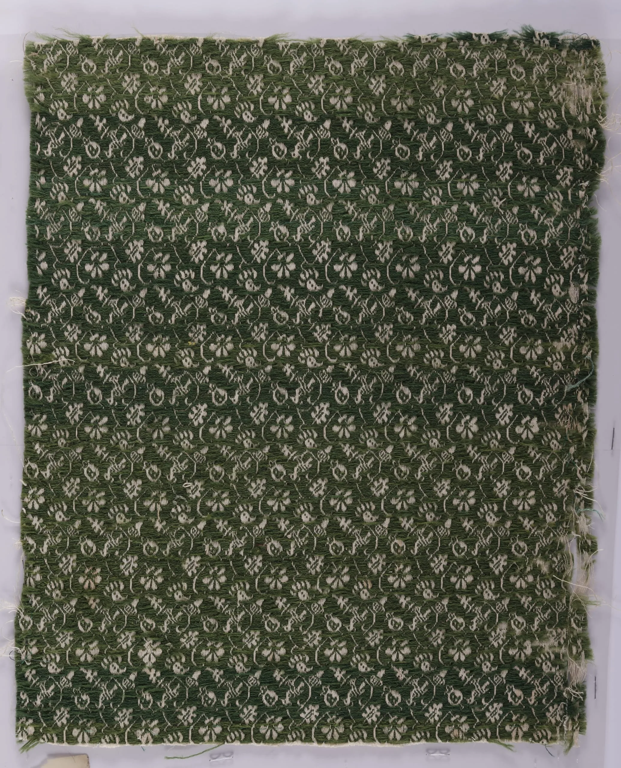Woven textile fragment with allover pattern of cream floral and foliate motifs on a deep forest green ground, with frayed edges on all sides