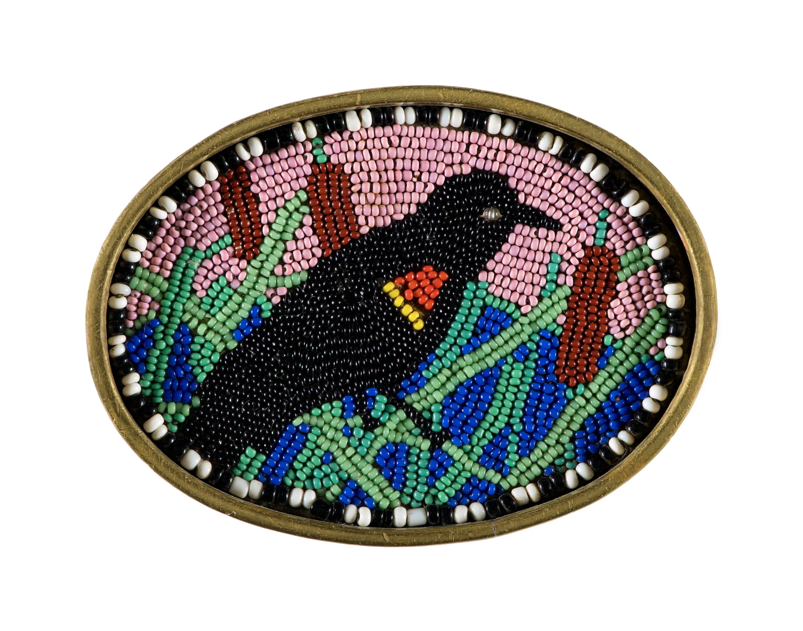 - Brass and glass beads on leather
