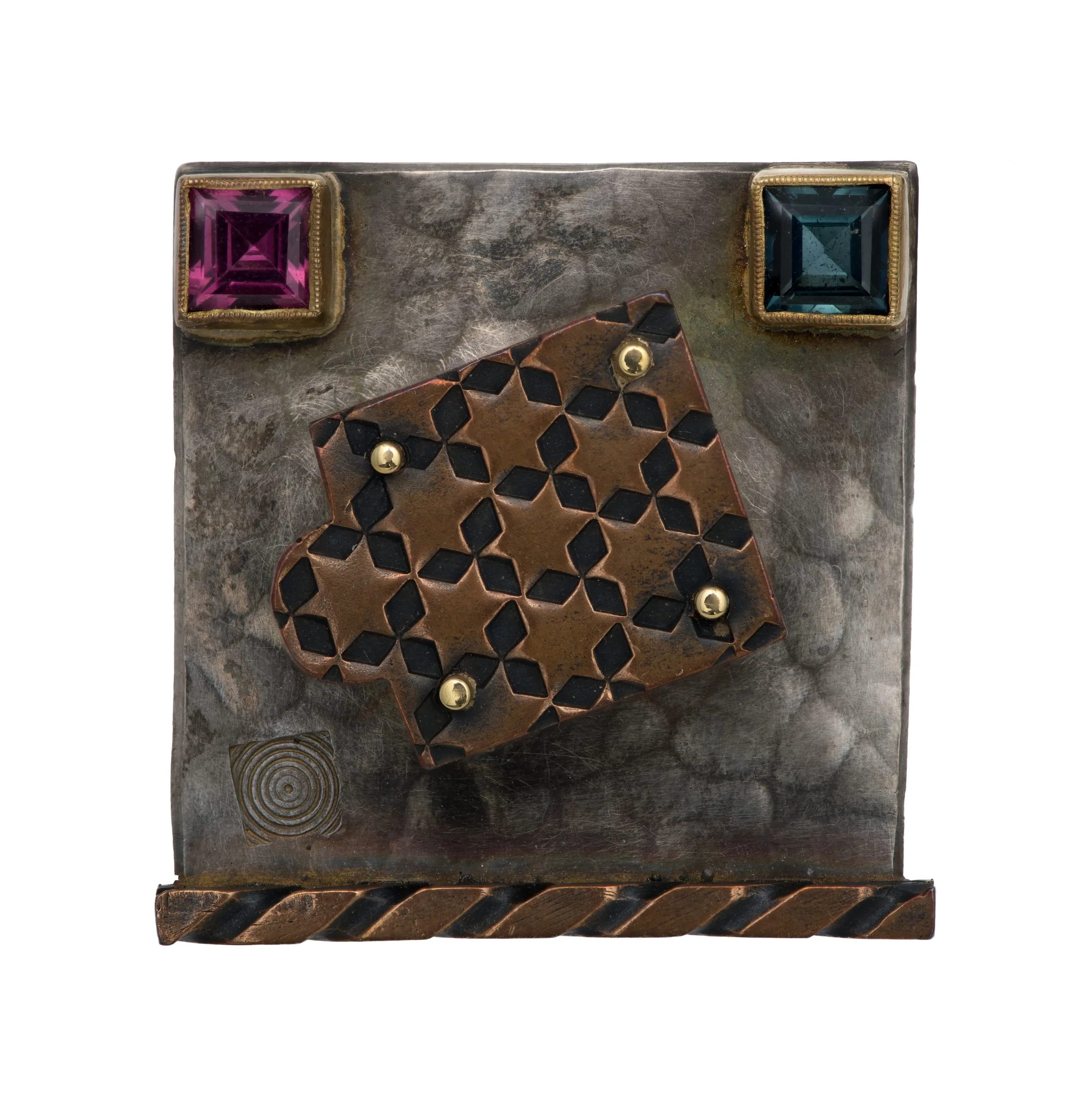 - Silver, copper, 24k gold, 18k gold, tourmaline, rhodolite