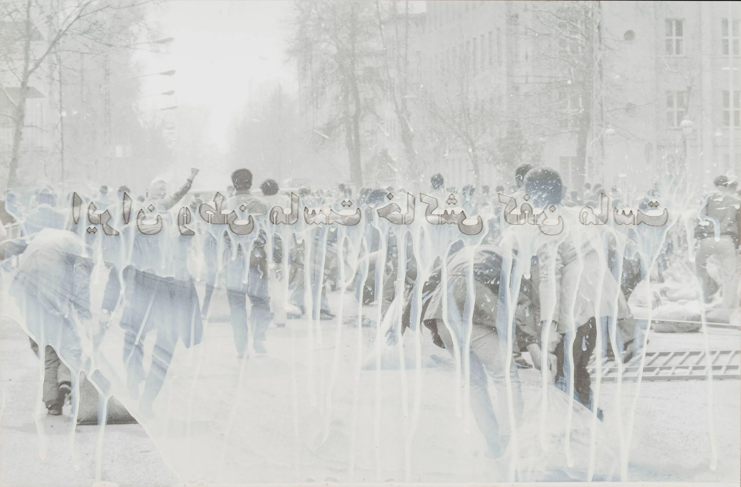 In his series Revolution after Revolution, Mohsen Zare visually and textually evokes the tumult of the Iranian Revolution by cutting the letters of political slogans into photographs of street protests that took place during the revolution. In this work, a photograph of marching protesters is pierced with the phrase (in Persian and backwards) "Iran is our homeland, its soil is our shroud." Zare further conjures the period through the print's form, which mimics the stencils used in graffiti, a popular vehicle for political descent during the revolution.