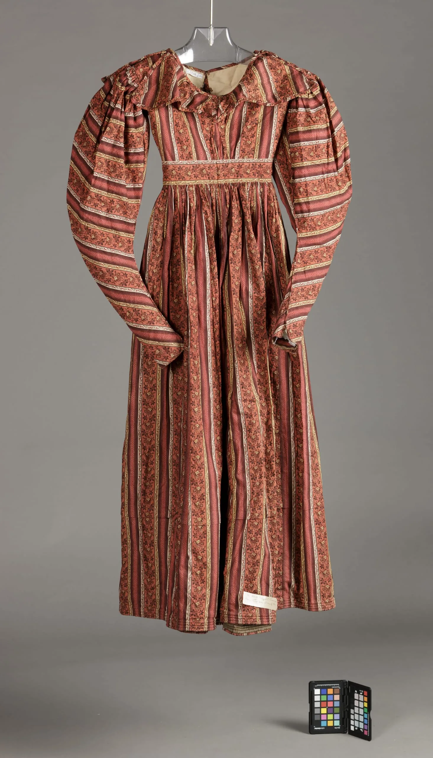 Full-length women's dress on a hanger, terra-cotta red with vertical stripes in green, ivory, and burgundy, featuring dramatically puffed sleeves and a high waist