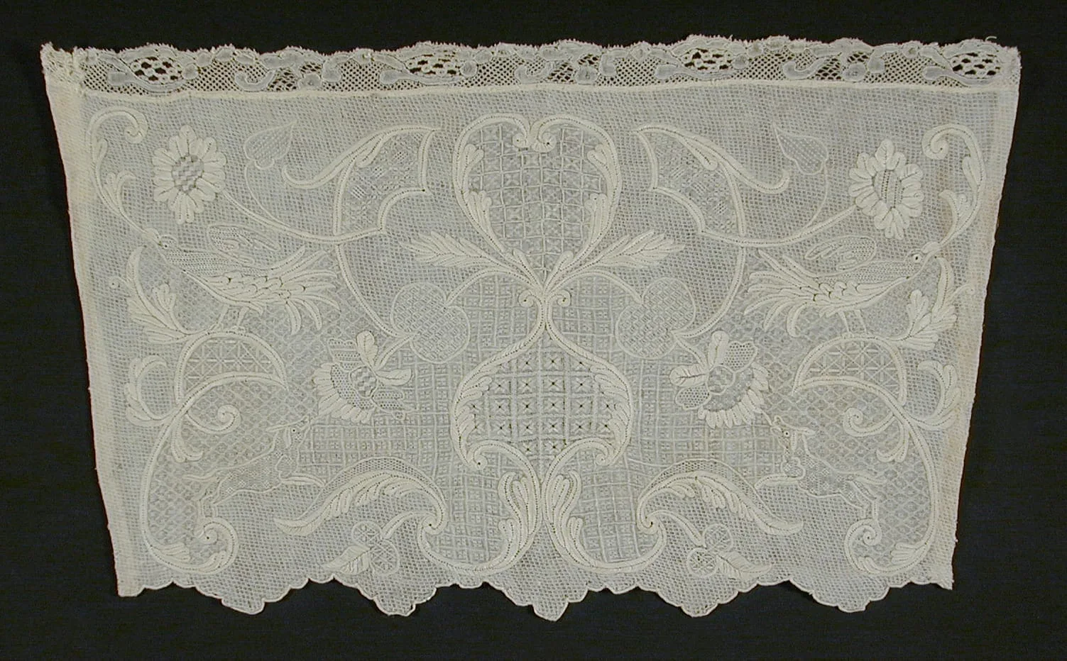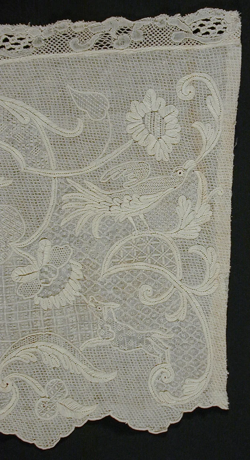 - Linen Dresden work on cotton, trimmed with linen and silk Mechlin bobbin lace