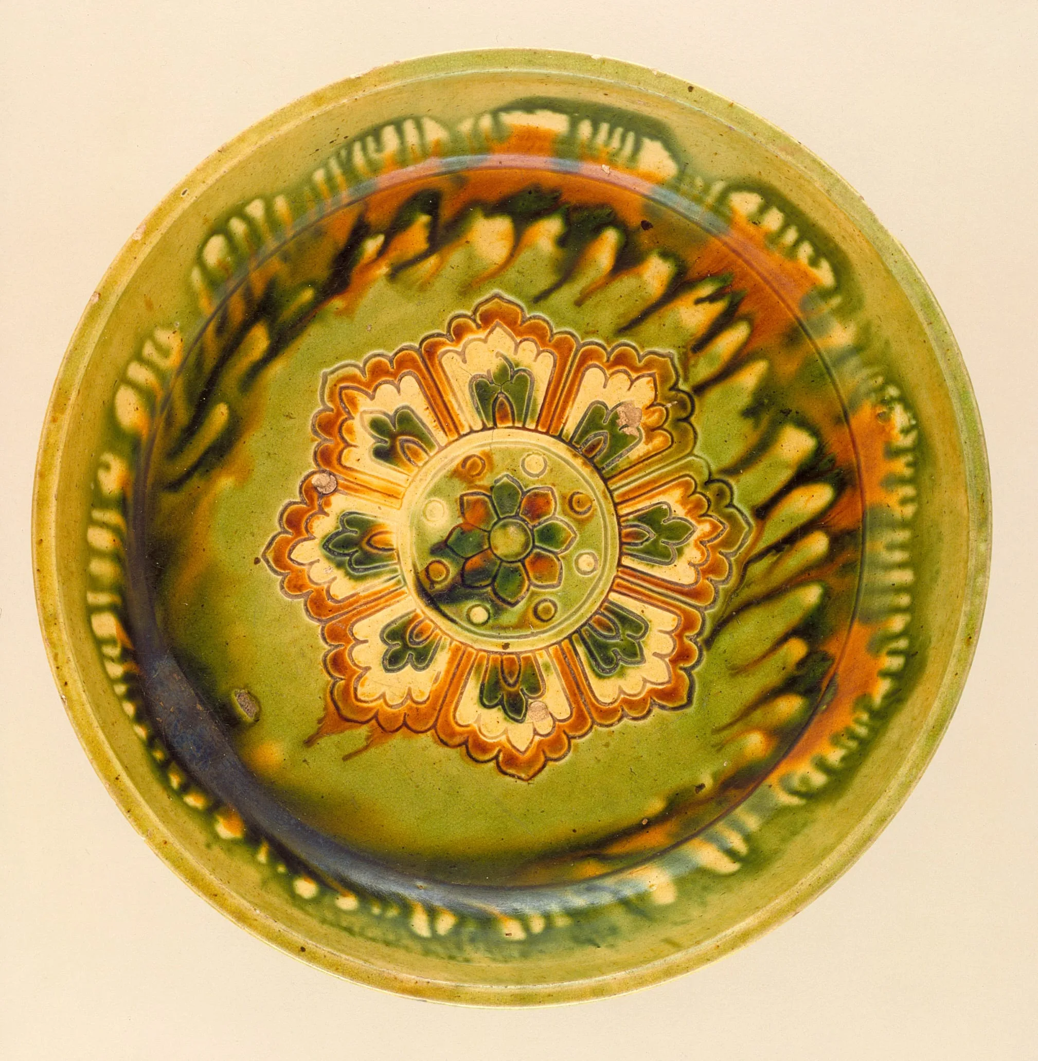 - Wheel-thrown earthenware with impressed decoration and polychrome (sancai) glaze