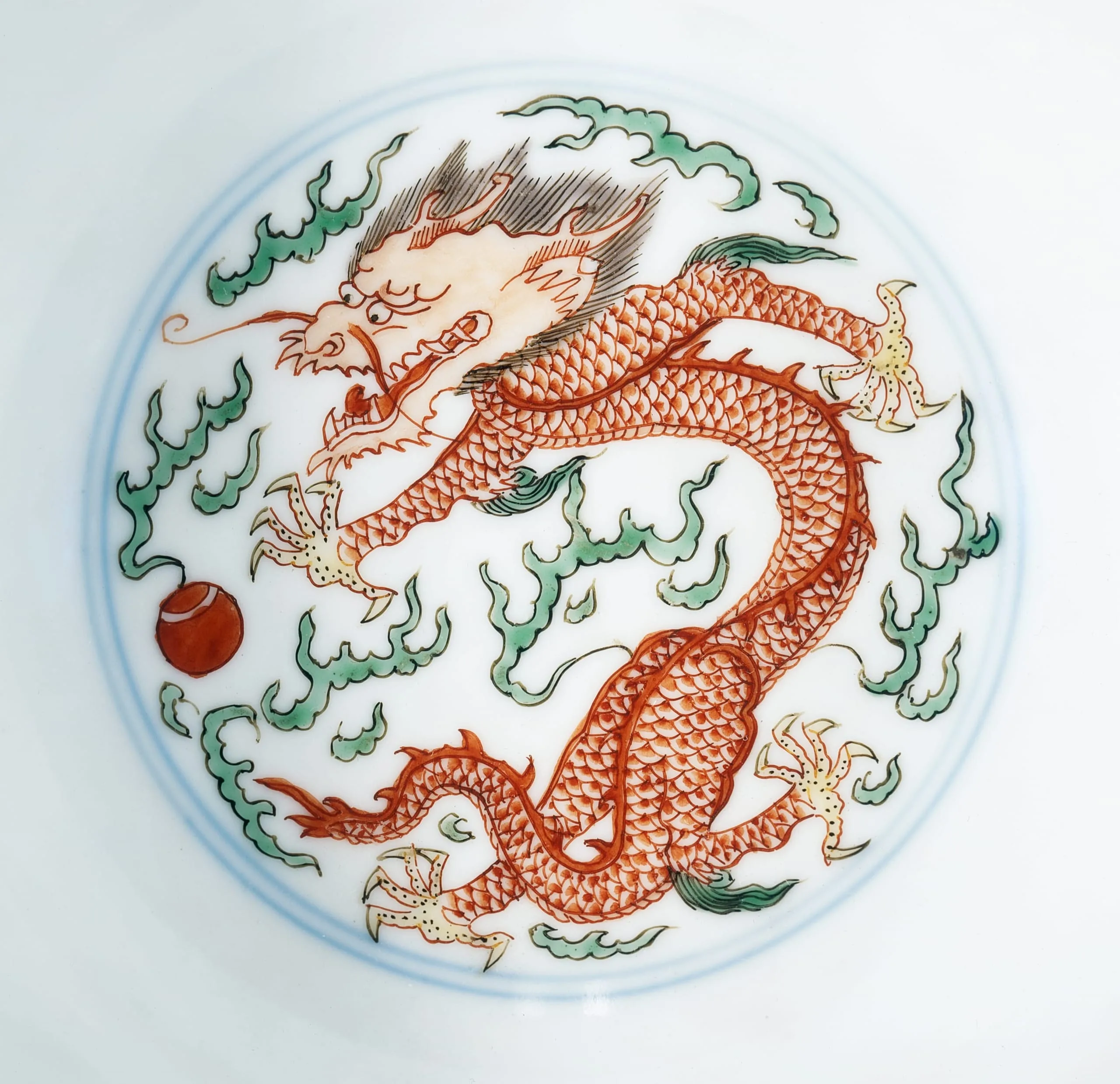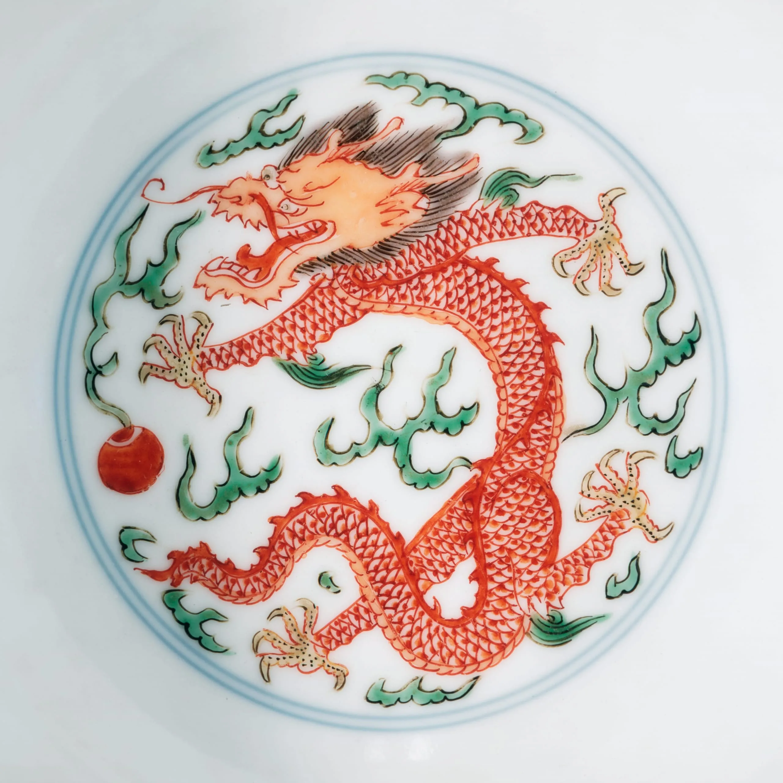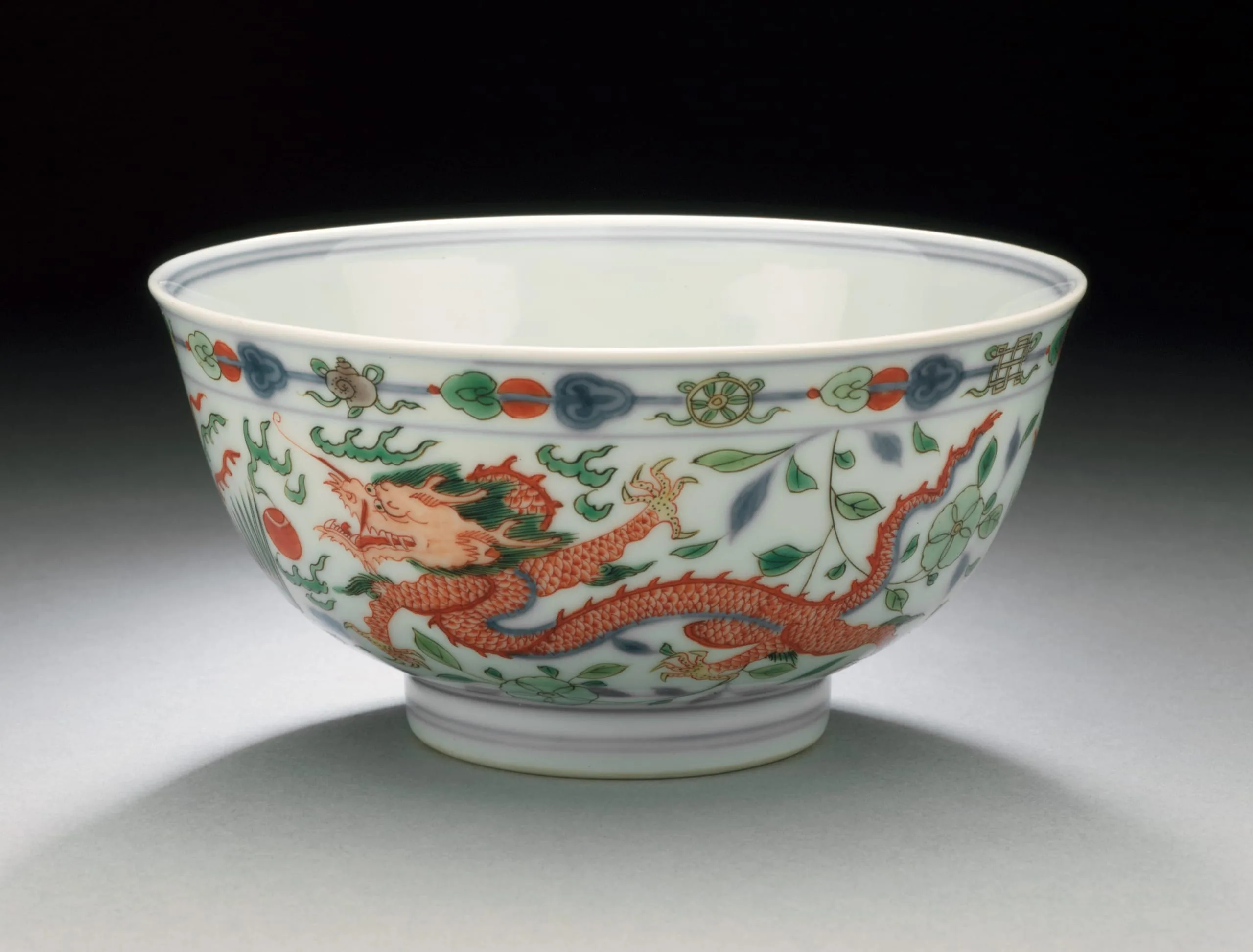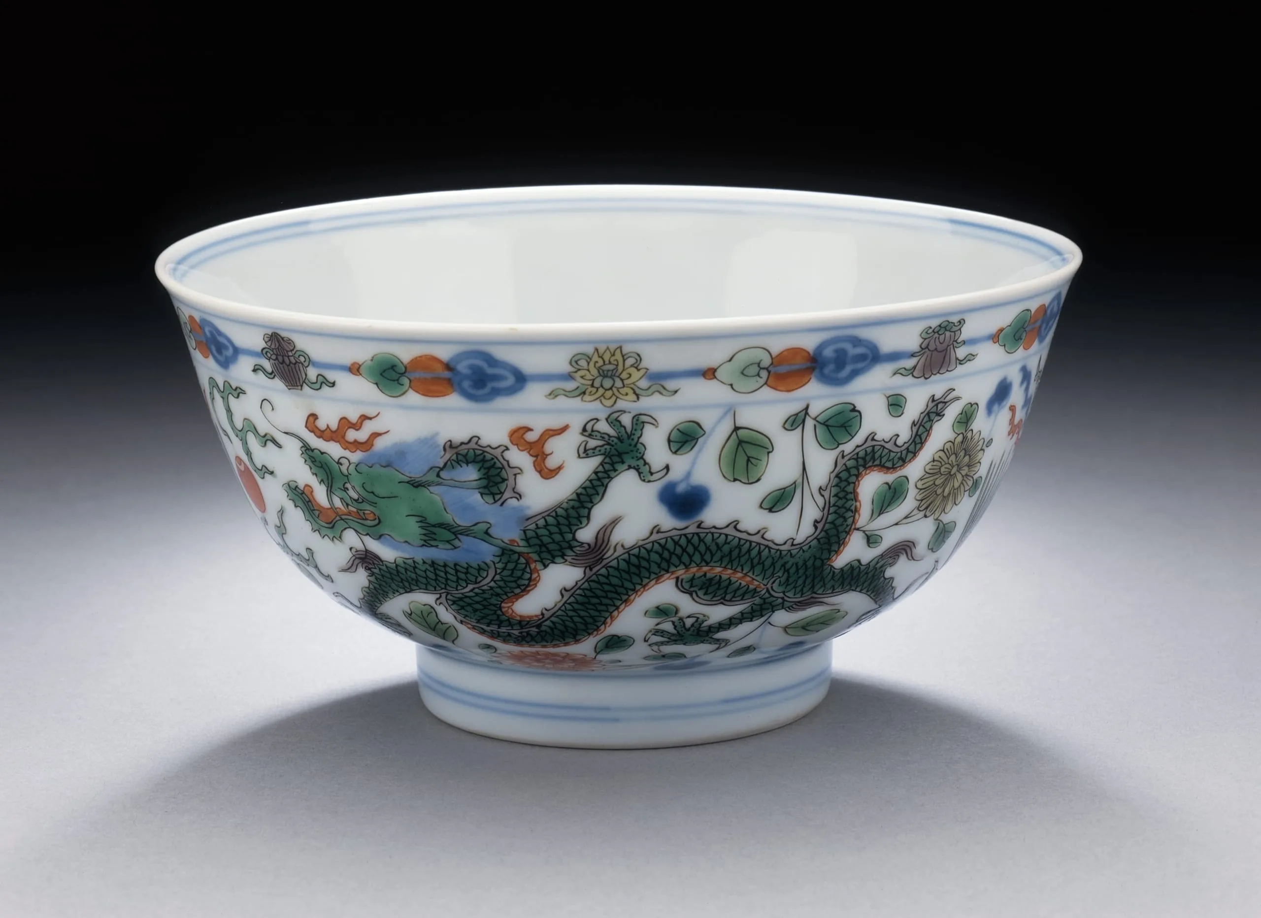 - Wheel-thrown porcelain with underglaze blue, clear glaze, and overglaze painted enamel decoration (doucai)