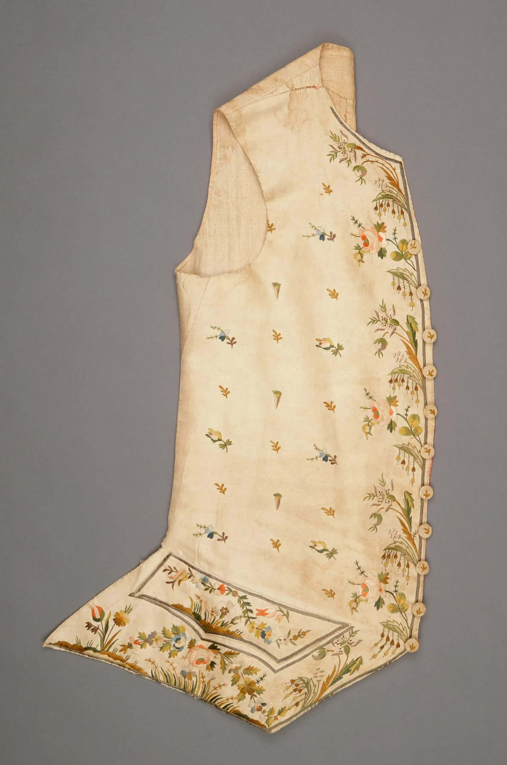 - Silk plain weave (faille), with silk thread embroidery.