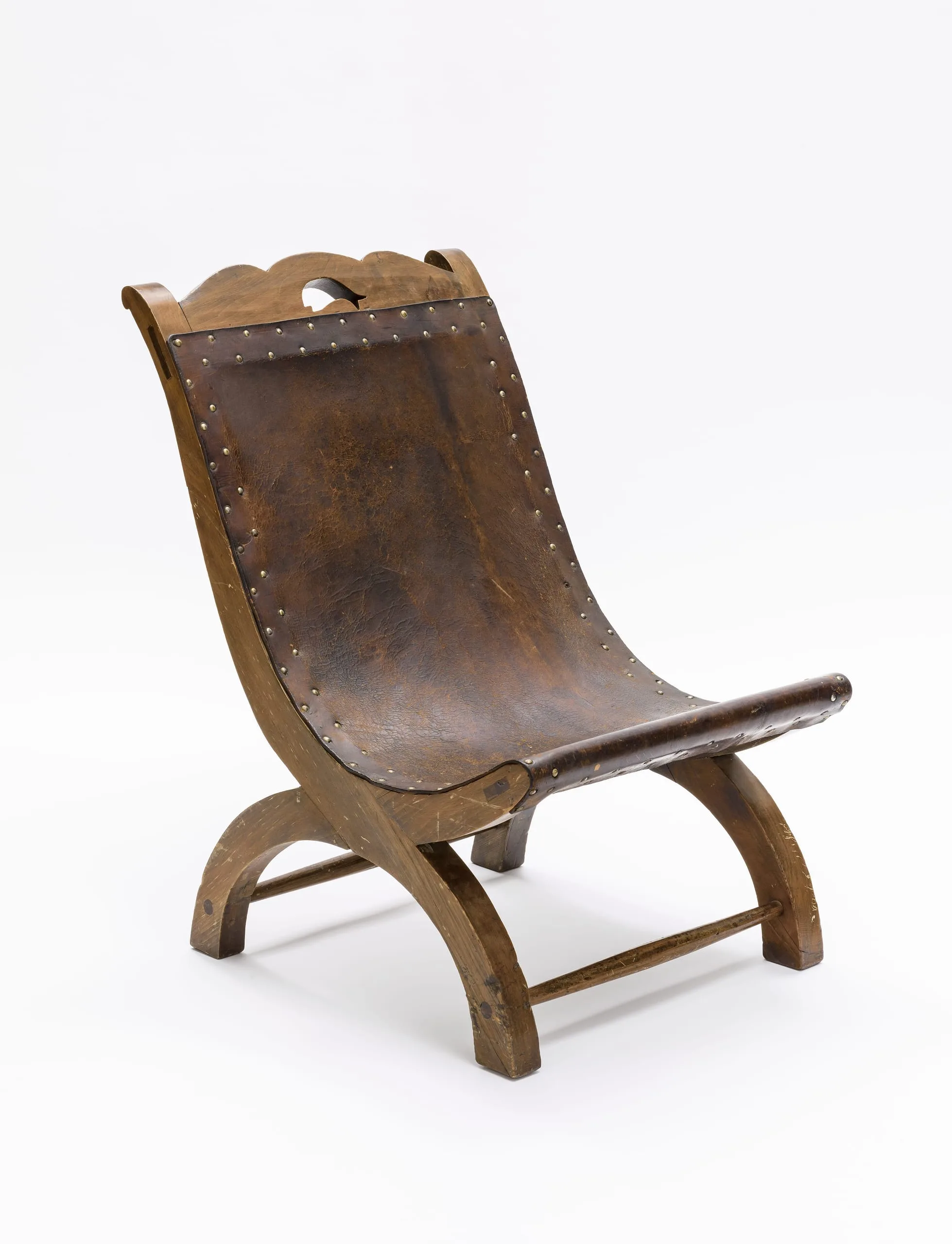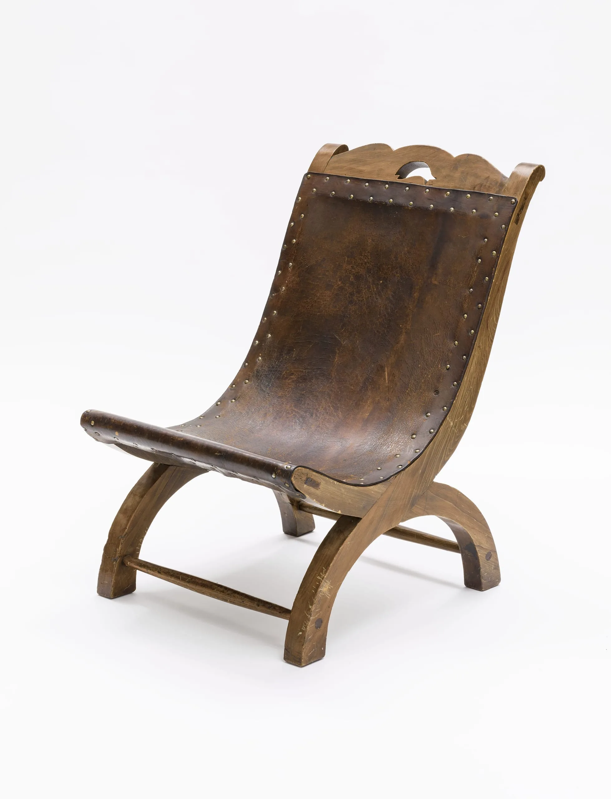 Spratling was one of the first designers to revive the butaca (butaque), a type of ranch-style easy chair with distinctive crossed supports, of which he created several variations. The butaca is a hybrid household object thought to have originated in the Caribbean. Its overall shape and low height probably derive from pre-Columbian ritual seats, while its rigid forms, materials, complex wood joinery, and iron nails, are influenced by Spanish state folding chairs known as sillas de caderas, which arrived in the New World with the early settlers. In Mexico, the butaca became popular in towns of the Yucatan and Veracruz. The chair’s sturdy materials—wood, leather, and brass—were ideal to withstand the harsh coastal environments. In the late eighteenth and early nineteenth centuries, the port of Campeche, in Yucatan, became the most important manufacturing center of the butaca (hence sometimes the chair type is simply referred to as a Campeche chair), many which were exported throughout the Americas.