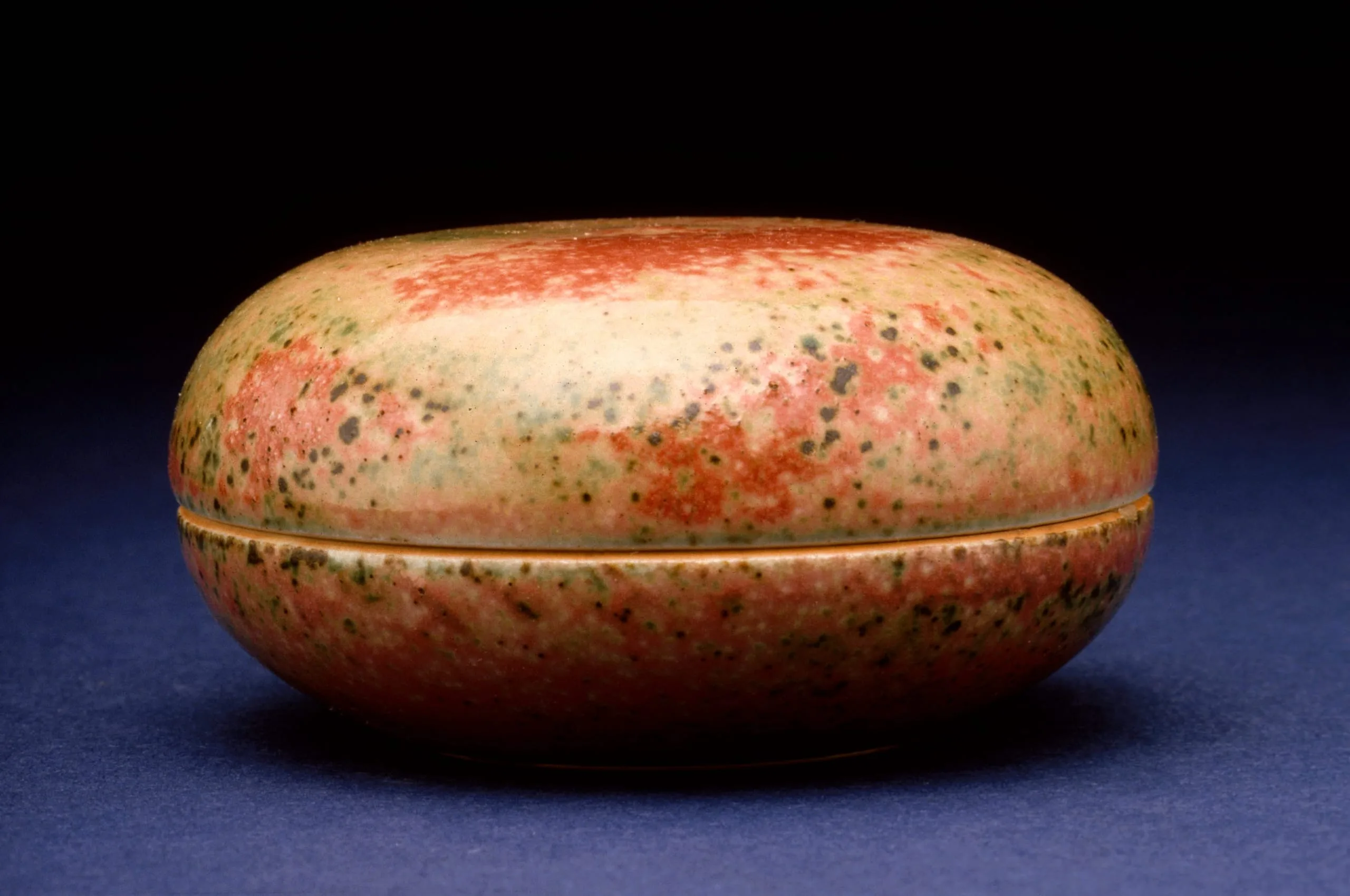 - Wheel-thrown porcelain with peach-bloom glaze