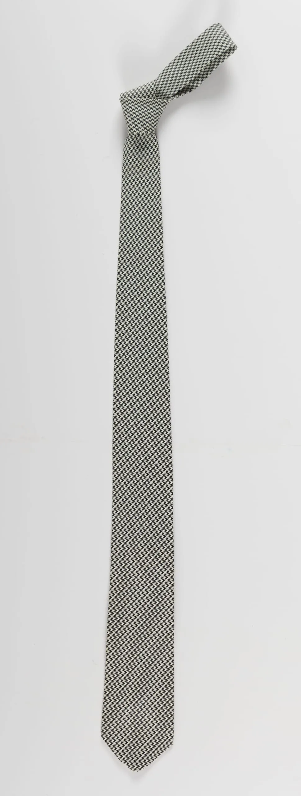Narrow necktie displayed flat, covered in an allover black and white micro-check or houndstooth pattern on a matte textile surface