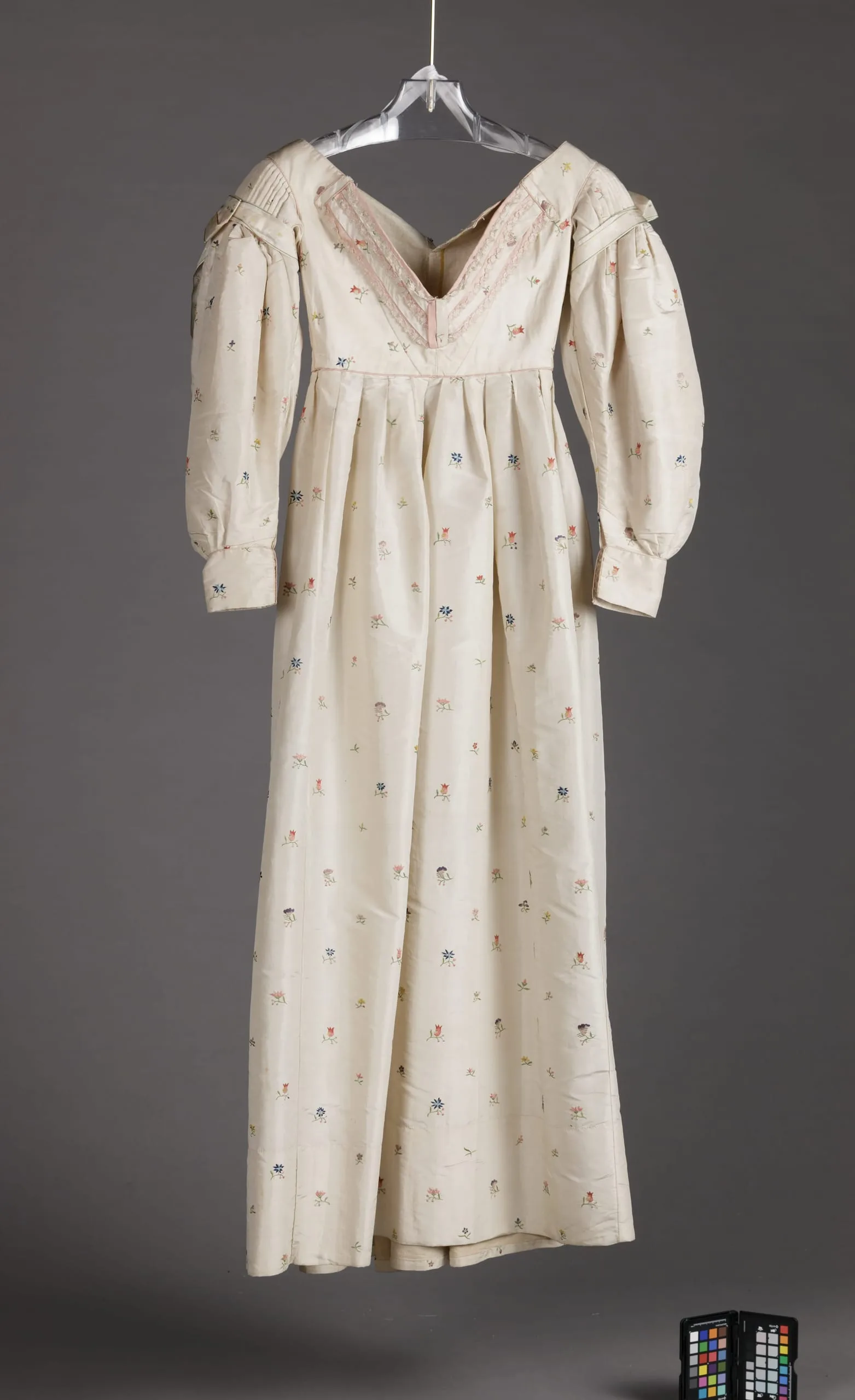 - Silk plain weave (taffeta) with silk embroidery, silk plain weave ribbon with supplementary-warp patterning, and silk blonde lace