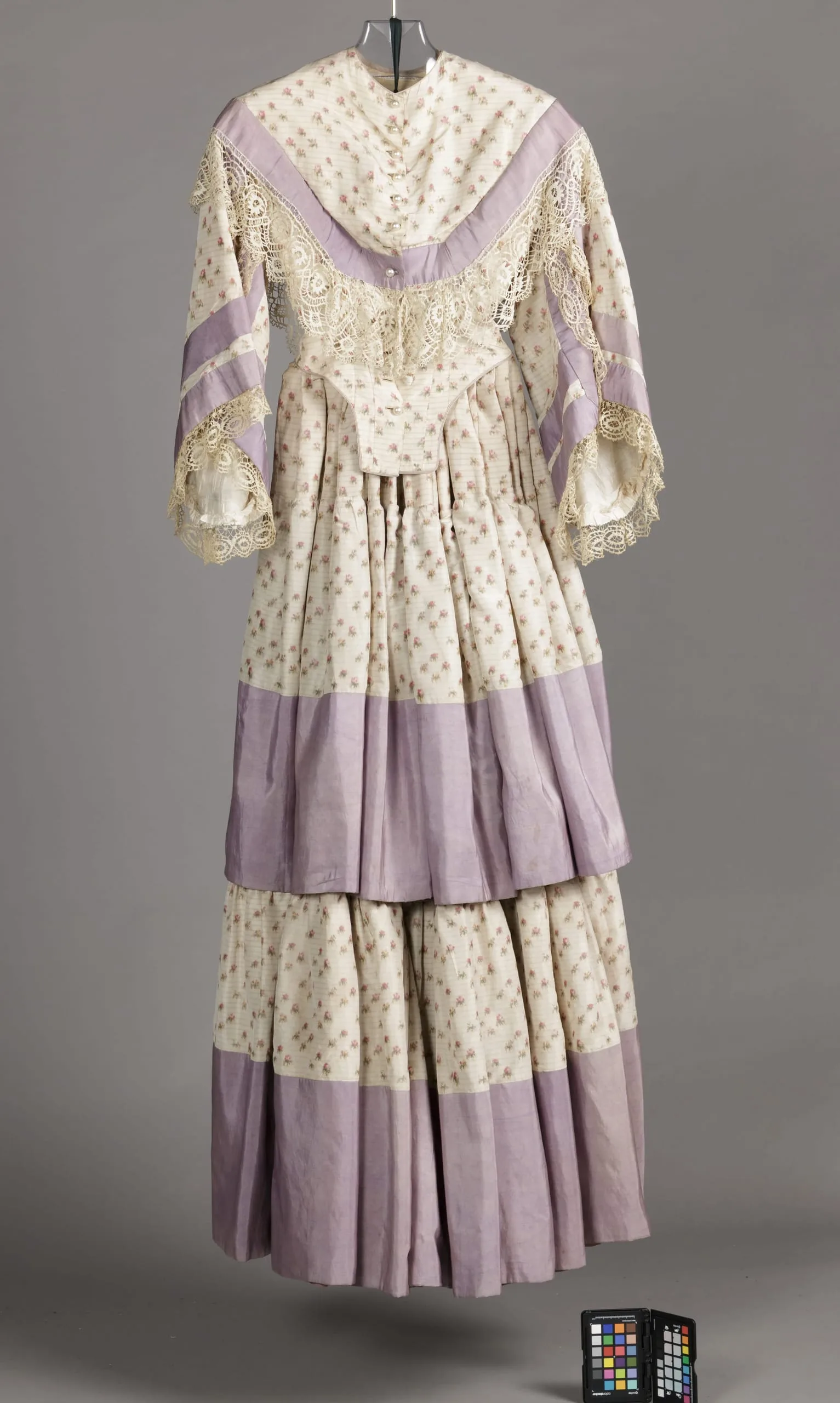 - Bodice: silk plain weave, warp printed (chine taffeta) and silk plain weave (taffeta), with linen lace, silk cord, and glass buttons; Skirt: silk plain weave, warp printed (chine taffeta) and silk plain weave (taffeta); Sleeves: cotton plain weave (organdy) with cotton embroidery and cotton lace