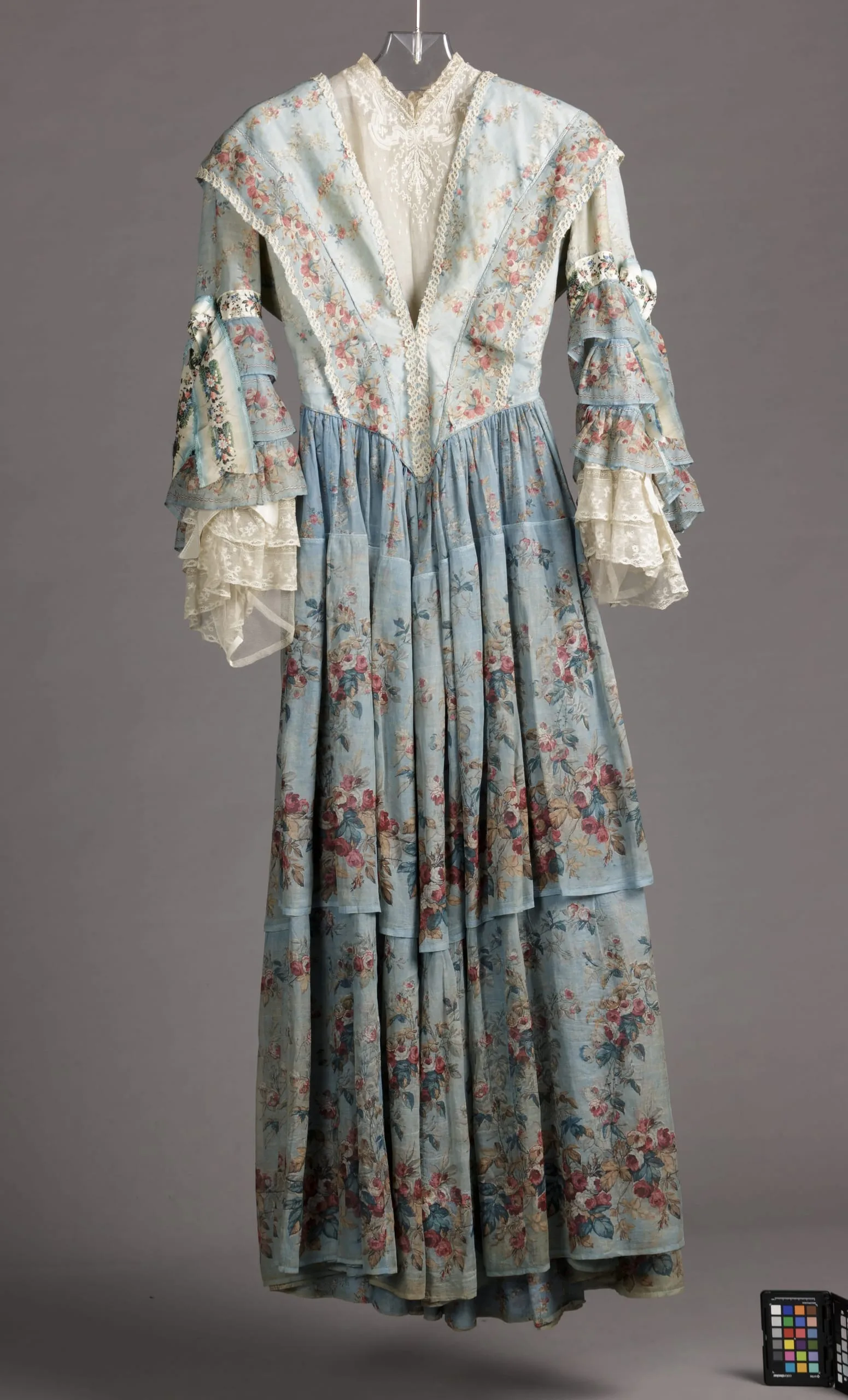 - Dress: cotton plain weave (organdy), printed, with cotton passementerie and silk ribbon trim; Sleeve flounces: linen lace and silk ribbon; Dickey: cotton plain weave (organdy) with cotton thread embroidery and cotton lace trim