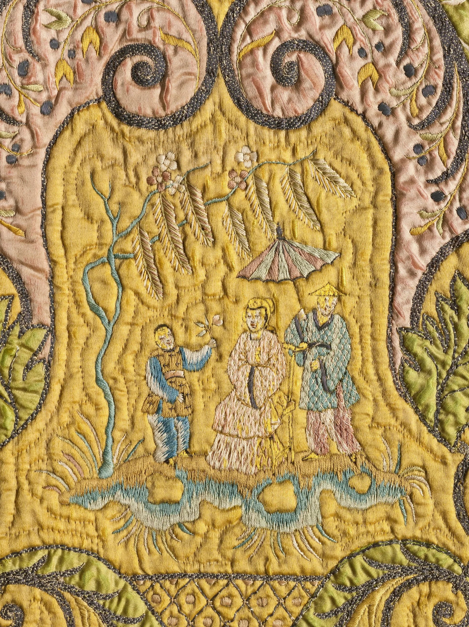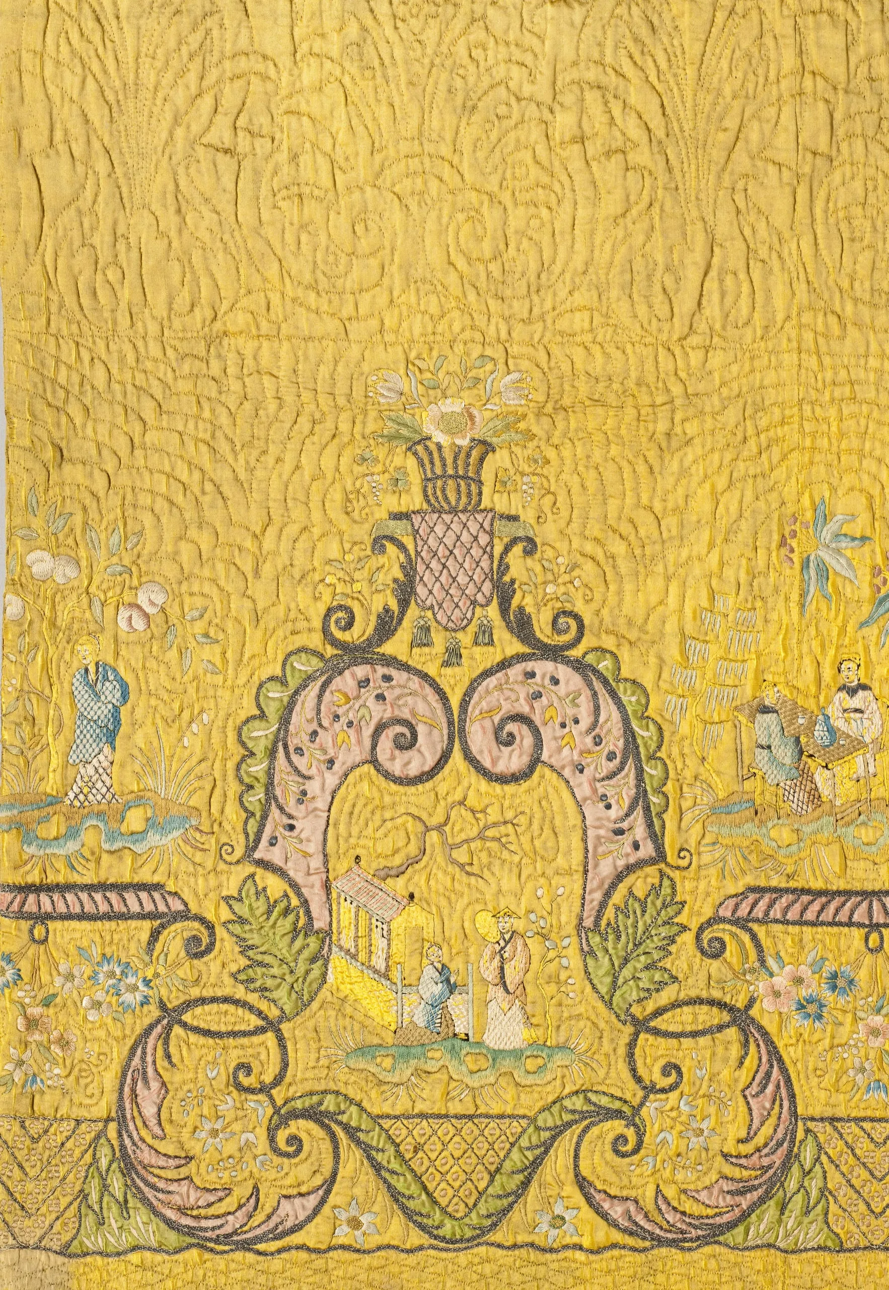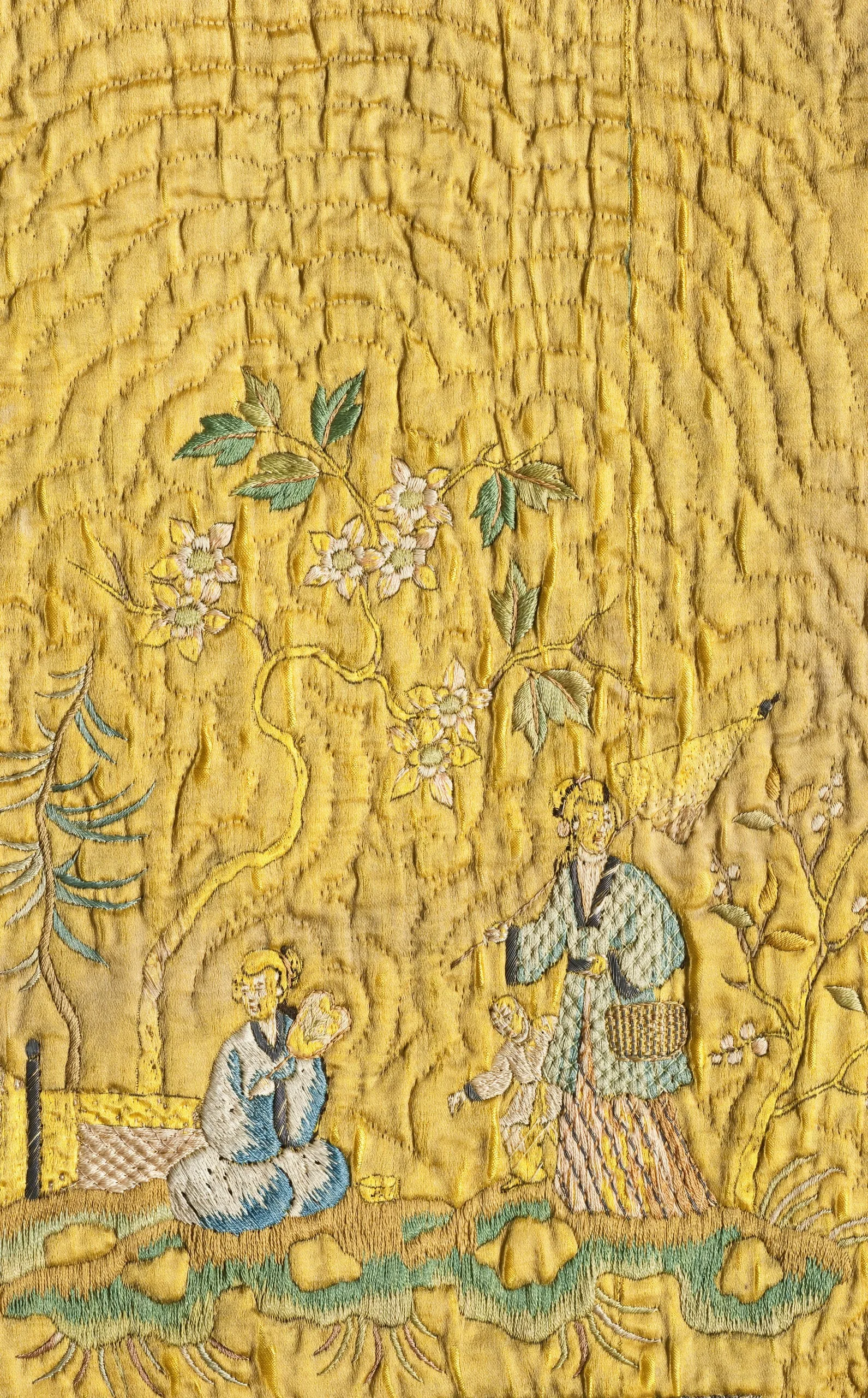 - Silk satin, quilted, with silk and metallic thread embroidery and silk satin appliqués