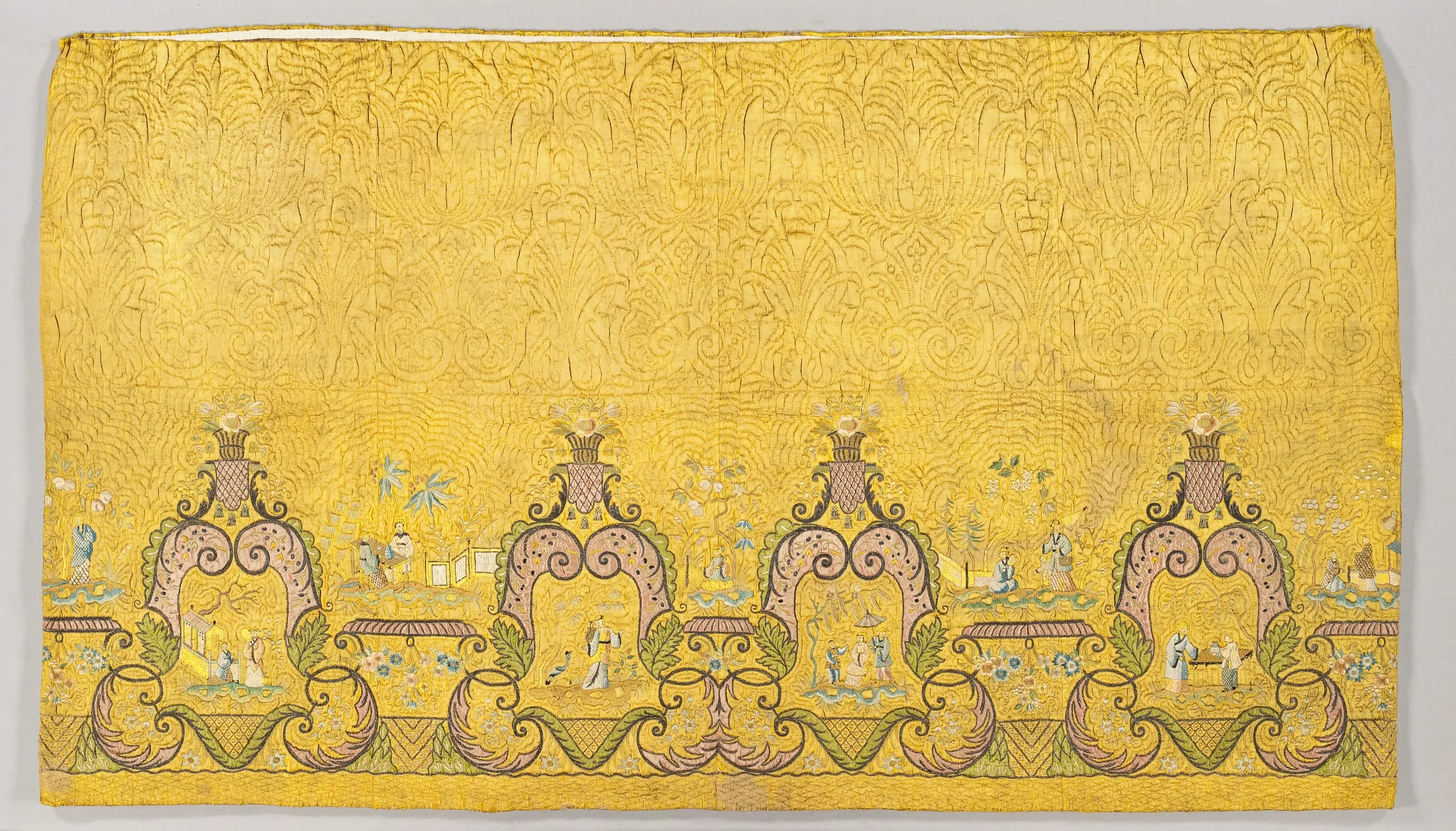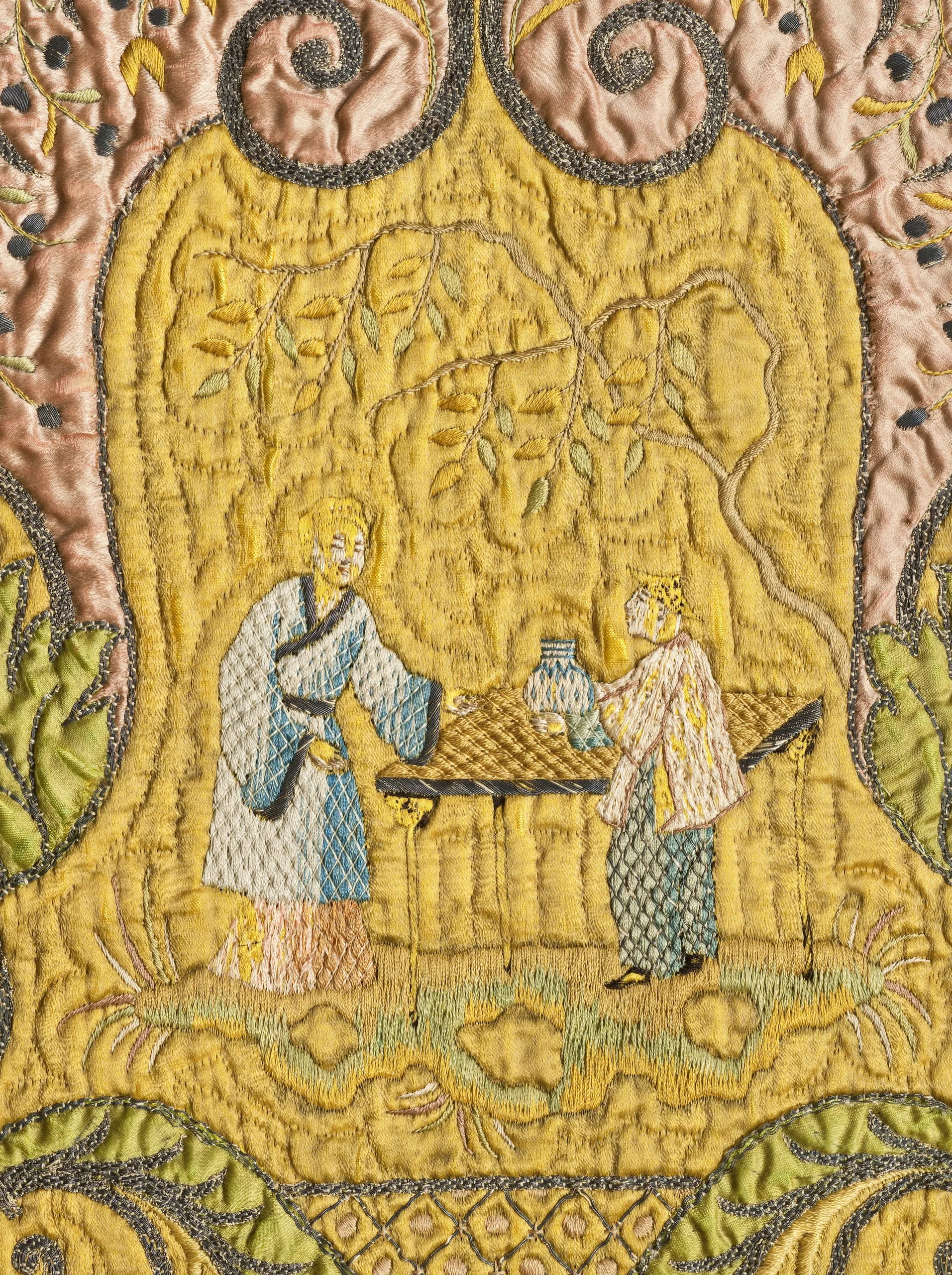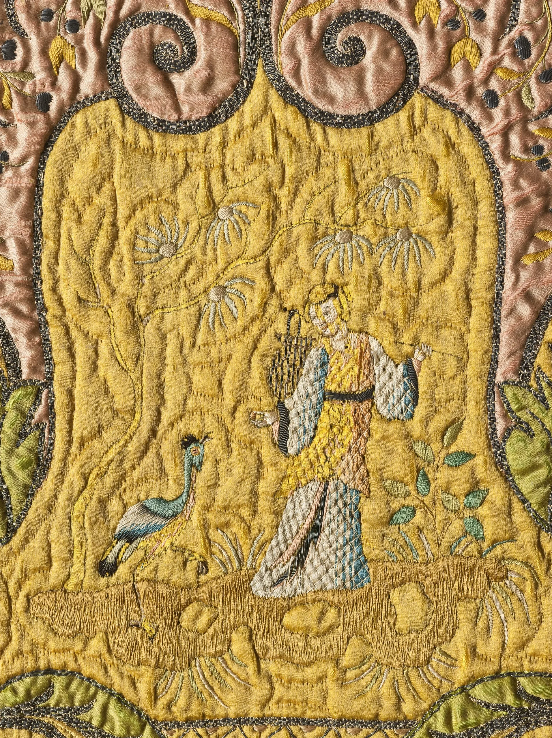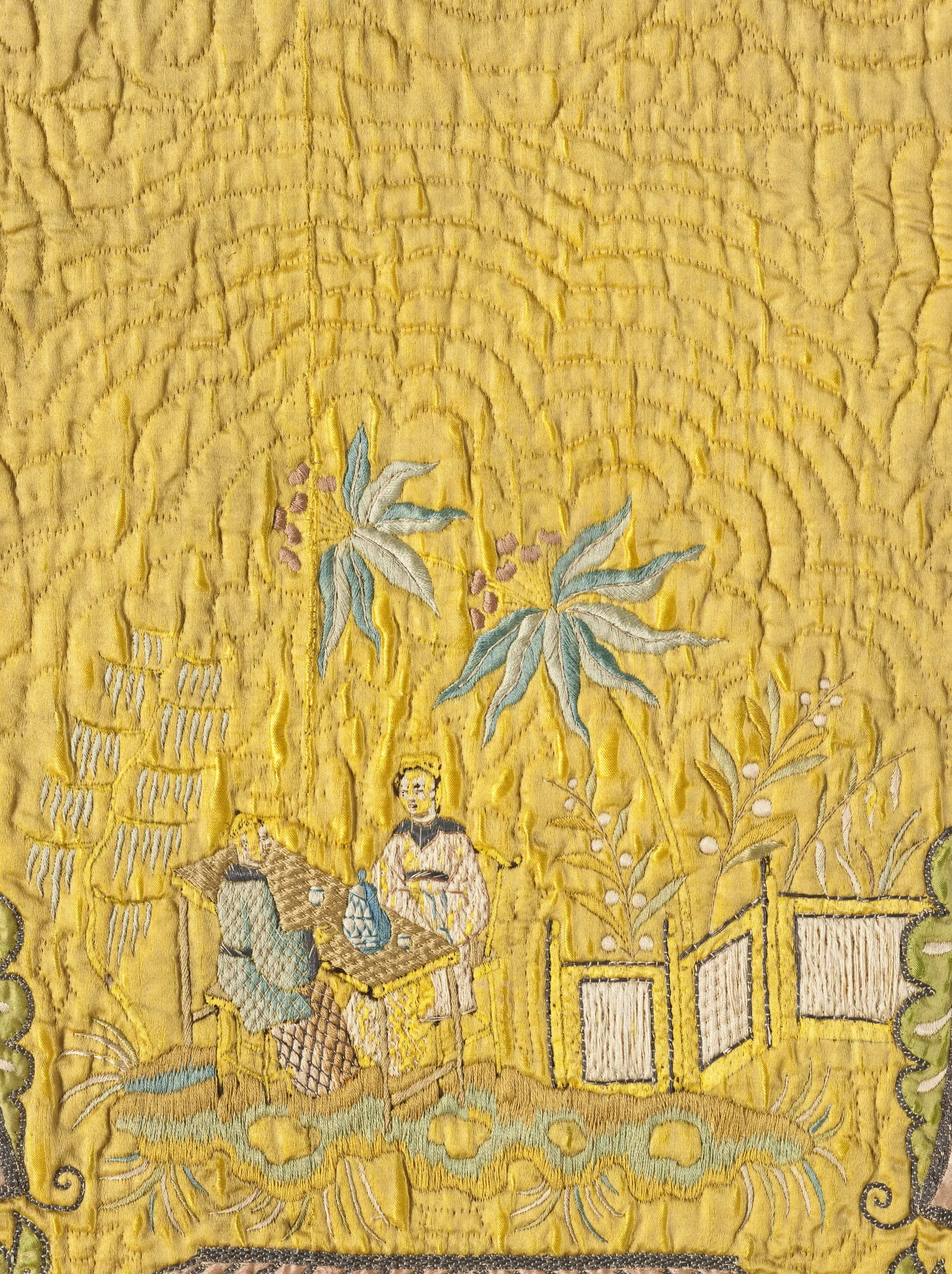 - Silk satin, quilted, with silk and metallic thread embroidery and silk satin appliqués