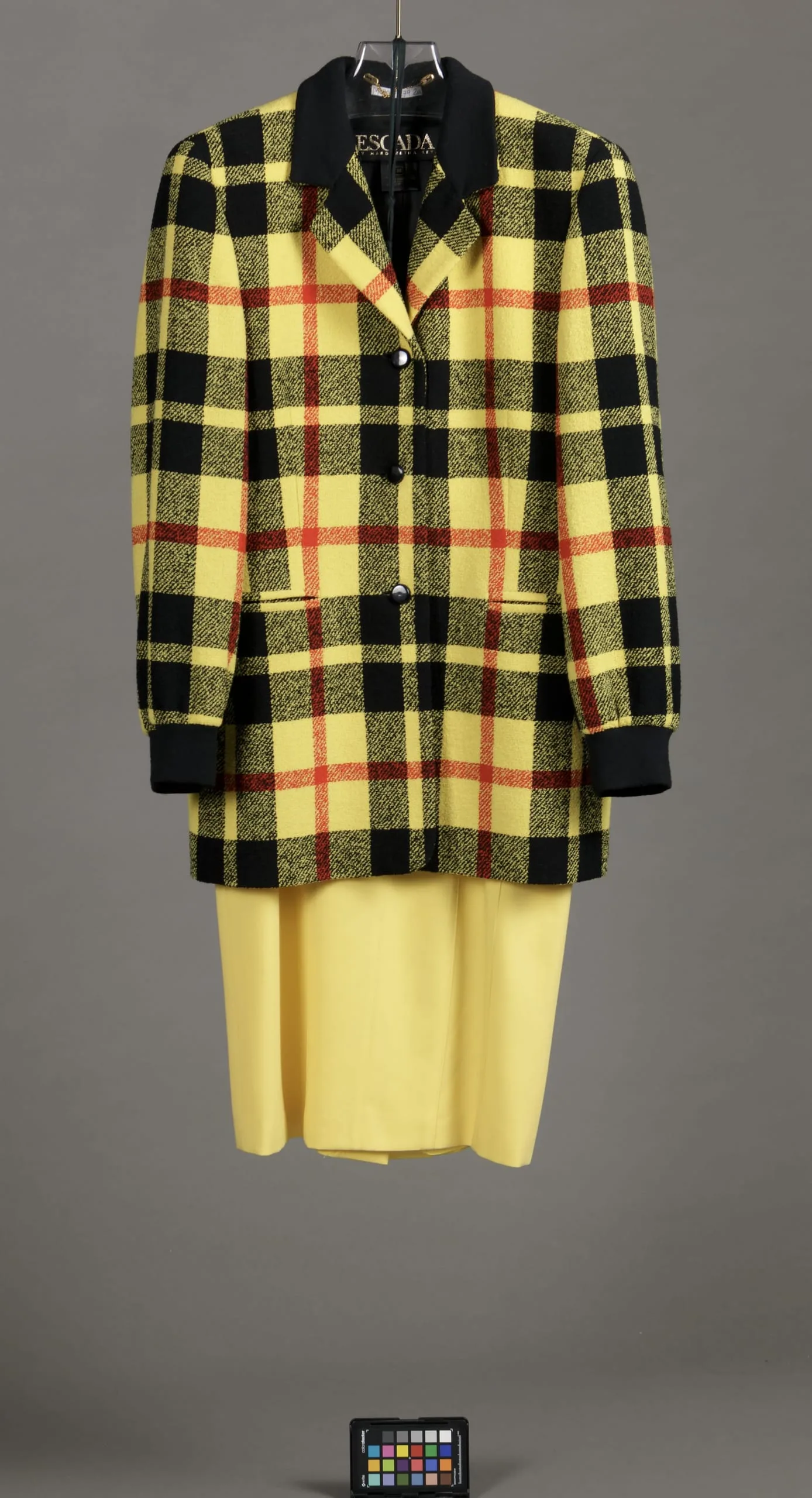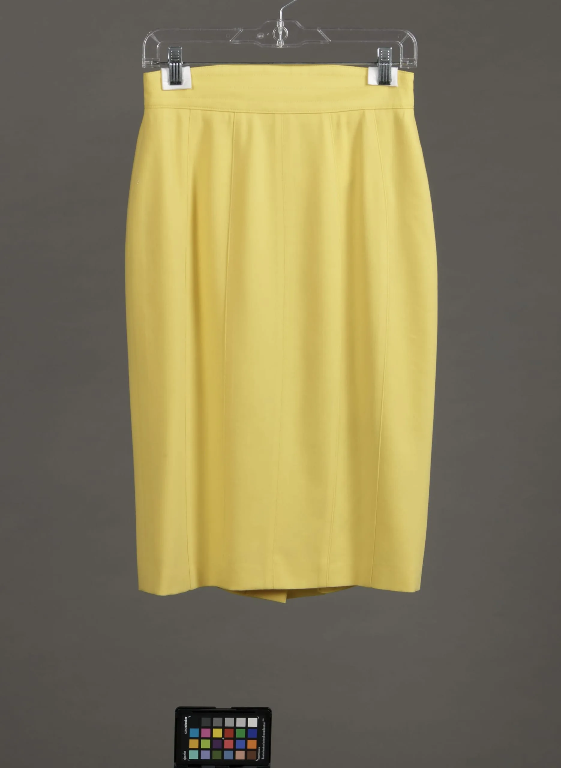- Jacket: wool twill and wool knit; Skirt: wool twill