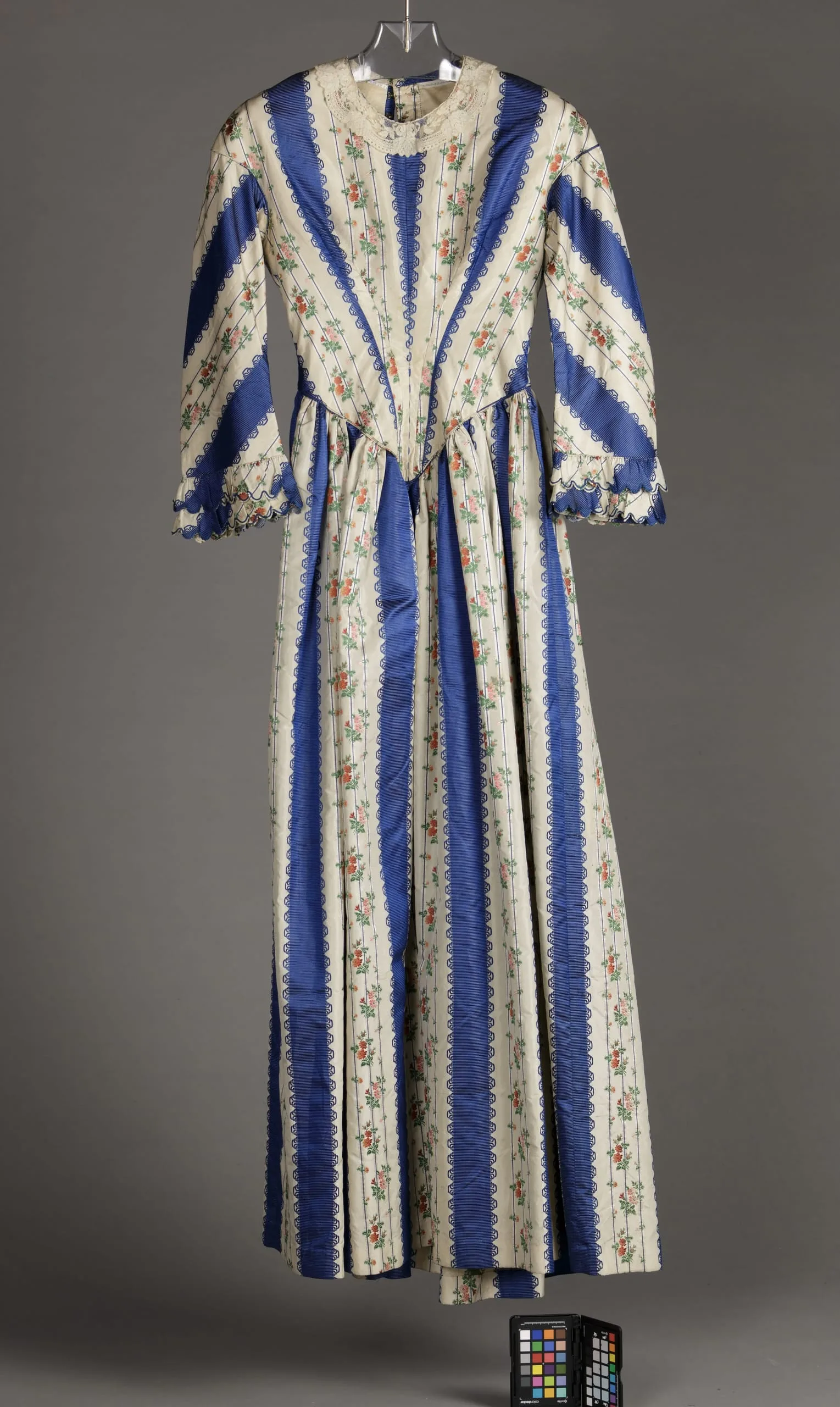 - Silk plain weave (taffeta) with supplementary-warp patterning, silk braid, and linen lace