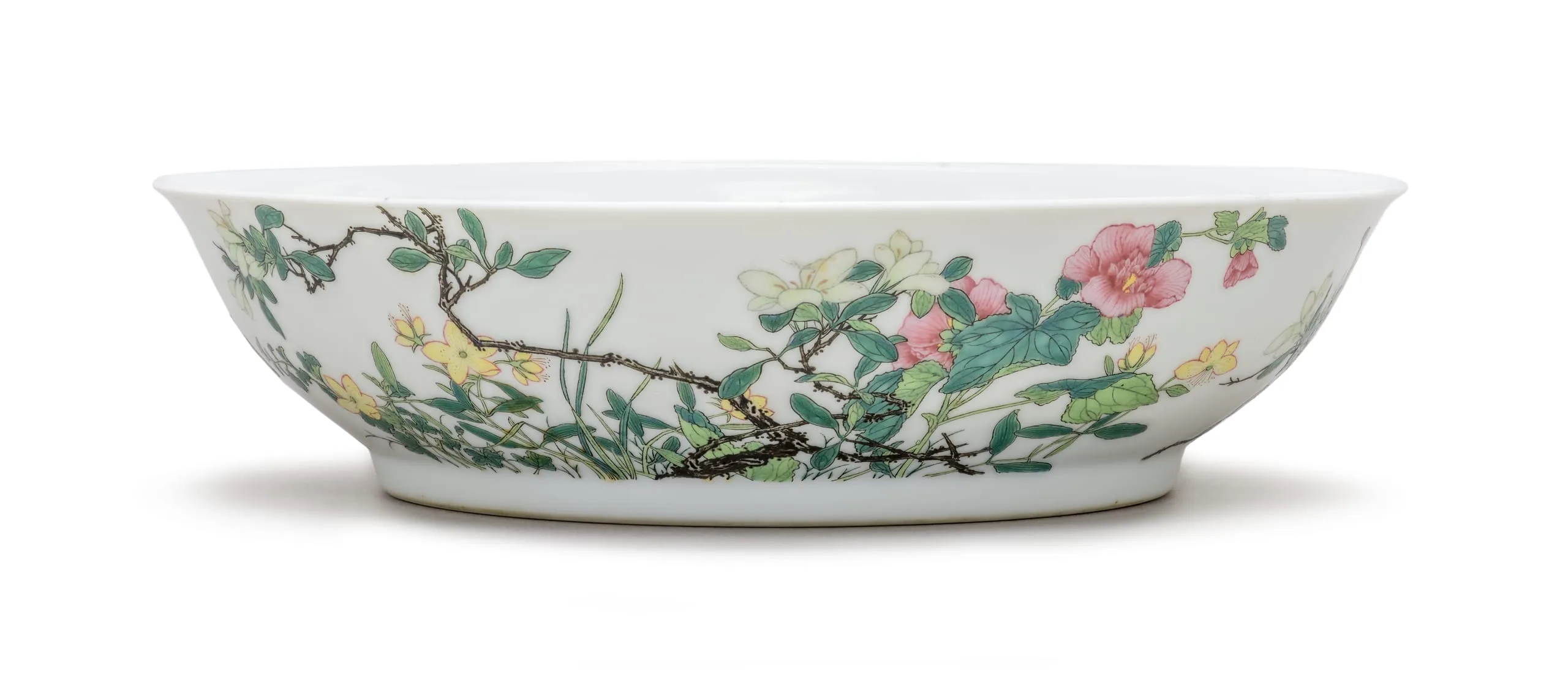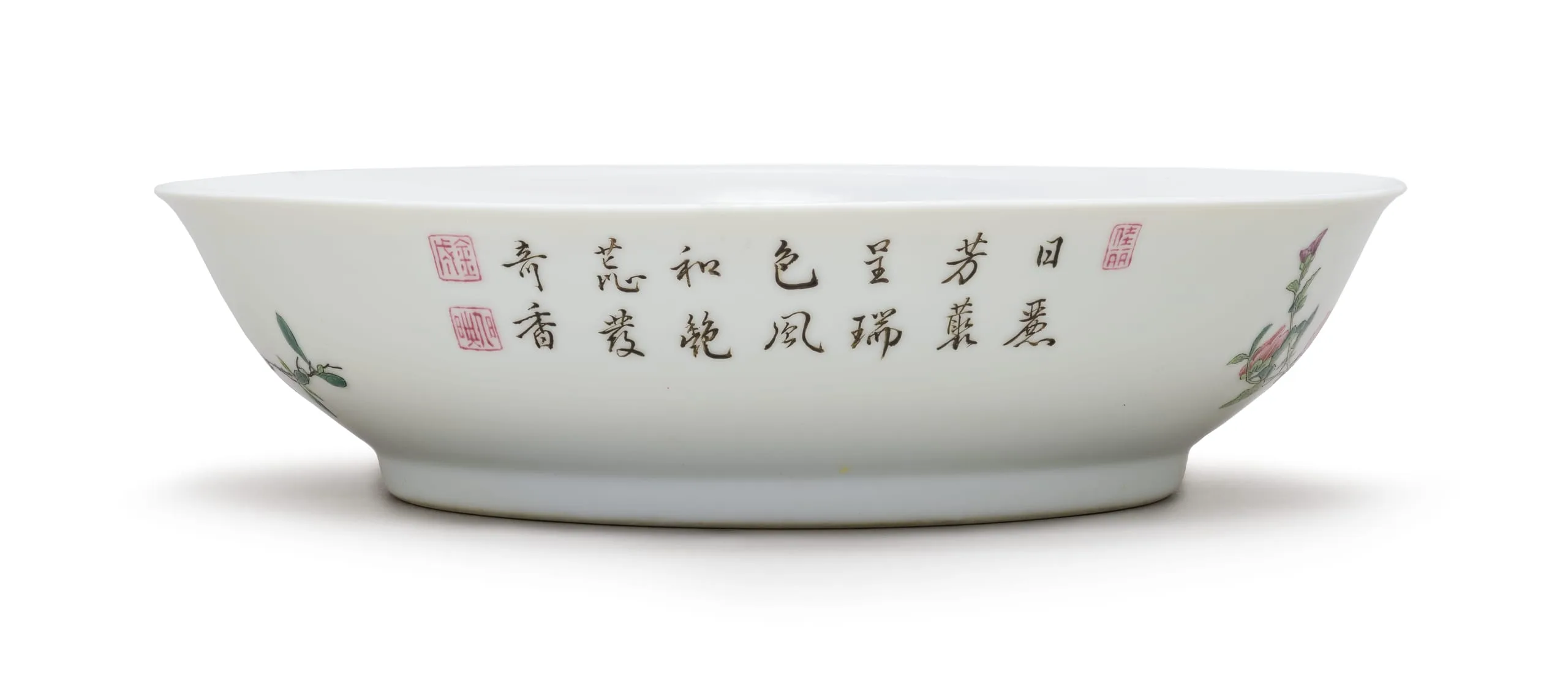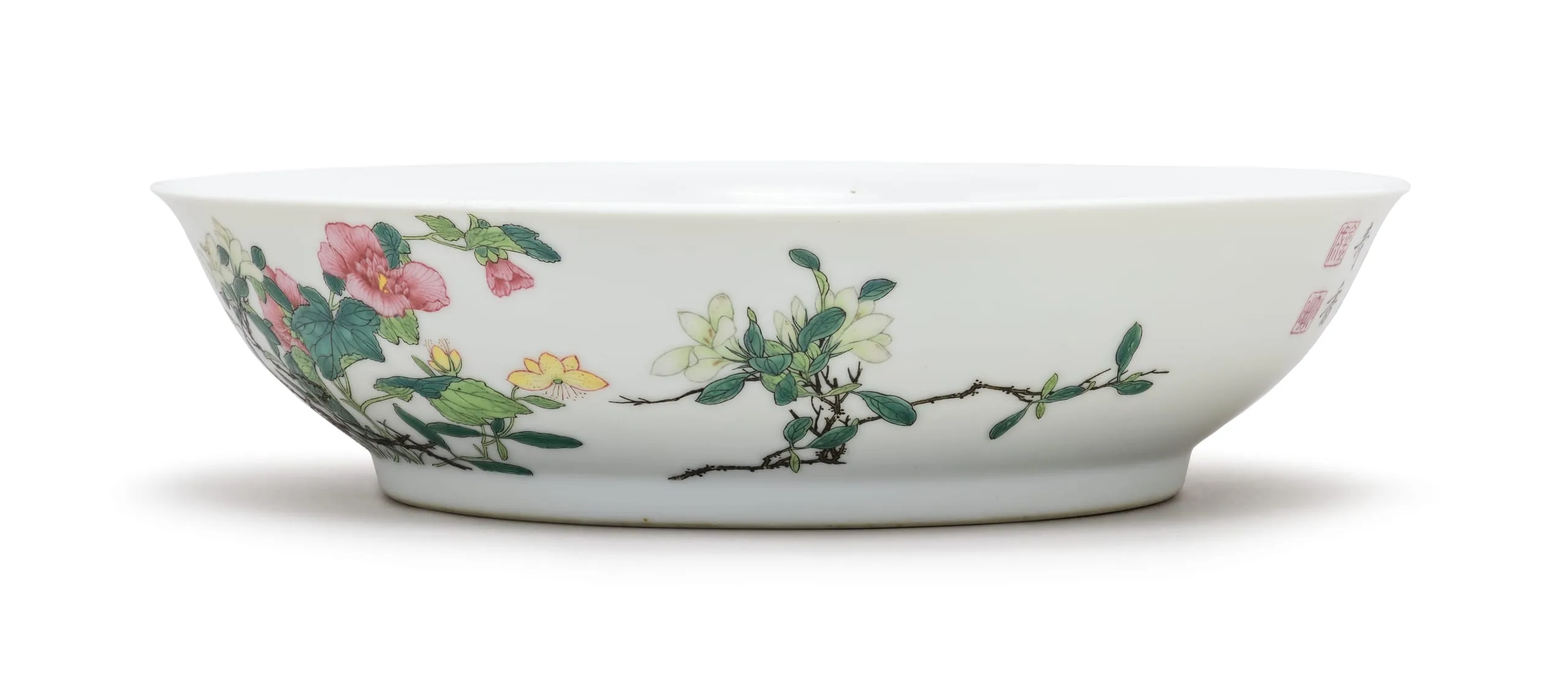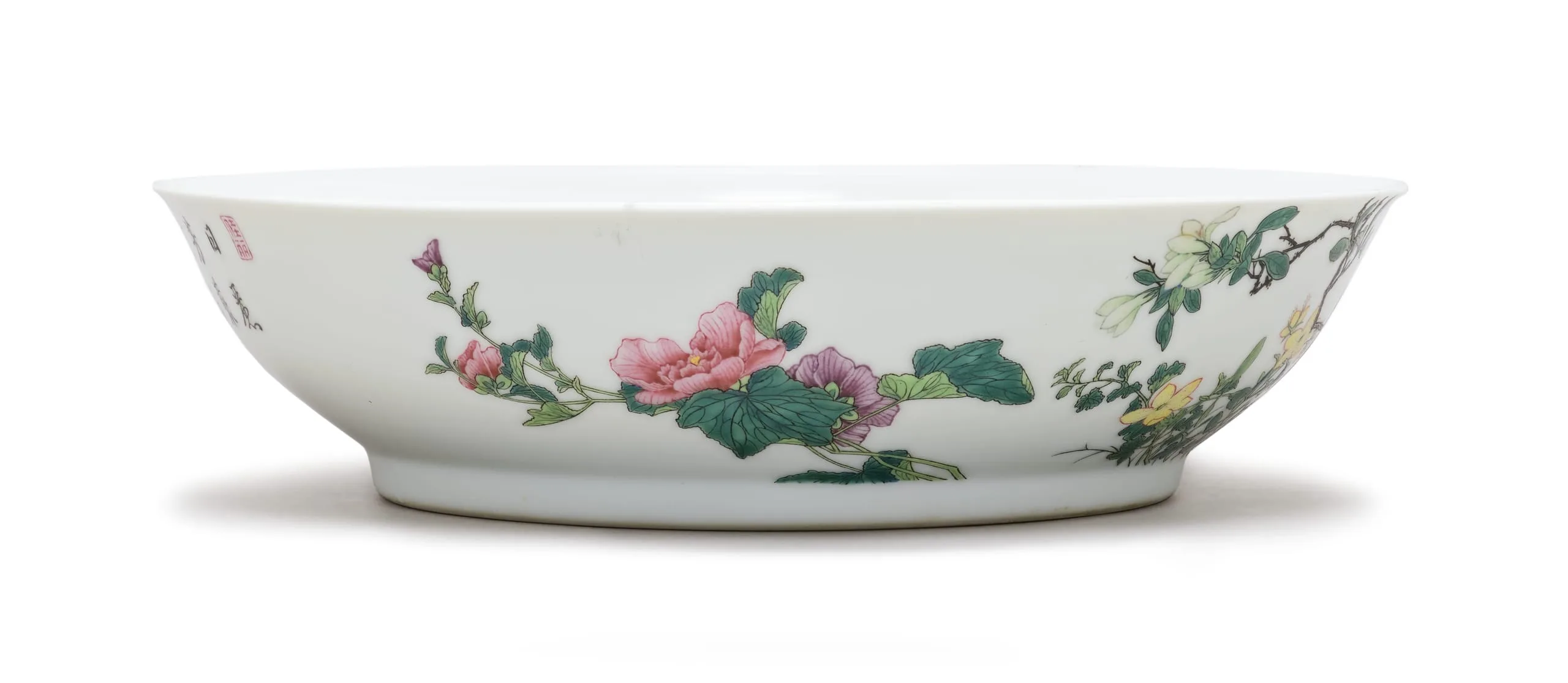 - Wheel-thrown porcelain with clear glaze and overglaze painted enamel decoration (fencai)