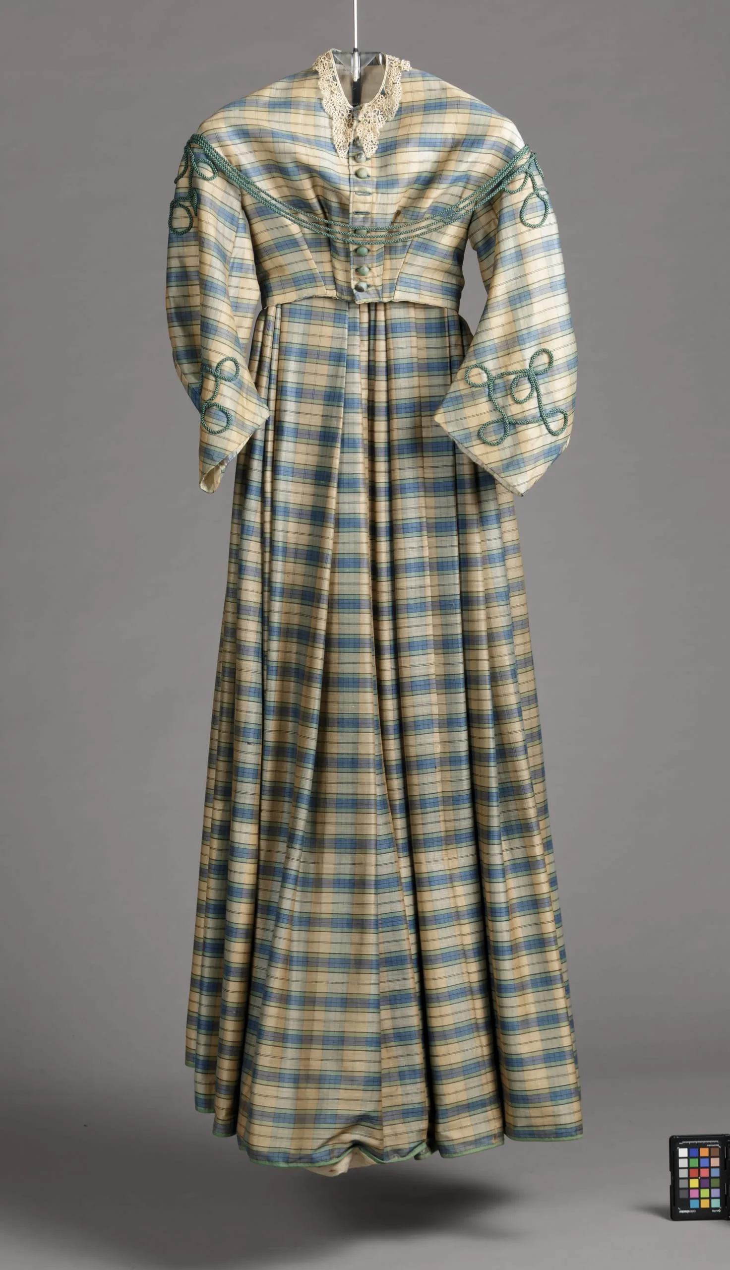 - Bodice: silk warp and wool weft gauze with silk cord and cotton lace trim; Skirt: silk warp and wool weft gauze